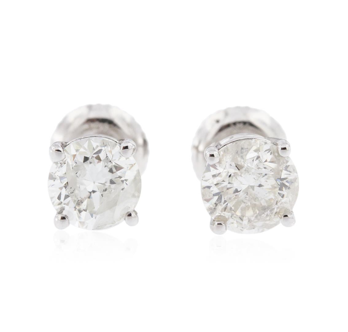One pair electronically tested 14KT white gold ladies cast diamond stud earrings with French screw backs with a bright polish finish. Condition is new. Containing: One prong set round brilliant cut diamond, measuring 5.81 - 5.81 x 3.48mm (depth est.) approximate weight of 0.72ct. Clarity: I-3. Color: H, Cut is Good. One prong set round brilliant cut diamond, measuring 6.11 - 6.02 x 3.65mm (depth est.) approximate weight of 0.82ct. Clarity: I-3. Color: H, Cut is Good. All diamonds are graded in the mounting, unless otherwise stated. Total Weight of Diamonds 1.54ct. Total Weight of Stud Earrings 1.30 grams. GGL Appraised at $4,070.00.