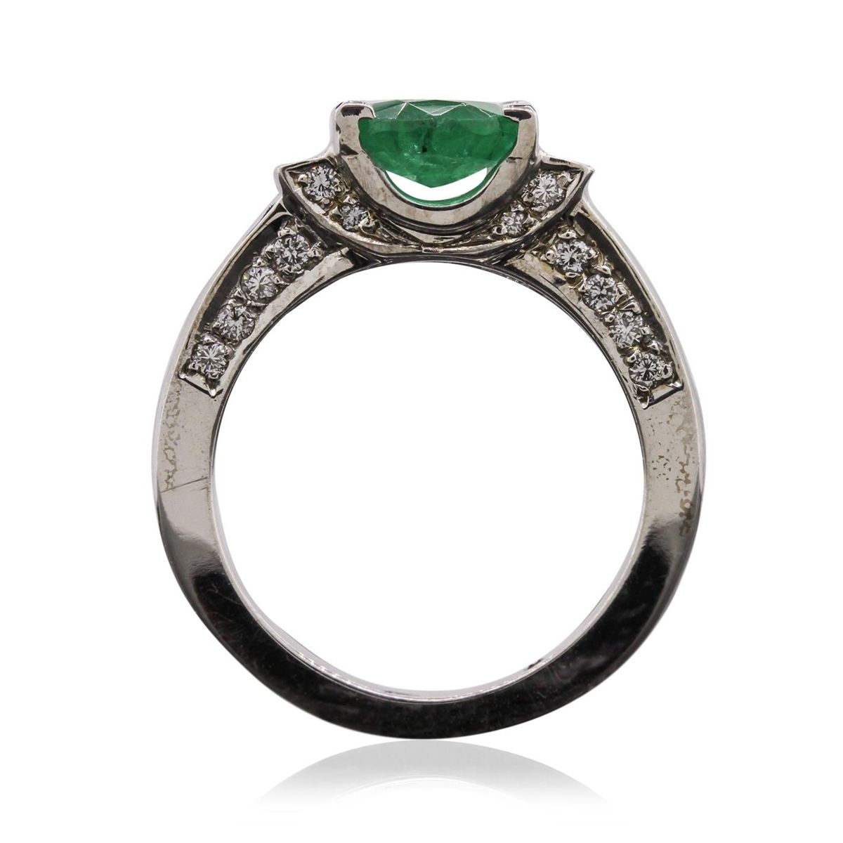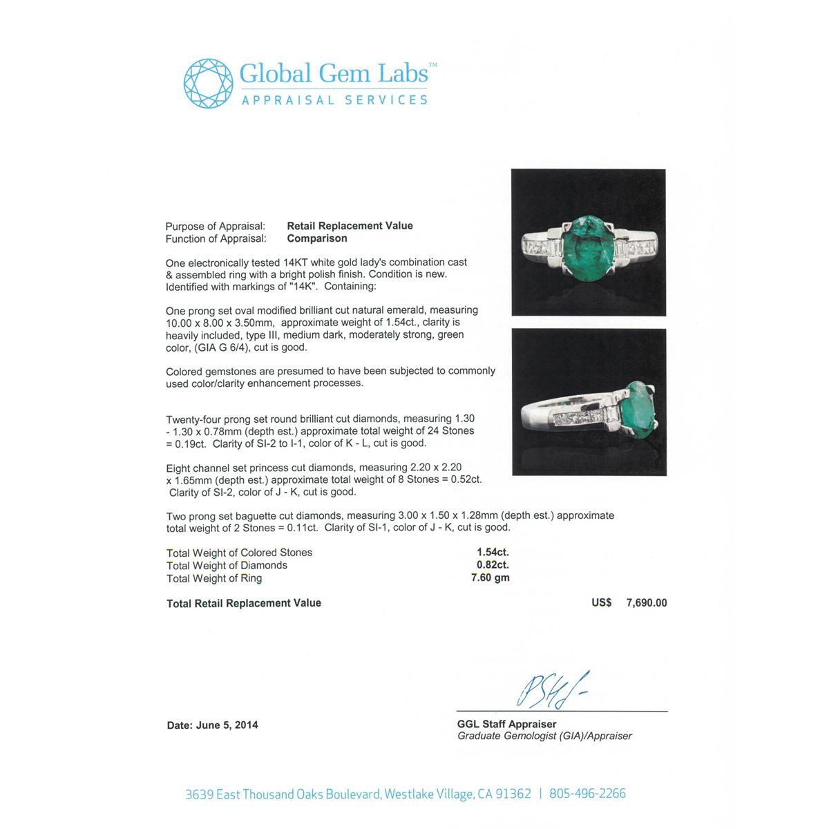 One electronically tested 14KT white gold Ladies combination cast & assembled ring with a bright polish finish. Condition is new. Identified with markings of "14K". Containing: One prong set oval modified brilliant cut natural emerald, measuring 10.00 x 8.00 x 3.50mm, approximate weight of 1.54ct., clarity is heavily included, type III, medium dark, moderately strong, green color, (GIA G 6/4), cut is good. Colored gemstones are presumed to have been subjected to commonly used color/clarity enhancement processes. Twenty-Four prong set round brilliant cut diamonds, measuring 1.30 - 1.30 x 0.78mm (depth est.) approximate. Total Weight of 24 Stones = 0.19ct. Clarity: SI-2 to I-1. Color: K - L, Cut is Good. Eight channel set princess cut diamonds, measuring 2.20 x 2.20 x 1.65mm (depth est.) approximate. Total Weight of 8 Stones = 0.52ct. Clarity: SI-2. Color: J - K, Cut is Good. Two prong set baguette cut diamonds, measuring 3.00 x 1.50 x 1.28mm (depth est.) approximate. Total Weight of 2 Stones = 0.11ct. Clarity: SI-1. Color: J - K, Cut is Good. Total Weight of Colored Stones 1.54ct. Total Weight of Diamonds 0.82ct. Total Weight of Ring 7.60 grams. GGL Appraised at $7,690.00.