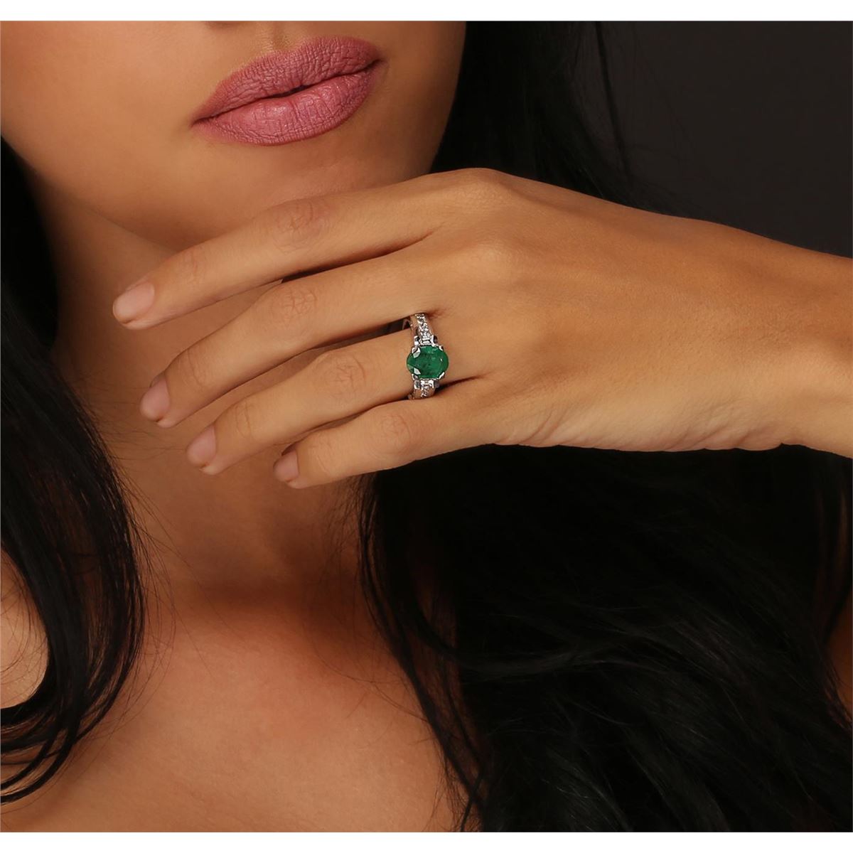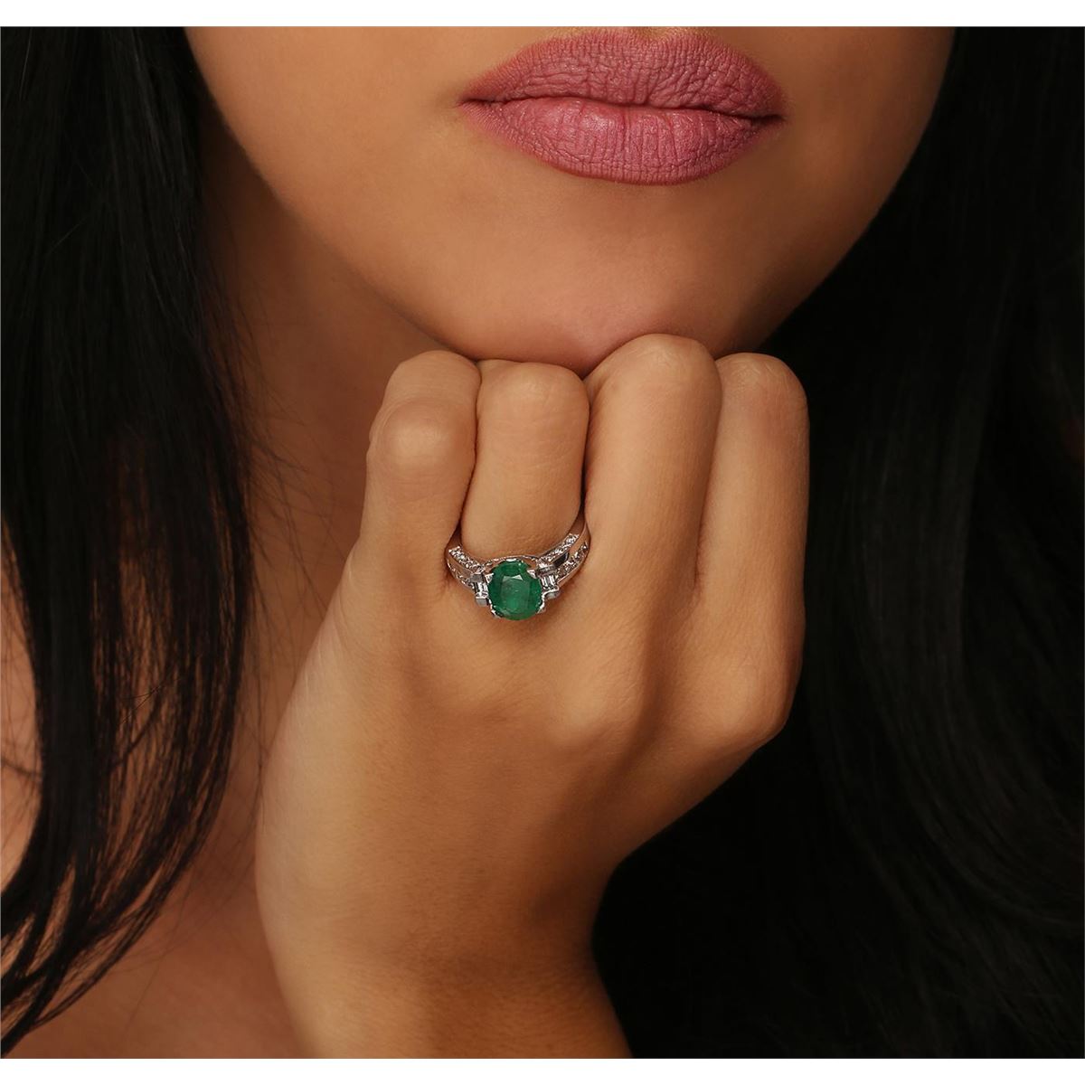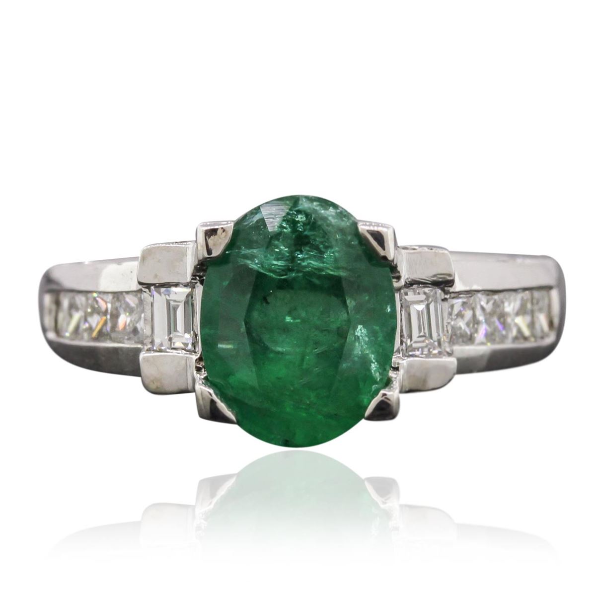 One electronically tested 14KT white gold Ladies combination cast & assembled ring with a bright polish finish. Condition is new. Identified with markings of "14K". Containing: One prong set oval modified brilliant cut natural emerald, measuring 10.00 x 8.00 x 3.50mm, approximate weight of 1.54ct., clarity is heavily included, type III, medium dark, moderately strong, green color, (GIA G 6/4), cut is good. Colored gemstones are presumed to have been subjected to commonly used color/clarity enhancement processes. Twenty-Four prong set round brilliant cut diamonds, measuring 1.30 - 1.30 x 0.78mm (depth est.) approximate. Total Weight of 24 Stones = 0.19ct. Clarity: SI-2 to I-1. Color: K - L, Cut is Good. Eight channel set princess cut diamonds, measuring 2.20 x 2.20 x 1.65mm (depth est.) approximate. Total Weight of 8 Stones = 0.52ct. Clarity: SI-2. Color: J - K, Cut is Good. Two prong set baguette cut diamonds, measuring 3.00 x 1.50 x 1.28mm (depth est.) approximate. Total Weight of 2 Stones = 0.11ct. Clarity: SI-1. Color: J - K, Cut is Good. Total Weight of Colored Stones 1.54ct. Total Weight of Diamonds 0.82ct. Total Weight of Ring 7.60 grams. GGL Appraised at $7,690.00.