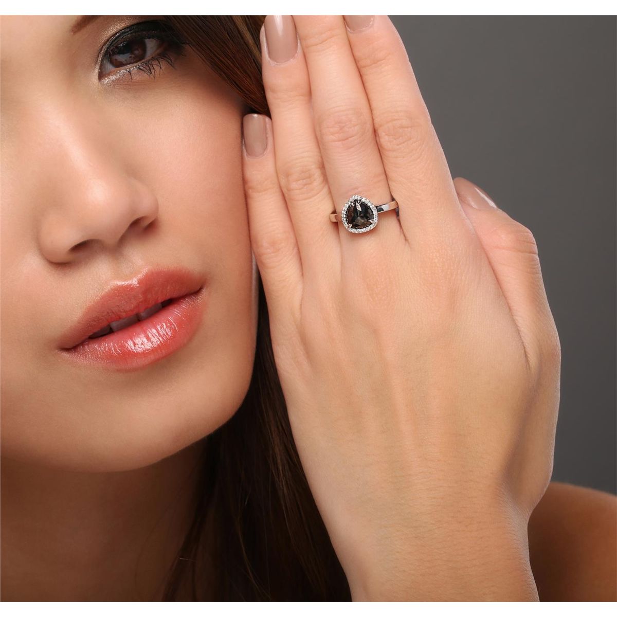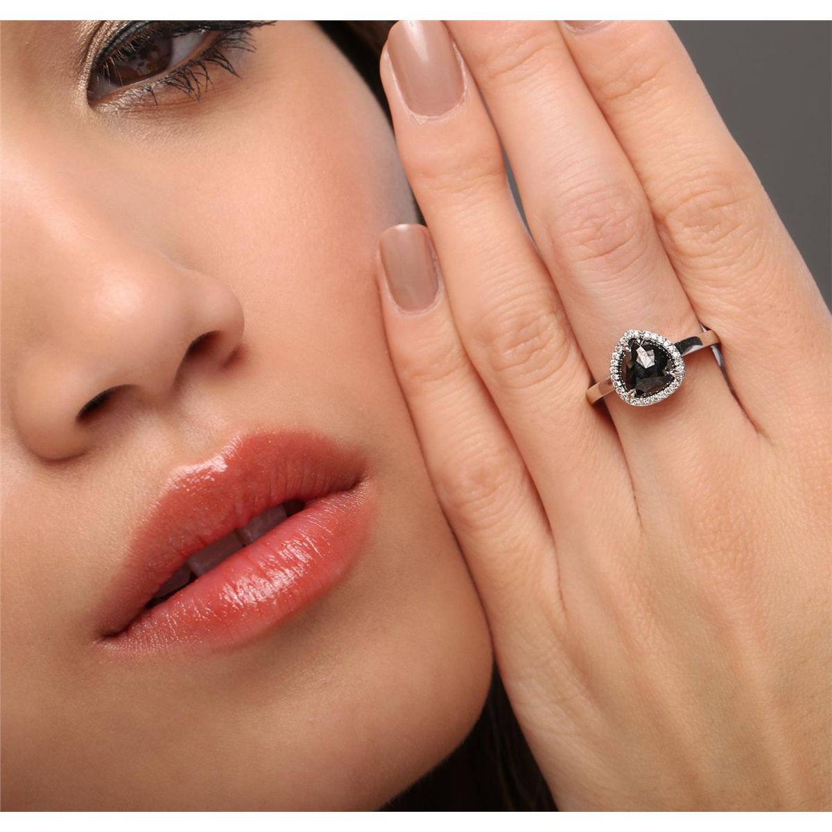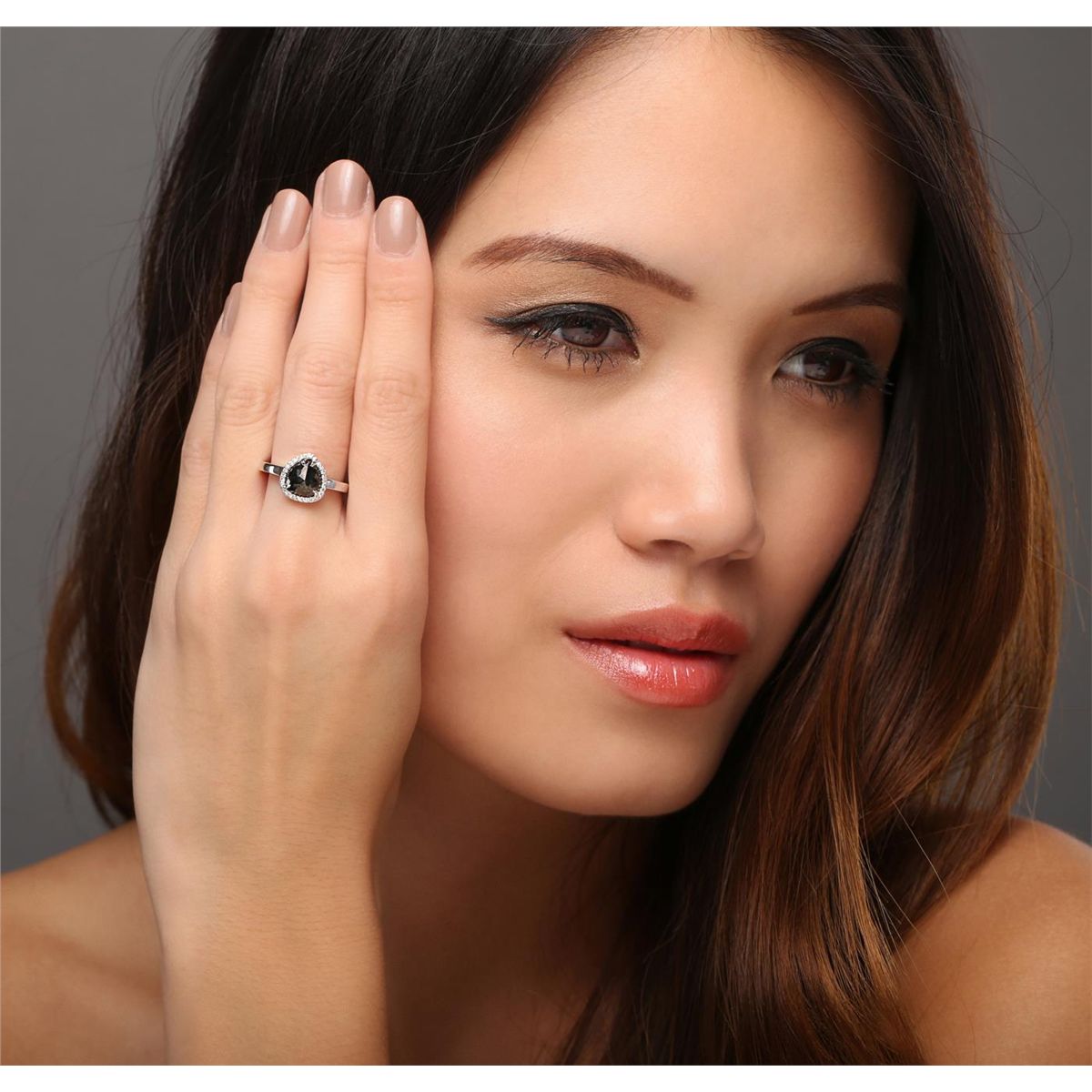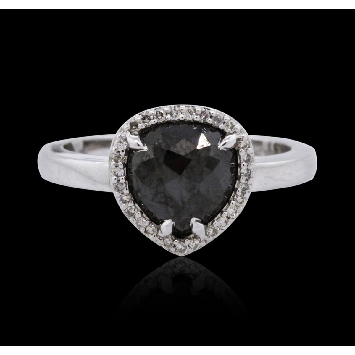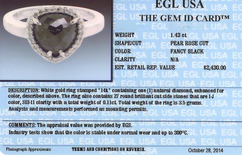 One white gold ring stamped 14k containing one natural pear rose cut fancy black diamond, enhanced for color, with a total weight of 1.43ct. The ring also contains 27 round brilliant cut side stones that are I-J color, SI3-I1 clarity with a total weight of 0.11ct. Total weight of the ring is 3.50 grams. EGL Appraised at $2,430.00.