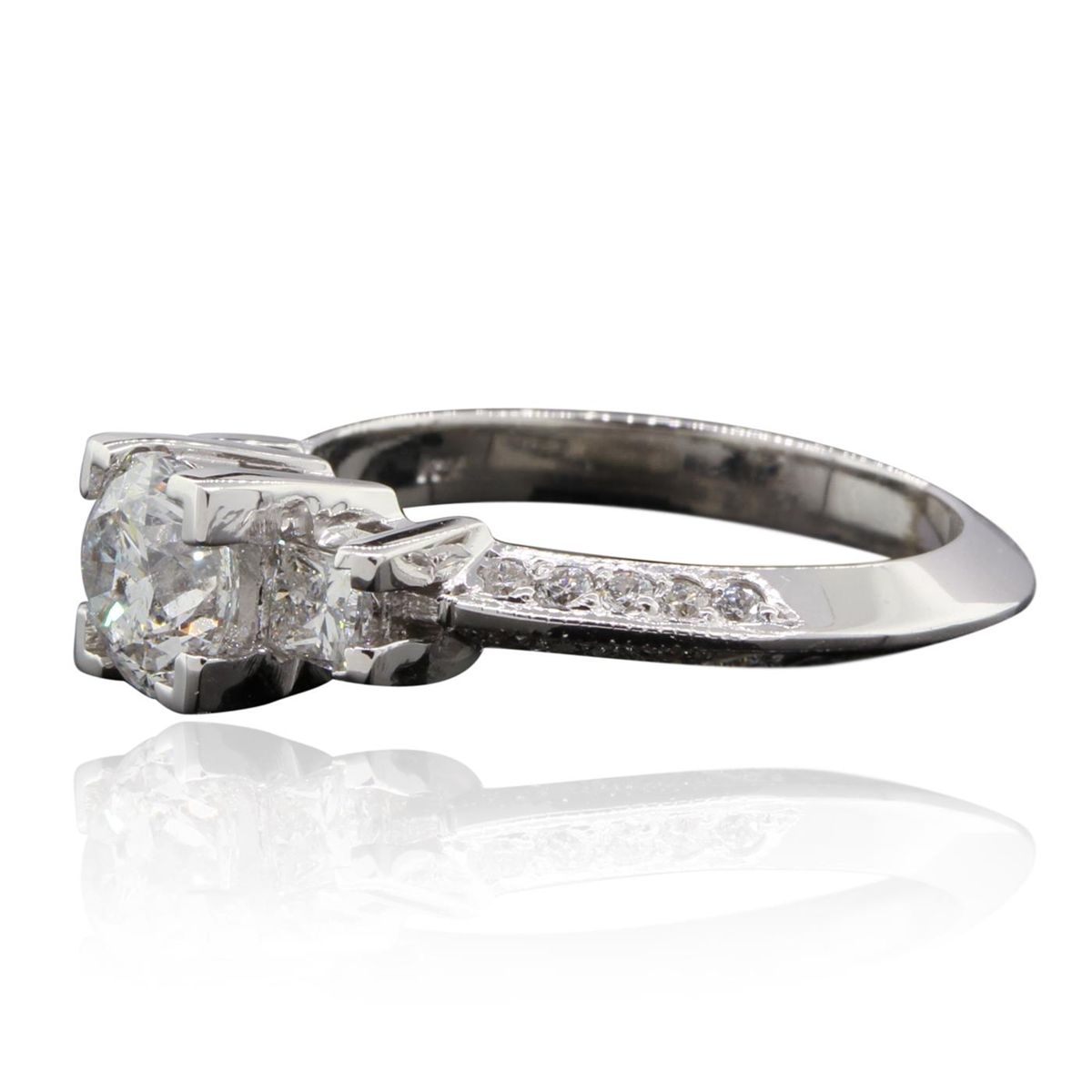 One electronically tested 14KT white gold Ladies combination cast & assembled engagement ring with a bright polish finish. Identified with markings of "14K". Condition is excellent. Containing: One prong set round brilliant cut diamond, measuring 6.30 - 6.30 x 4.00mm (depth est.) approximate weight of 1.04ct. Clarity of I-2, Color of G, Cut is Good. Two prong set princess cut diamonds, measuring 2.60 x 2.60 x 1.95mm (depth est.) approximate total weight of 2 Stones = 0.22ct. Clarity of VS-1, Color of I - J, Cut is Good. Twenty bead set round brilliant cut diamonds, measuring 1.30 - 1.30 x 0.78mm (depth est.) approximate total weight of 20 Stones = 0.28ct. Clarity of VS-1 to VS-2, Color of G - H, Cut is Very Good. Total Weight of Diamonds 1.54ct. Total Weight of Ring 4.10gm. GGL Appraised at $12,810.00.
