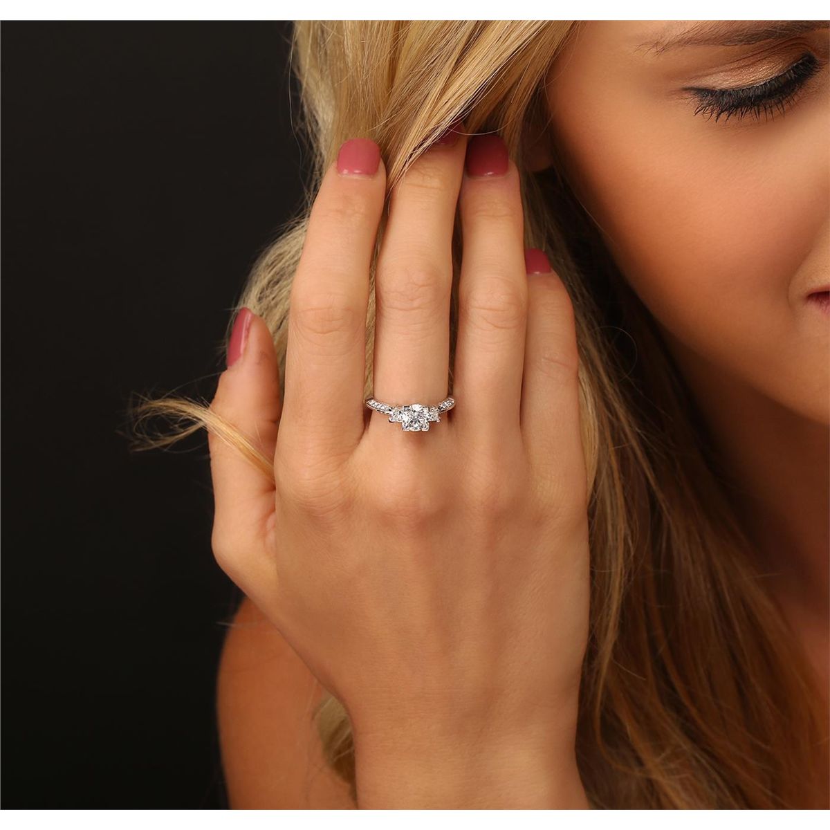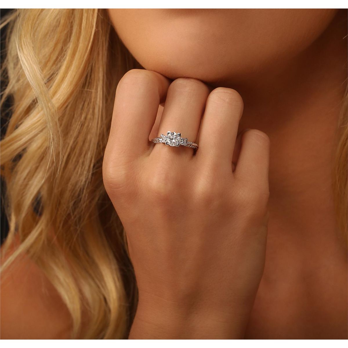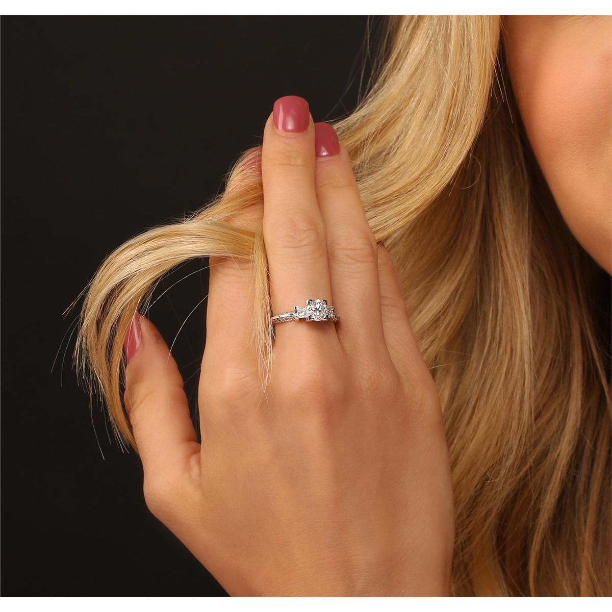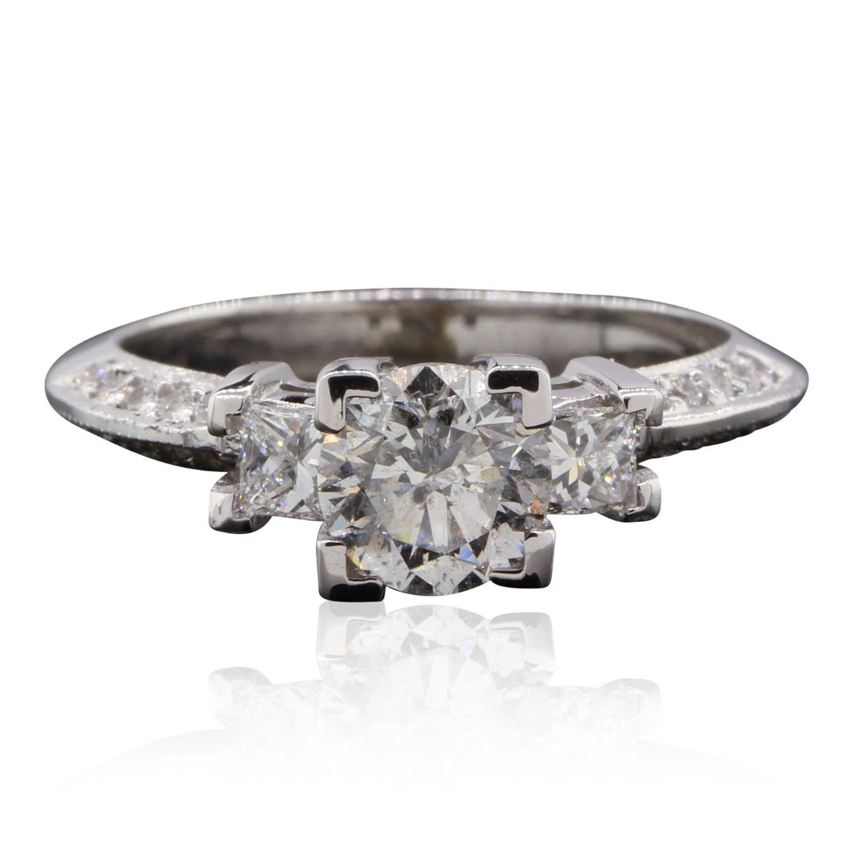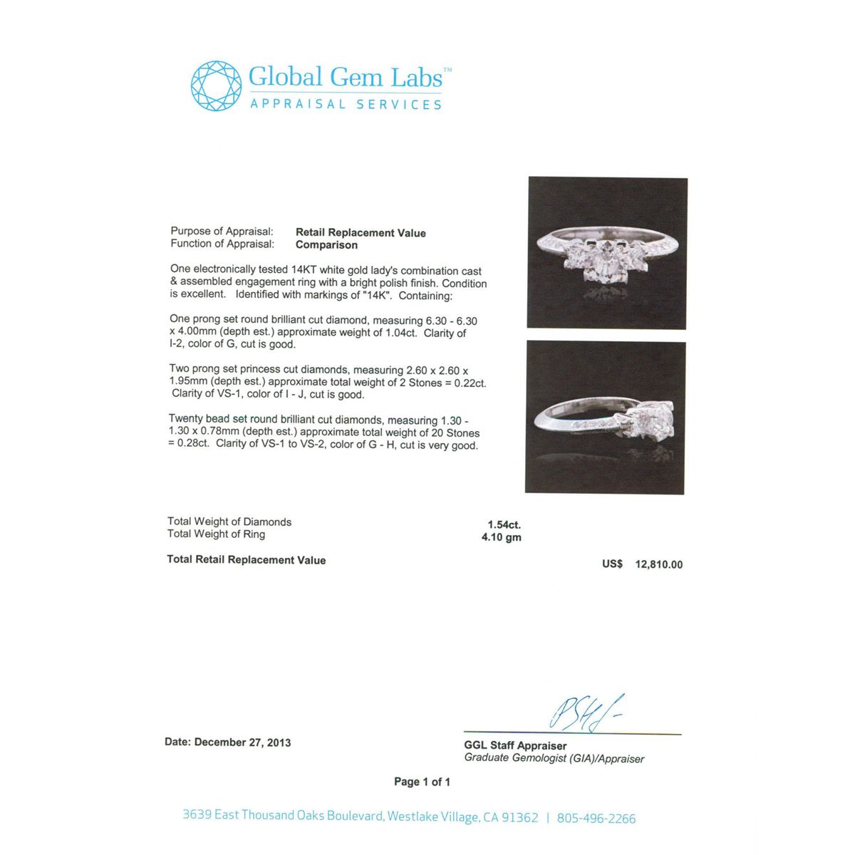 One electronically tested 14KT white gold Ladies combination cast & assembled engagement ring with a bright polish finish. Identified with markings of "14K". Condition is excellent. Containing: One prong set round brilliant cut diamond, measuring 6.30 - 6.30 x 4.00mm (depth est.) approximate weight of 1.04ct. Clarity of I-2, Color of G, Cut is Good. Two prong set princess cut diamonds, measuring 2.60 x 2.60 x 1.95mm (depth est.) approximate total weight of 2 Stones = 0.22ct. Clarity of VS-1, Color of I - J, Cut is Good. Twenty bead set round brilliant cut diamonds, measuring 1.30 - 1.30 x 0.78mm (depth est.) approximate total weight of 20 Stones = 0.28ct. Clarity of VS-1 to VS-2, Color of G - H, Cut is Very Good. Total Weight of Diamonds 1.54ct. Total Weight of Ring 4.10gm. GGL Appraised at $12,810.00.