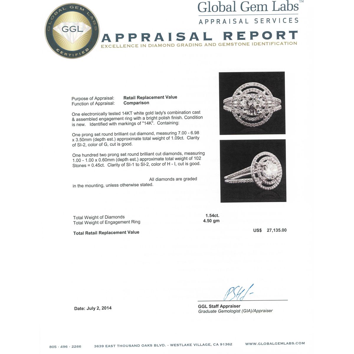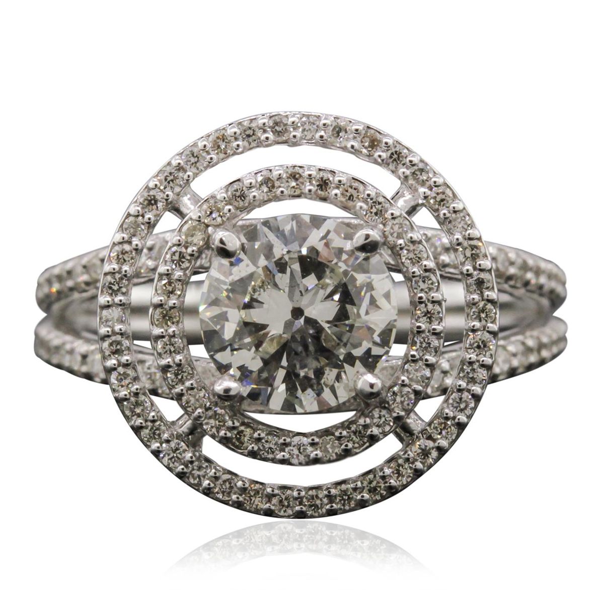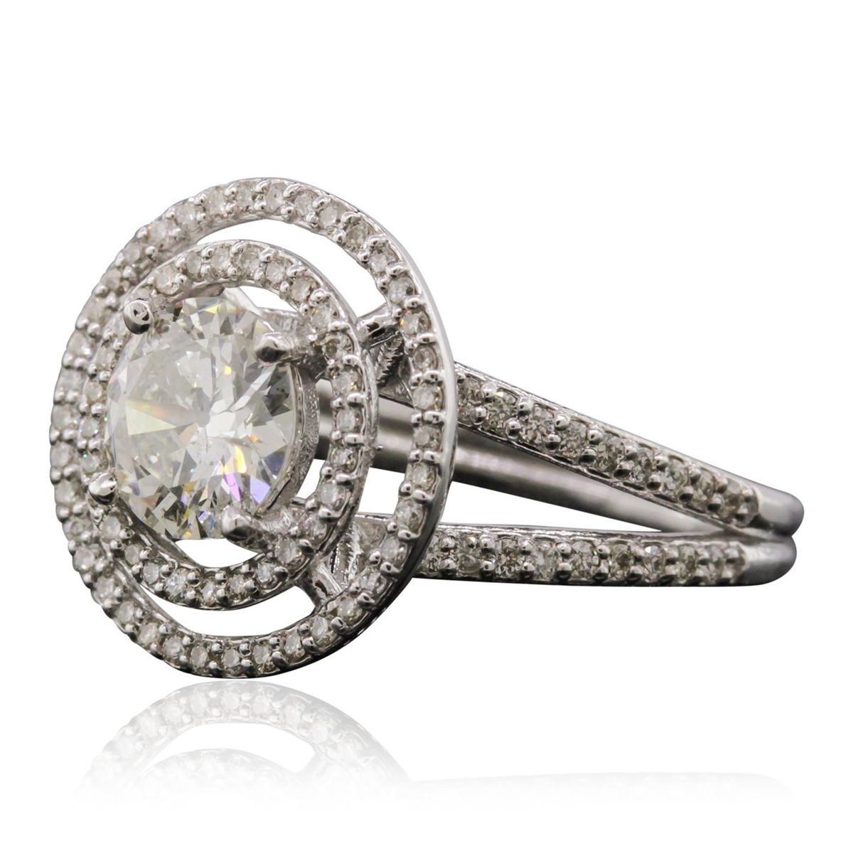 One electronically tested 14KT white gold Ladies combination cast & assembled engagement ring with a bright polish finish. Condition is new. Identified with markings of "14K". Containing: One prong set round brilliant cut diamond, measuring 7.00 - 6.98 x 3.50mm (depth est.) approximate. Total Weight of 1.09ct. Clarity: SI-2. Color: G, Cut is Good. One Hundred Two prong set round brilliant cut diamonds, measuring 1.00 - 1.00 x 0.60mm (depth est.) approximate. Total Weight of 102 Stones = 0.45ct. Clarity: SI-1 to SI-2. Color: H - I, Cut is Good. EGL USA GEM ID# US 911348439D. All diamonds are graded in the mounting, unless otherwise stated. Total Weight of Diamonds 1.54ct. Total Weight of Engagement Ring 4.50 grams. GGL Appraised at $27,135.00.