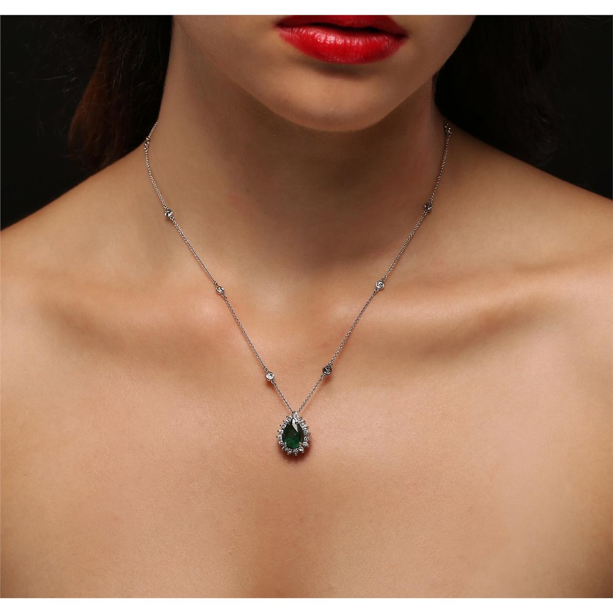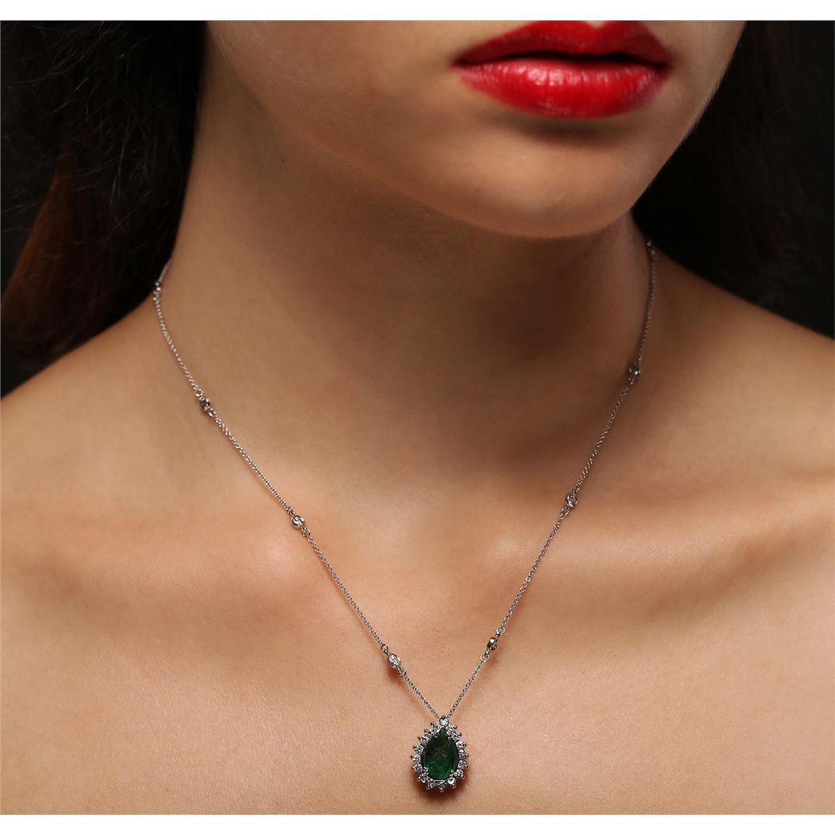 One electronically tested 14KT white gold ladies cast & assembled emerald and diamond necklace with a bright polish finish. The 14KT white gold pendant features an emerald set within a diamond bezel, supported by a diamond set 14KT white gold designer style chain terminating in a lobster claw clasp. Condition is good. Containing: One prong set pear mixed cut natural emerald, measuring 11.10 x 6.40 x 3.20mm, approximate weight of 1.55ct., clarity is heavily included, type III, medium dark, very slightly grayish, very slightly bluish green color, (GIA vslbG 6/3), cut is good. Transmitting light with a minimum of distortion, transparent to translucent. Naturally occurring internal & external characteristics are present. Indications of oil residue. Graded in the setting. Twenty-Seven prong and bezel set round brilliant cut diamonds, measuring 3.00 - 2.00 x 1.50mm (depth est.) approximate. Total Weight of 27 Stones = 1.63ct. Graded in the setting. Clarity: SI-2 to I-2 . Color: G - I. Total Weight of Colored Stones 1.55ct.. Total Weight of Diamonds 1.63ct. AIG Appraised at $7,145.00.