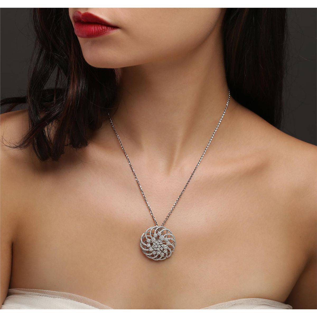 One electronically tested 14KT white gold Ladies combination cast & assembled pendant & chain 17.0" long, medium cable link with a lobster claw clasp with a bright polish finish. Condition is new. Identified with markings of "14K". Containing: Two Hundred Thirty-Eight prong set round brilliant cut diamonds, measuring 1.10 - 1.10 x 0.66mm (depth est.) approximate. Total Weight of 238 Stones = 1.14ct. Clarity: I-1 to I-3. Color: H - I, Cut is Good. Fourteen prong set round brilliant cut diamonds, measuring 2.00 - 2.00 x 1.20mm (depth est.) approximate. Total Weight of 14 Stones = 0.41ct. Clarity: I-1 to I-2. Color: H - I, Cut is Good. Total Weight of Diamonds 1.55ct. Total Weight of Pendant & Chain 13.90 grams. GGL Appraised at $8,010.00.