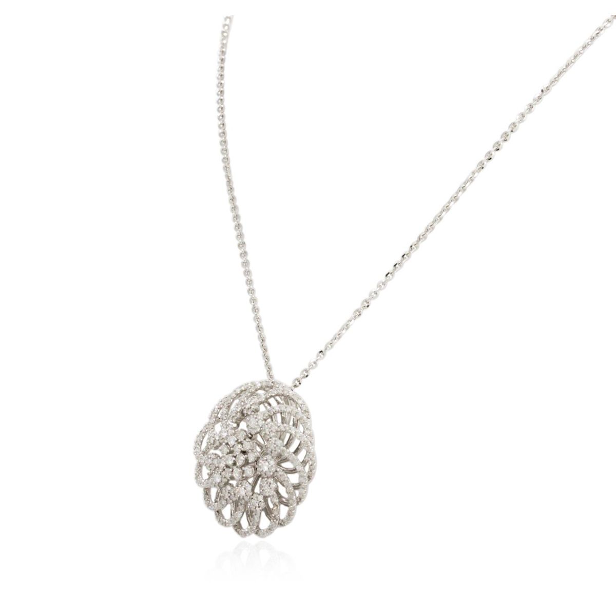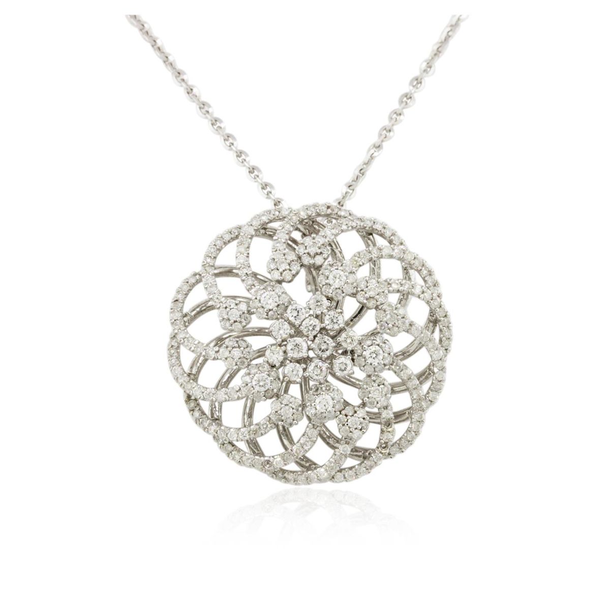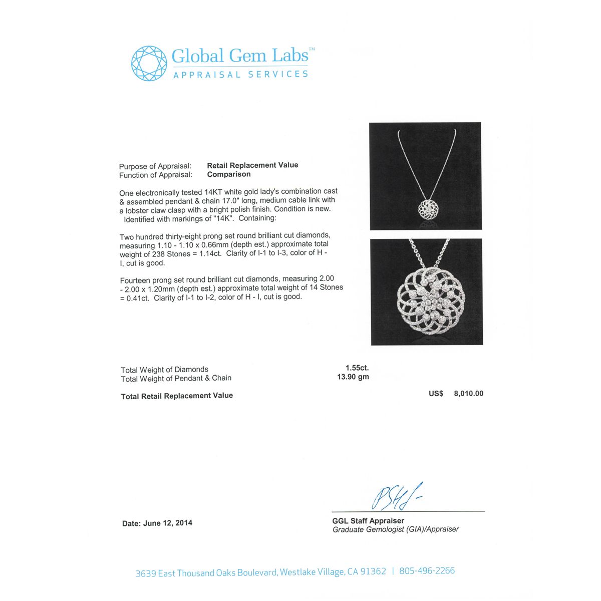 One electronically tested 14KT white gold Ladies combination cast & assembled pendant & chain 17.0" long, medium cable link with a lobster claw clasp with a bright polish finish. Condition is new. Identified with markings of "14K". Containing: Two Hundred Thirty-Eight prong set round brilliant cut diamonds, measuring 1.10 - 1.10 x 0.66mm (depth est.) approximate. Total Weight of 238 Stones = 1.14ct. Clarity: I-1 to I-3. Color: H - I, Cut is Good. Fourteen prong set round brilliant cut diamonds, measuring 2.00 - 2.00 x 1.20mm (depth est.) approximate. Total Weight of 14 Stones = 0.41ct. Clarity: I-1 to I-2. Color: H - I, Cut is Good. Total Weight of Diamonds 1.55ct. Total Weight of Pendant & Chain 13.90 grams. GGL Appraised at $8,010.00.