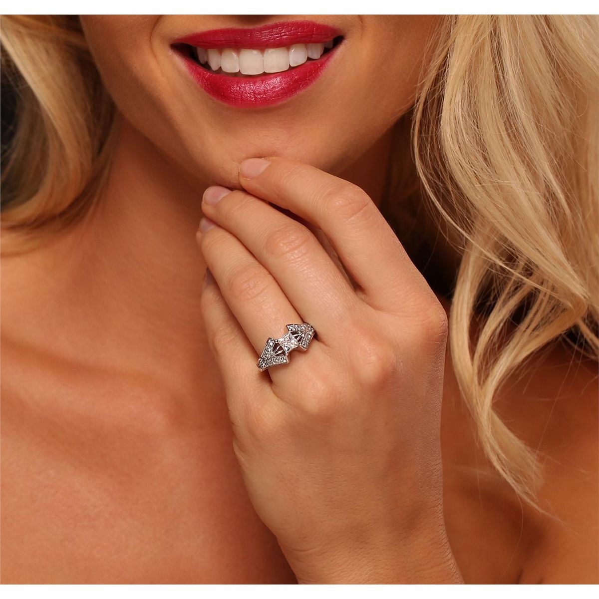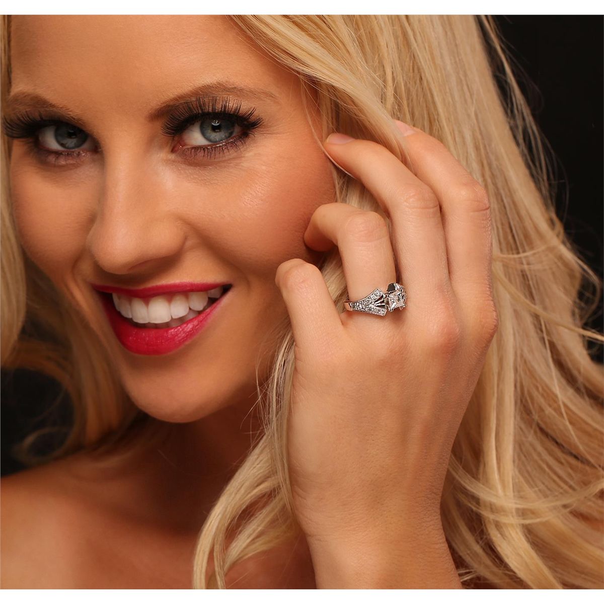 One electronically tested 14KT white gold ladies cast & assembled diamond unity ring. Condition is new, good workmanship. The featured diamond is supported by elaborate diamond set shoulders, completed by a two and one-half millimeter wide band Bright polish finish with milgrain detailing. Identified with markings of "14K". Containing: One prong set princess cut diamond, measuring 4.75 x 4.70 x 4.20mm (depth est.), 5.00.%. GTCF approximate weight of 0.90ct. Graded in the setting. Clarity: I-1. Color: I Depth 89.4%. Table 78.7%. Twenty bead set round brilliant cut diamonds, measuring 2.00 - 1.90 x 1.17mm (depth est.) approximate. Total Weight of 20 Stones = 0.65ct. Graded in the setting. Clarity: SI-1 to SI-2. Color: G - I. Total Weight of Diamonds 1.55ct. Total Weight of Ring 6.85 grams. AIG Appraised at $11,230.00.