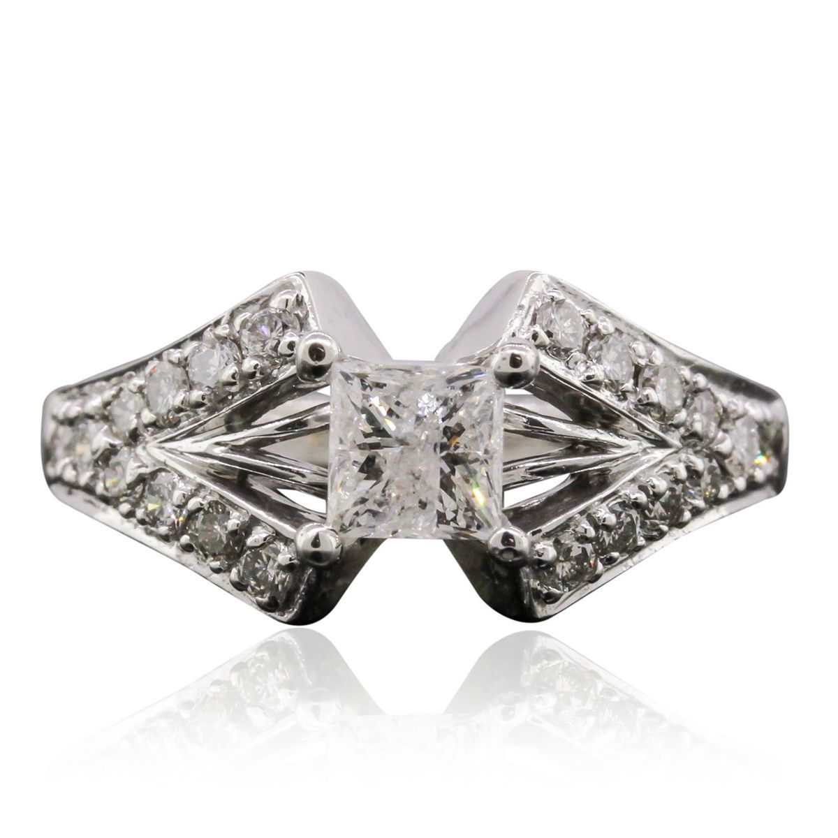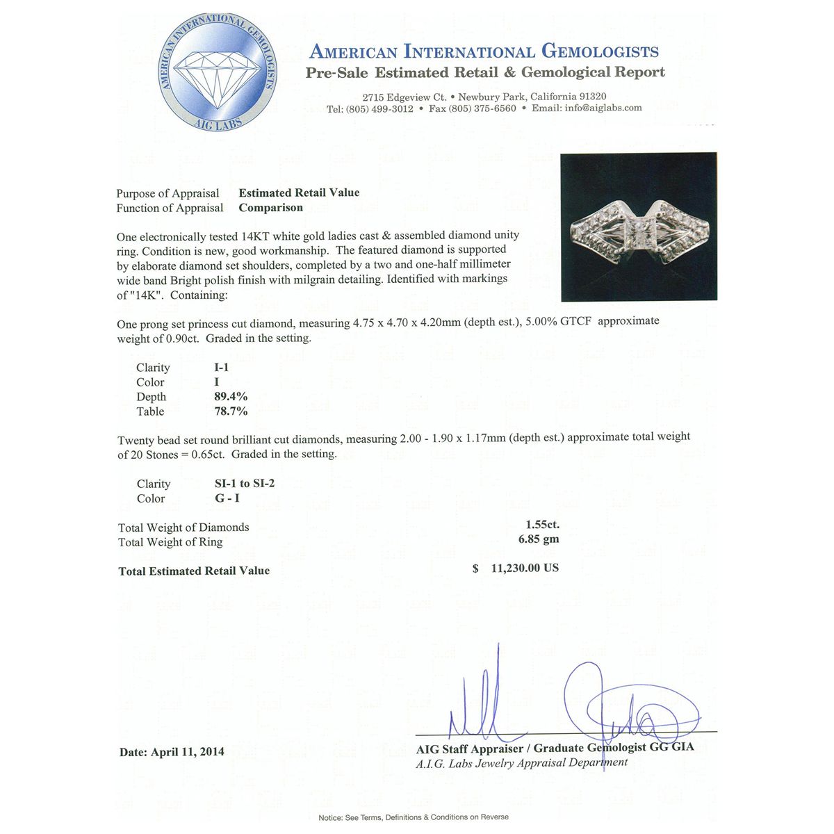 One electronically tested 14KT white gold ladies cast & assembled diamond unity ring. Condition is new, good workmanship. The featured diamond is supported by elaborate diamond set shoulders, completed by a two and one-half millimeter wide band Bright polish finish with milgrain detailing. Identified with markings of "14K". Containing: One prong set princess cut diamond, measuring 4.75 x 4.70 x 4.20mm (depth est.), 5.00.%. GTCF approximate weight of 0.90ct. Graded in the setting. Clarity: I-1. Color: I Depth 89.4%. Table 78.7%. Twenty bead set round brilliant cut diamonds, measuring 2.00 - 1.90 x 1.17mm (depth est.) approximate. Total Weight of 20 Stones = 0.65ct. Graded in the setting. Clarity: SI-1 to SI-2. Color: G - I. Total Weight of Diamonds 1.55ct. Total Weight of Ring 6.85 grams. AIG Appraised at $11,230.00.