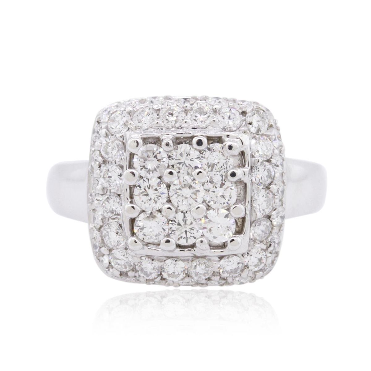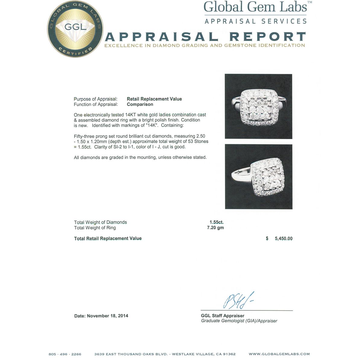 One electronically tested 14KT white gold ladies combination cast & assembled diamond ring with a bright polish finish. Identified with markings of "14K". Condition is new. Containing: Fifty-Three prong set round brilliant cut diamonds, measuring 2.50 - 1.50 x 1.20mm (depth est.) approximate total weight of 53 Stones = 1.55ct. Clarity: SI-2 to I-1. Color: I - J, Cut is Good. All diamonds are graded in the mounting, unless otherwise stated. Total Weight of Diamonds 1.55ct. Total Weight of Ring 7.20 grams. GGL Appraised at $5,450.00.