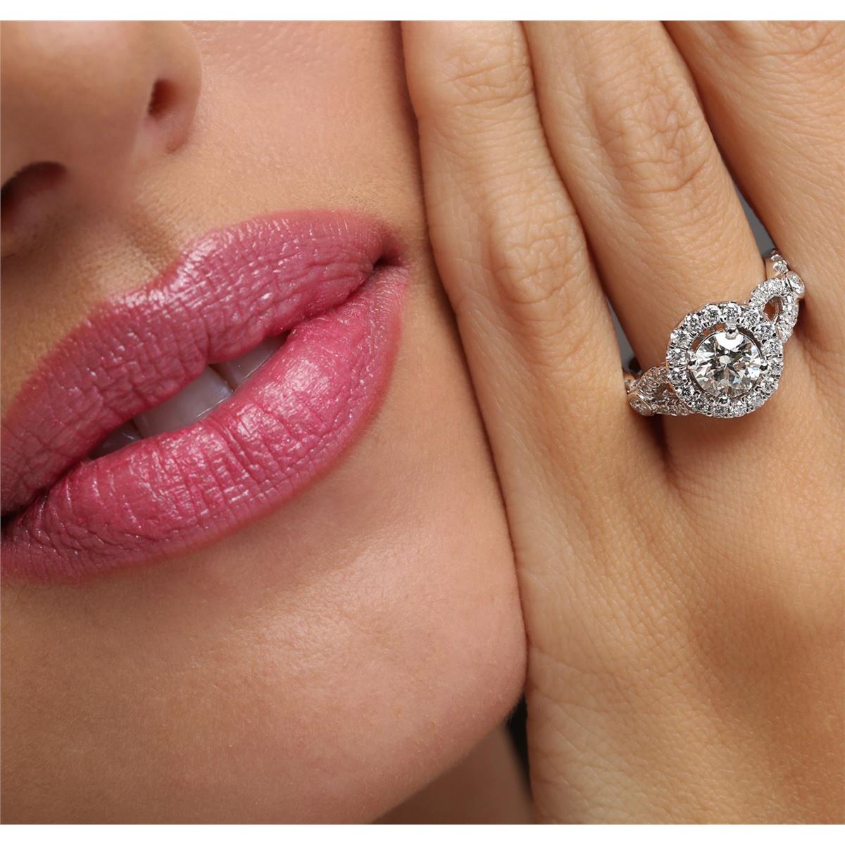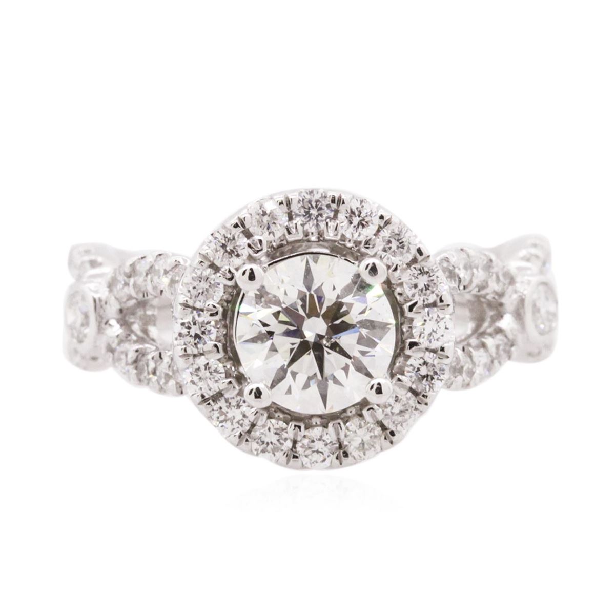 One electronically tested 14KT white gold ladies cast diamond unity ring with a bright polish finish. The featured diamond is set within a diamond bezel supported by intertwining diamond set shoulders, completed by a grooved two and one-half millimeter wide band. Identified with markings of "14K". Condition is new, good workmanship. Containing: One prong set round brilliant cut diamond, measuring 6.10 - 6.05 x 3.70mm (depth est.) approximate weight of 0.90ct. Graded in the setting. Clarity: SI-1. Color:  61.0%. Table 57.7%. Forty-Six prong and bezel set round brilliant cut diamonds, measuring 1.60 - 1.40 x 0.90mm (depth est.) approximate total weight of 46 Stones = 0.66ct. Graded in the setting. Clarity: SI-1 to SI-2. Color: F - H. Total Weight of Diamonds 1.56ct. Total Weight of Ring 5.68 grams. AIG Appraised at $17,840.00.