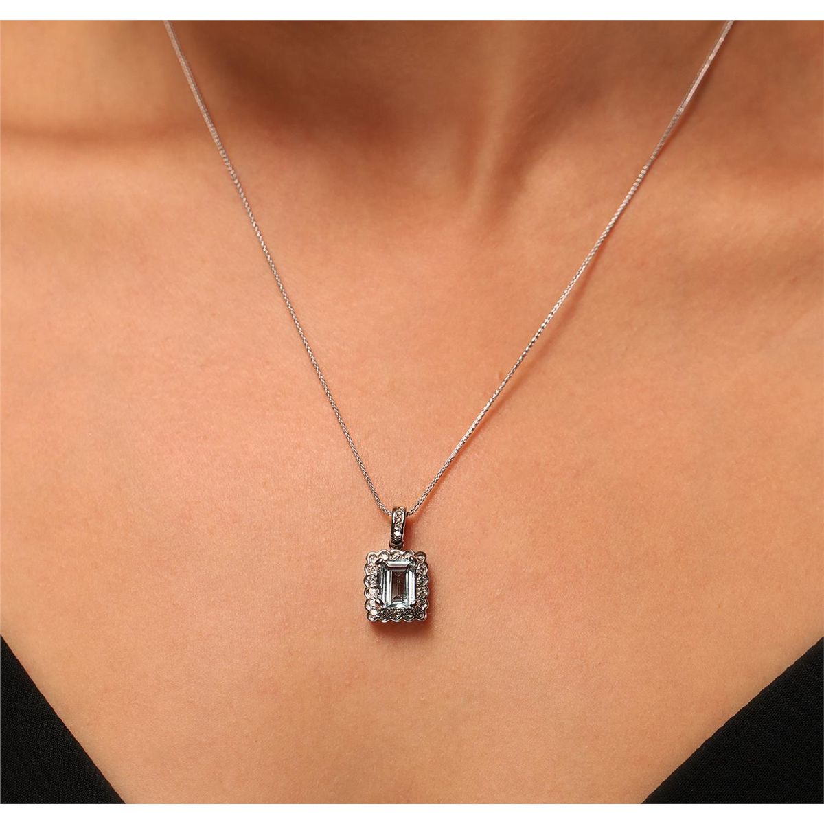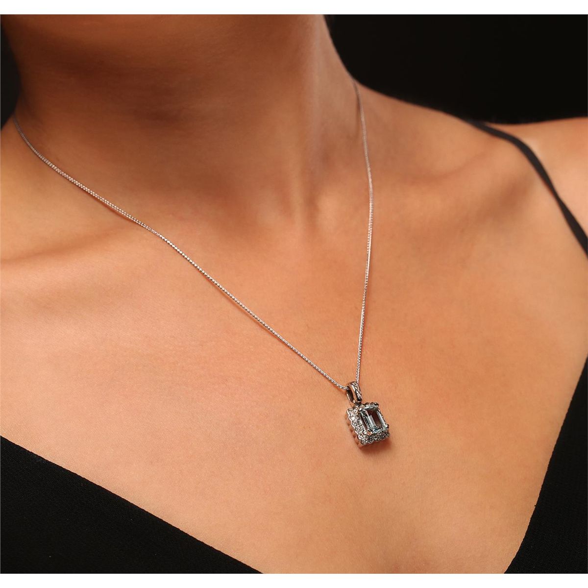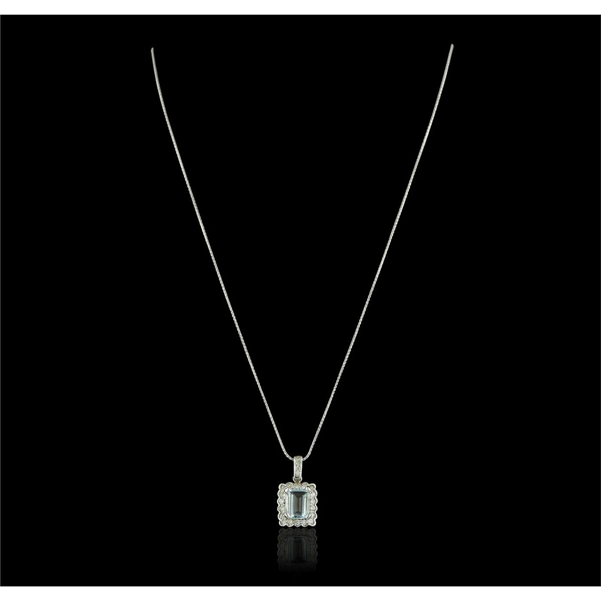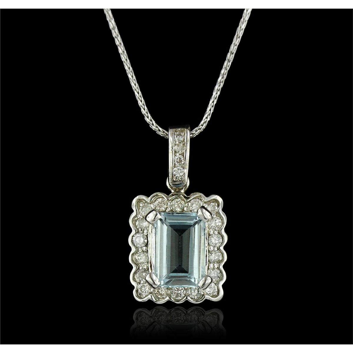 One electronically tested 14KT white gold Ladies combination cast & die struck pendant & chain 17.0" long, medium fancy cable link with a lobster claw clasp with a bright polish finish. Condition is new. Identified with markings of "14K". Containing: One prong set emerald standard step cut natural aquamarine, measuring 8.60 x 5.90 x 3.60mm, approximate weight of 1.56ct., clarity is eye clean, type I, light, very slightly grayish, blue color, (GIA B 3/3), cut is very good. Colored gemstones are presumed to have been subjected to commonly used and possible undetectable color/clarity enhancement processes. Twenty-Two prong set round brilliant cut diamonds, measuring 1.50 - 1.50 x 0.90mm (depth est.) approximate. Total Weight of 22 Stones = 0.40ct. Clarity: SI-2 to I-2. Color: I - J, Cut is Good. Total Weight of Colored Stones 1.56ct. Total Weight of Diamonds 0.40ct. Total Weight of Pendant & Chain 5.30gm. GGL Appraised at $3,655.00.