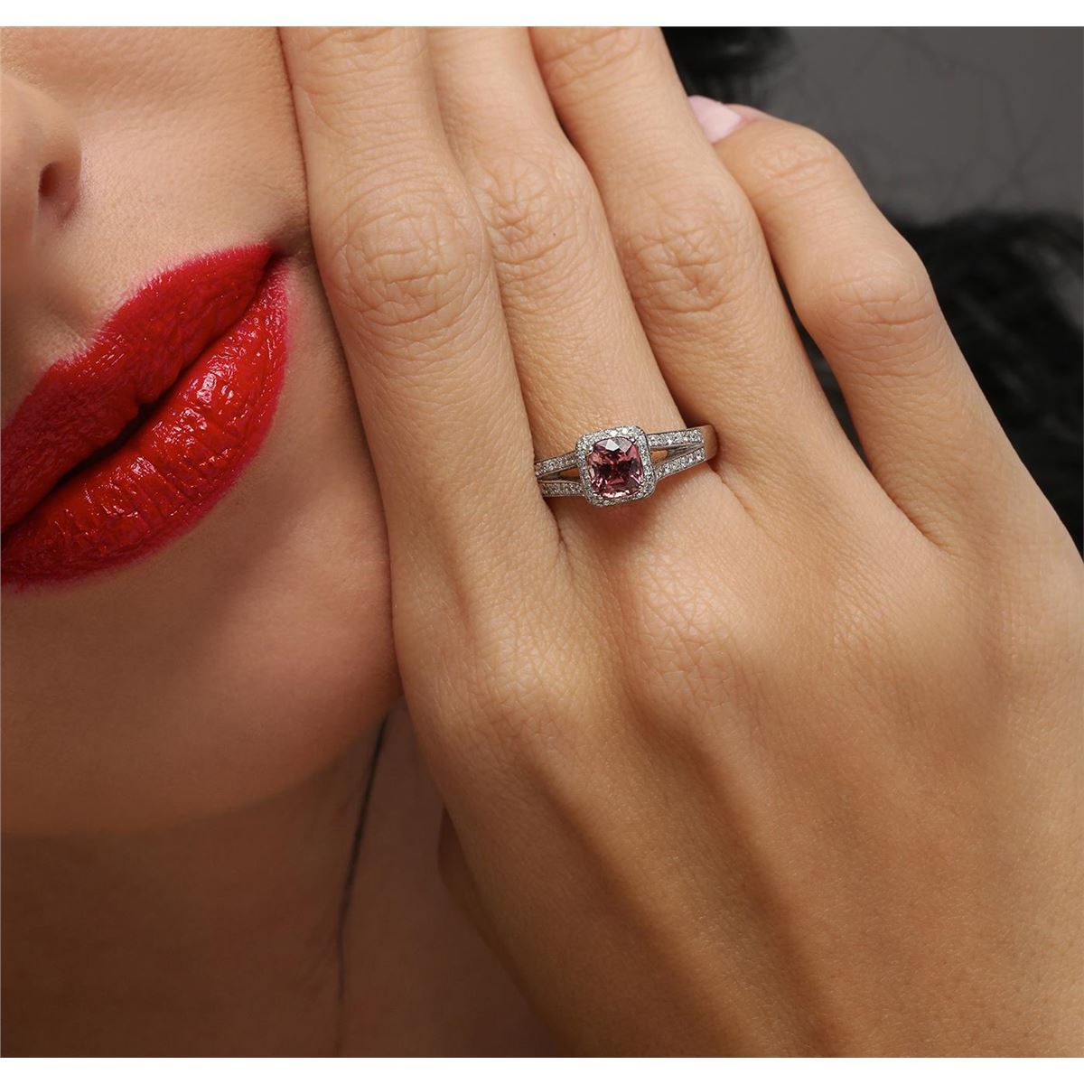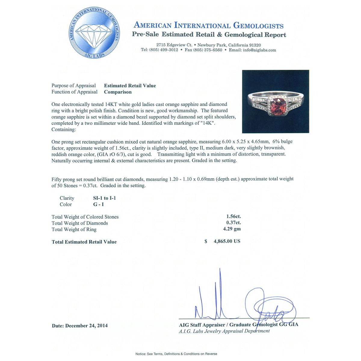 One electronically tested 14KT white gold ladies cast orange sapphire and diamond ring with a bright polish finish. The featured orange sapphire is set within a diamond bezel supported by diamond set split shoulders, completed by a two millimeter wide band. Identified with markings of "14K". Condition is new, good workmanship. Containing: One prong set rectangular cushion mixed cut natural orange sapphire, measuring 6.00 x 5.25 x 4.65mm, 6% bulge factor, approximate weight of 1.56ct., clarity is slightly included, type II, medium dark, very slightly brownish, reddish orange color, (GIA rO 6/3), cut is good. Transmitting light with a minimum of distortion, transparent. Naturally occurring internal & external characteristics are present. Graded in the setting. Fifty prong set round brilliant cut diamonds, measuring 1.20 - 1.10 x 0.69mm (depth est.) approximate total weight of 50 Stones = 0.37ct. Graded in the setting. Clarity: SI-1 to I-1. Color: G - I. Total Weight of Colored Stones 1.56ct. Total Weight of Diamonds 0.37ct. Total Weight of Ring 4.29 grams. AIG Appraised at $4,865.00.