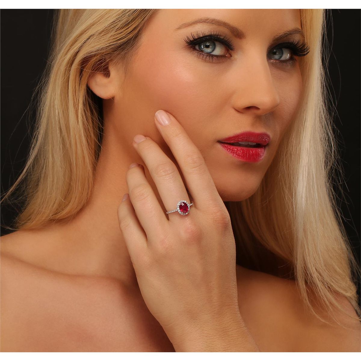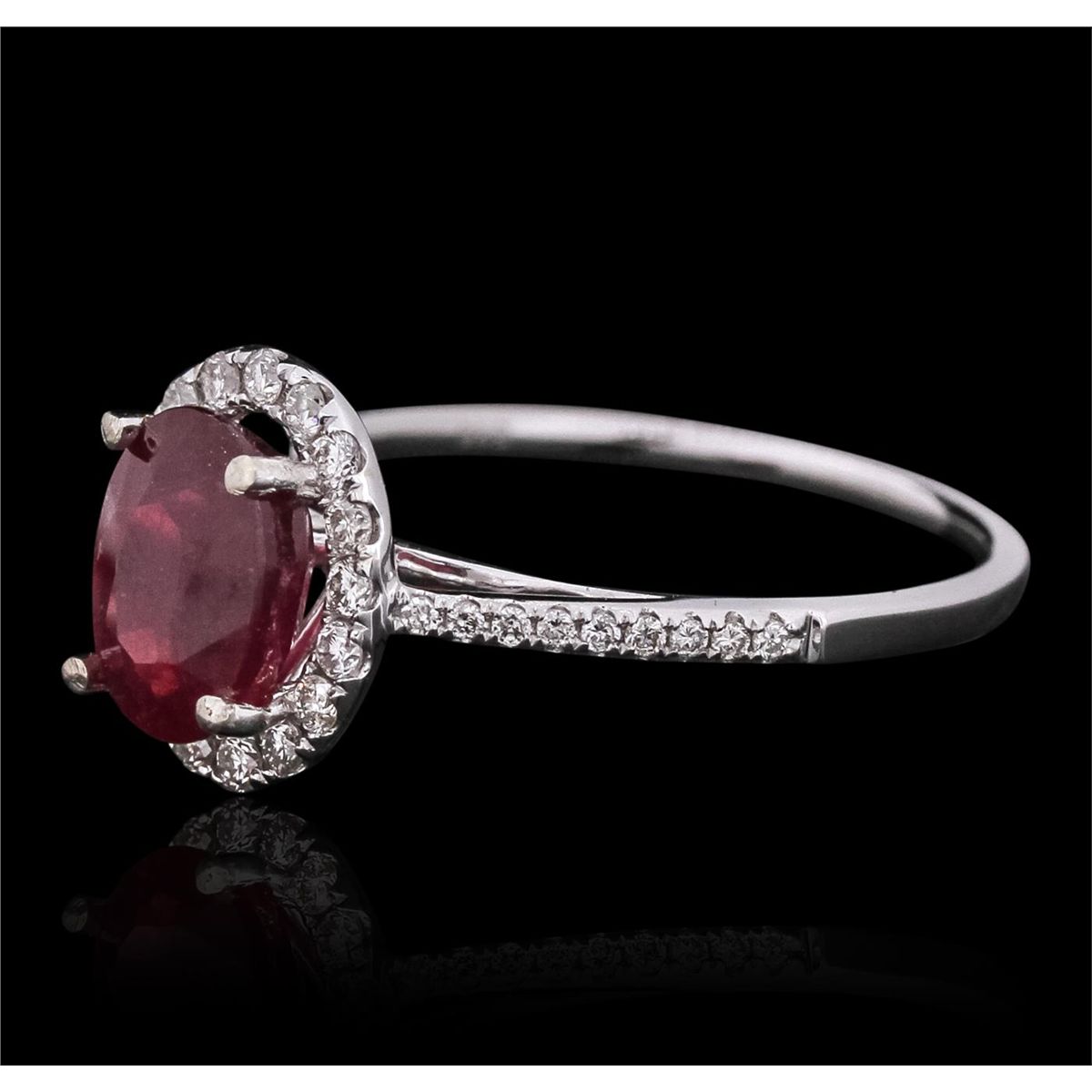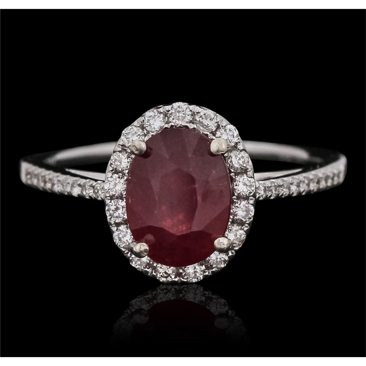 One electronically tested 14KT white gold Ladies cast ring with a bright polish finish. Condition is new. Identified with markings of "14K". Containing: One prong set oval modified brilliant cut natural ruby, measuring 8.00 x 6.20 x 3.86mm, approximate weight of 1.56ct., clarity is heavily included, type II, medium, moderately strong, strongly purplish red color, (GIA stpR 5/4), cut is good. Thirty-Five prong set round brilliant cut diamonds, measuring 1.30 - 1.00 x 0.69mm (depth est.) approximate. Total Weight of 35 Stones = 0.19ct. Clarity: I-1 to I-2. Color: J - K, Cut is Good. Colored gemstones are presumed to have been subjected to commonly used enhancement processes. All diamonds and colored gemstones are graded in the mounting, unless otherwise stated. Total Weight of Colored Stones 1.56ct. Total Weight of Diamonds 0.19ct. Total Weight of Ring 2.30 grams. GGL Appraised at $2,325.00.