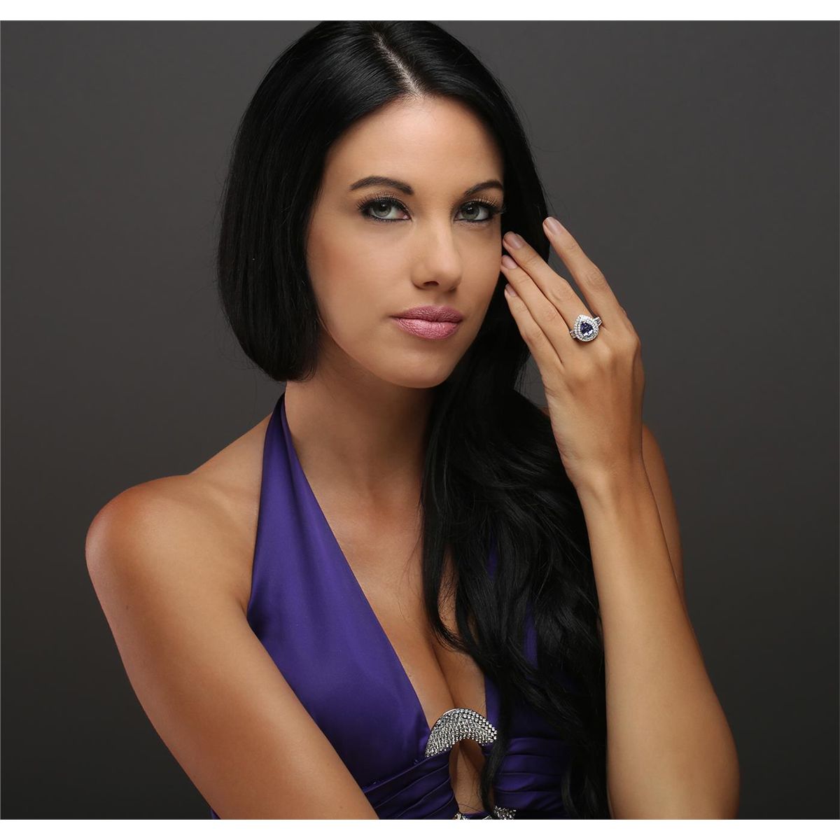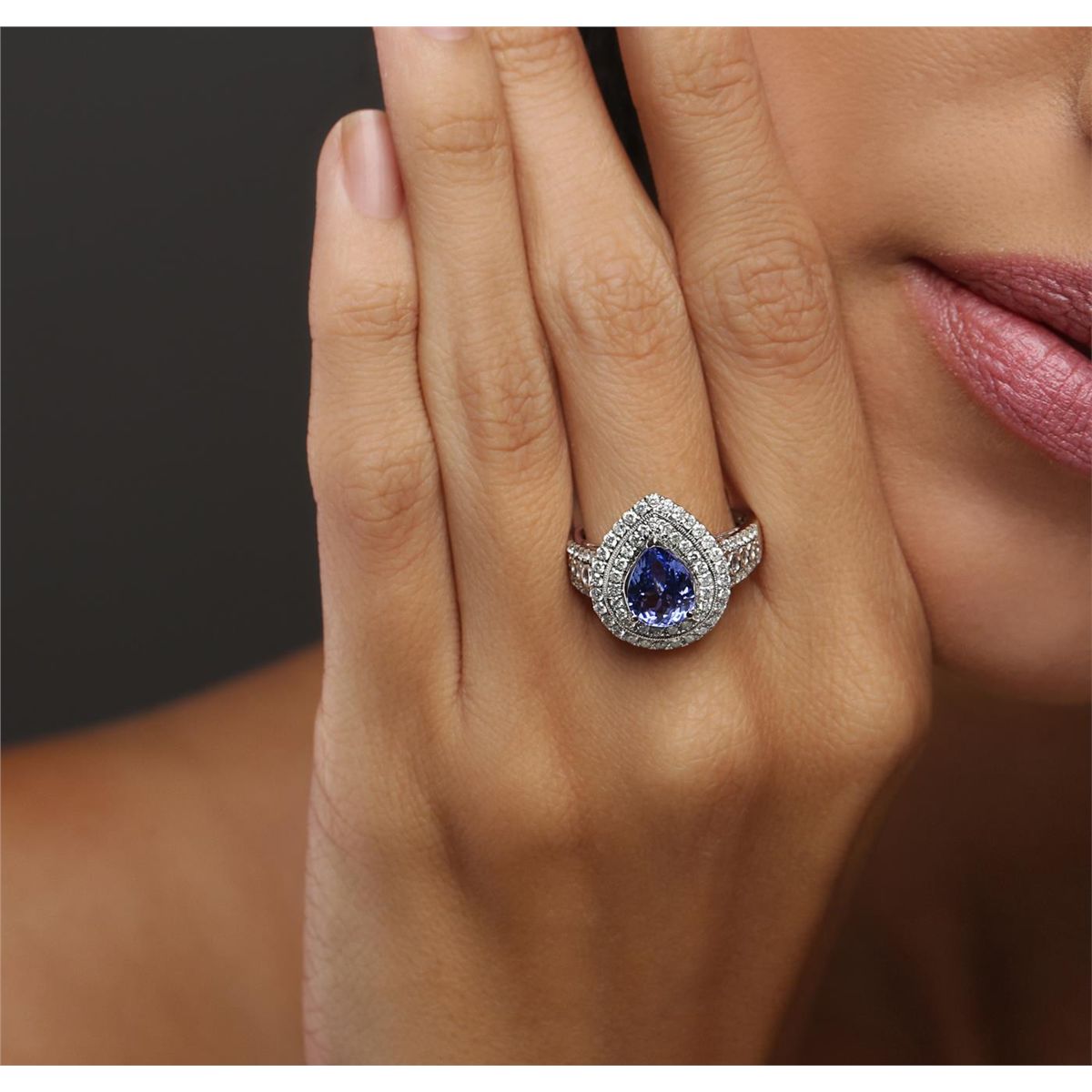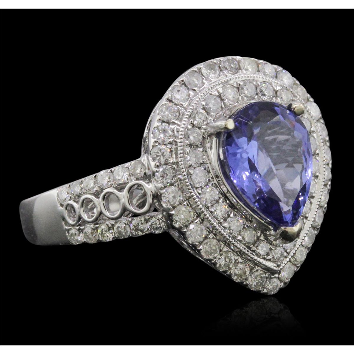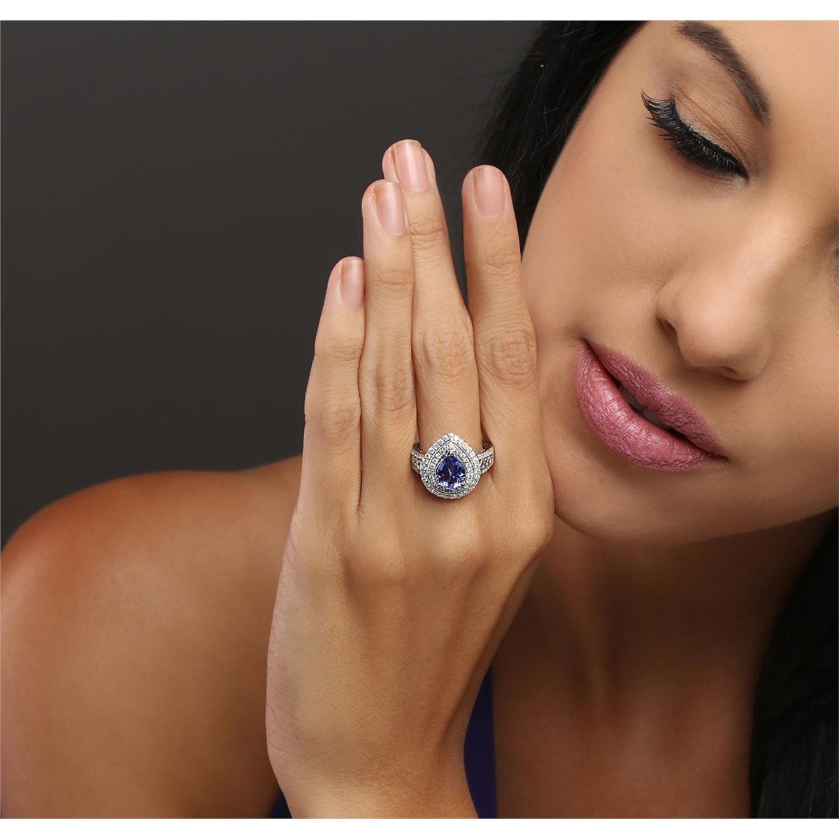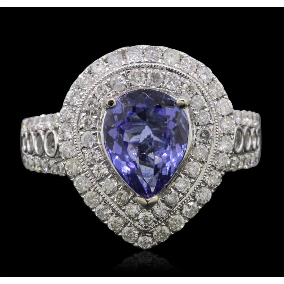 One electronically tested 14KT white gold ladies combination cast & assembled tanzanite and diamond ring with a flat shank with a bright polish finish. Identified with markings of "14K". Condition is new. Containing: One prong set pear modified brilliant cut natural tanzanite, measuring 9.00 x 7.18 x 3.60mm, approximate weight of 1.56ct., clarity is eye clean, type I, medium, very slightly grayish, violet color, (GIA V 5/3), cut is good. Seventy-Six prong set round brilliant cut diamonds, measuring 1.30 - 1.30 x 0.78mm (depth est.) approximate total weight of 76 Stones = 0.61ct. Clarity: I-1 to I-2. Color: I - J, Cut is Good. Colored gemstones are presumed to have been subjected to commonly used enhancement processes. All diamonds and colored gemstones are graded in the mounting, unless otherwise stated. Total Weight of Colored Stones 1.56ct. Total Weight of Diamonds 0.61ct. Total Weight of Ring 6.50 grams. GGL Appraised at $5,475.00. AIGAppraised at $75,810.00.