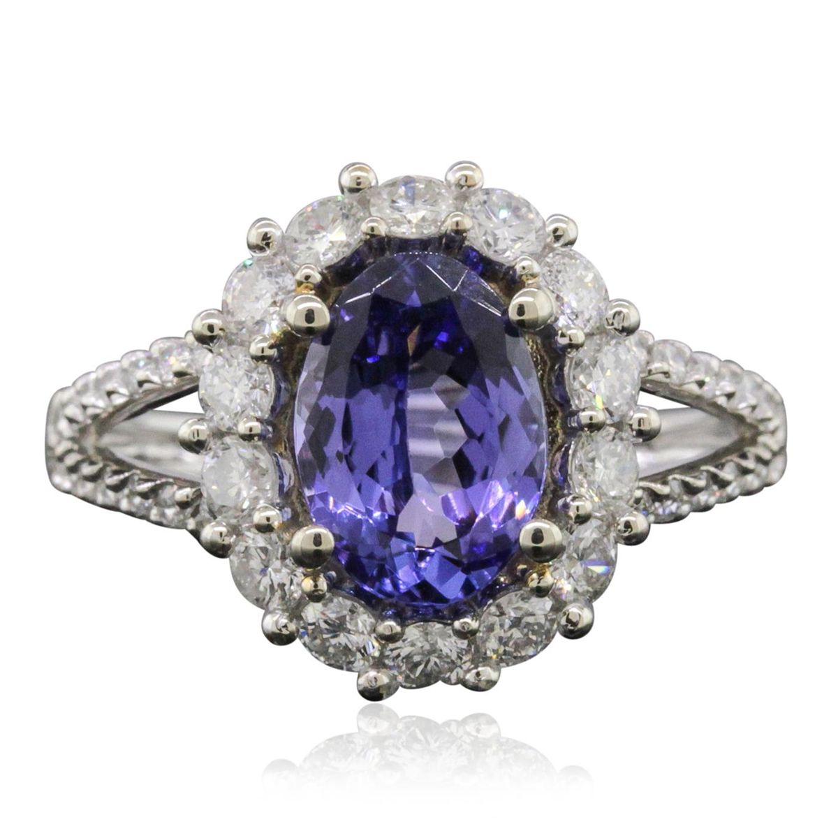 One electronically tested 14KT white gold ladies combination cast & assembled tanzanite and diamond ring with a split shank with a bright polish finish. Identified with markings of "14K". Condition is new. Containing: One prong set oval modified brilliant cut natural tanzanite, measuring 9.89 x 7.10 x 3.22mm, approximate weight of 1.56ct., clarity is eye clean, type I, medium, moderately strong, violet color, (GIA V 5/4), cut is very good. Twenty-Eight prong set round brilliant cut diamonds, measuring 1.20 - 1.20 x 0.72mm (depth est.) stated total weight of 28 Stones = 0.18ct. Clarity: I-1 to I-2. Color: H - I, Cut is Good. Fourteen prong set round brilliant cut diamonds, measuring 2.40 - 2.40 x 1.44mm (depth est.) approximate total weight of 14 Stones = 0.71ct. Clarity: SI-2 to I-1. Color: I - J, Cut is Good. Colored gemstones are presumed to have been subjected to commonly used enhancement processes. All diamonds and colored gemstones are graded in the mounting, unless otherwise stated total weight of Colored Stones 1.56ct. Total Weight of Diamonds 0.88ct. Total Weight of Ring 4.50 grams. GGL Appraised at $6,250.00.
