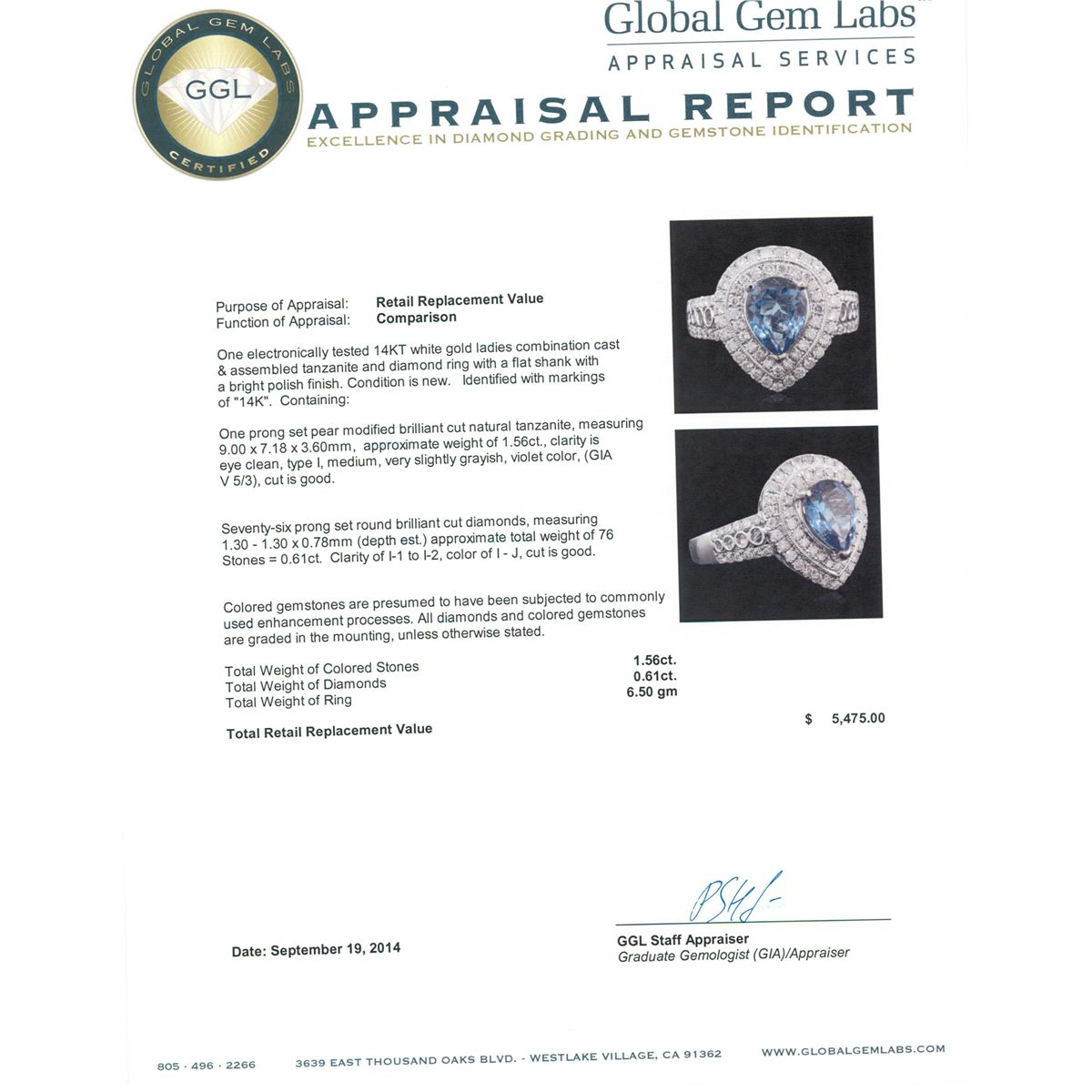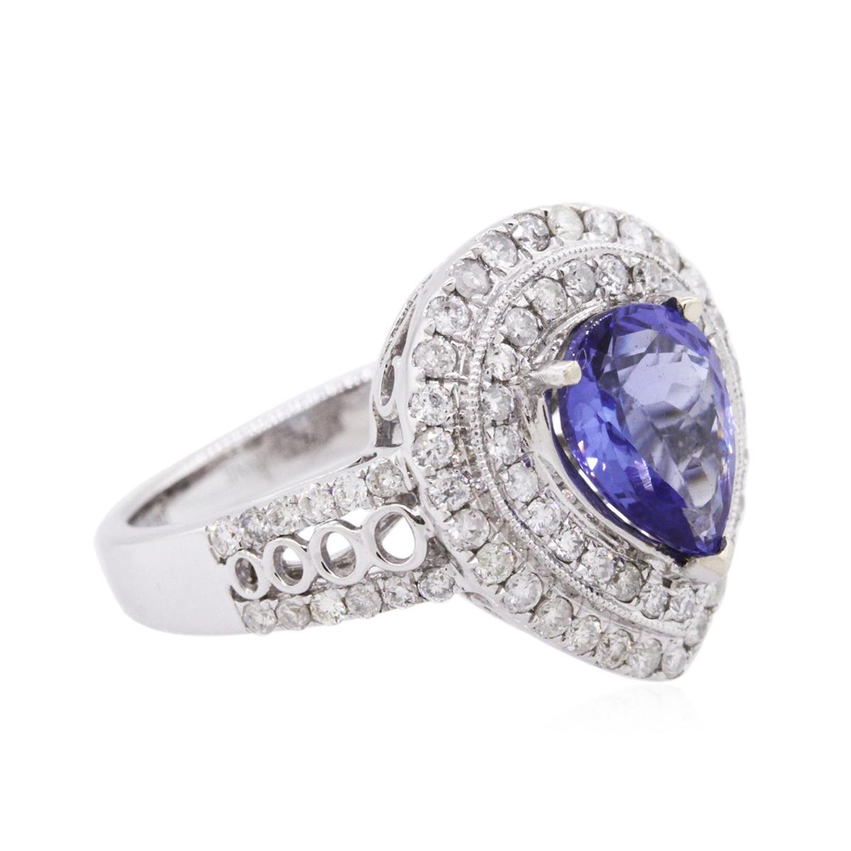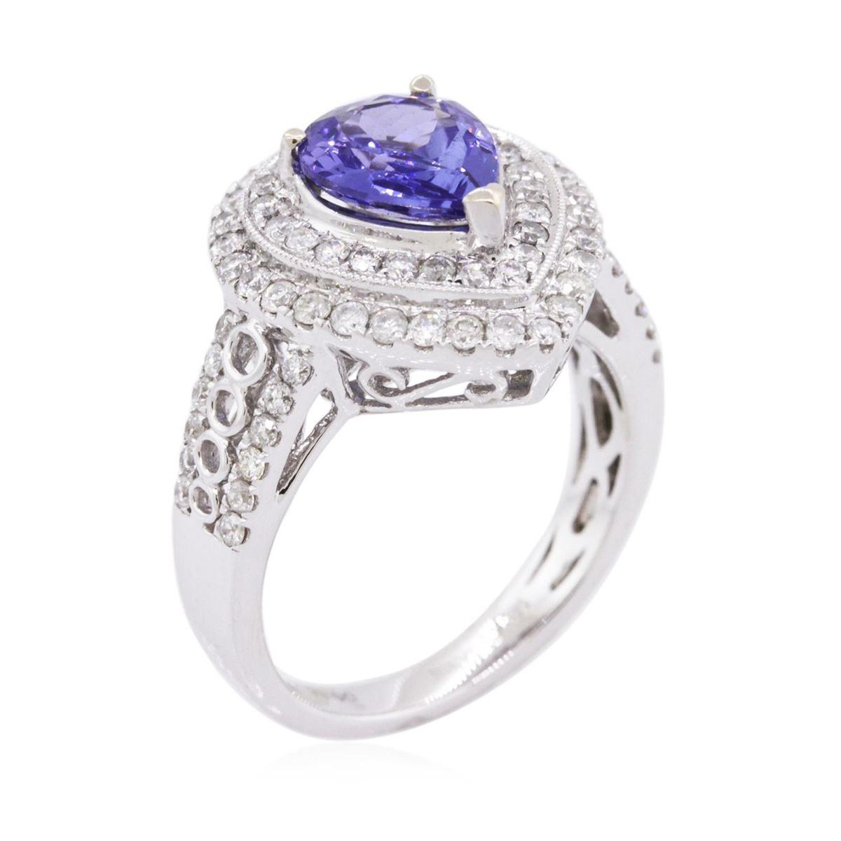 One electronically tested 14KT white gold ladies combination cast & assembled tanzanite and diamond ring with a flat shank with a bright polish finish. Identified with markings of "14K". Condition is new. Containing: One prong set pear modified brilliant cut natural tanzanite, measuring 9.00 x 7.18 x 3.60mm, approximate weight of 1.56ct., clarity is eye clean, type I, medium, very slightly grayish, violet color, (GIA V 5/3), cut is good. Seventy-Six prong set round brilliant cut diamonds, measuring 1.30 - 1.30 x 0.78mm (depth est.) approximate total weight of 76 Stones = 0.61ct. Clarity: I-1 to I-2. Color: I - J, Cut is Good. Colored gemstones are presumed to have been subjected to commonly used enhancement processes. All diamonds and colored gemstones are graded in the mounting, unless otherwise stated. Total Weight of Colored Stones 1.56ct. Total Weight of Diamonds 0.61ct. Total Weight of Ring 6.50 grams. GGL Appraised at $5,475.00.