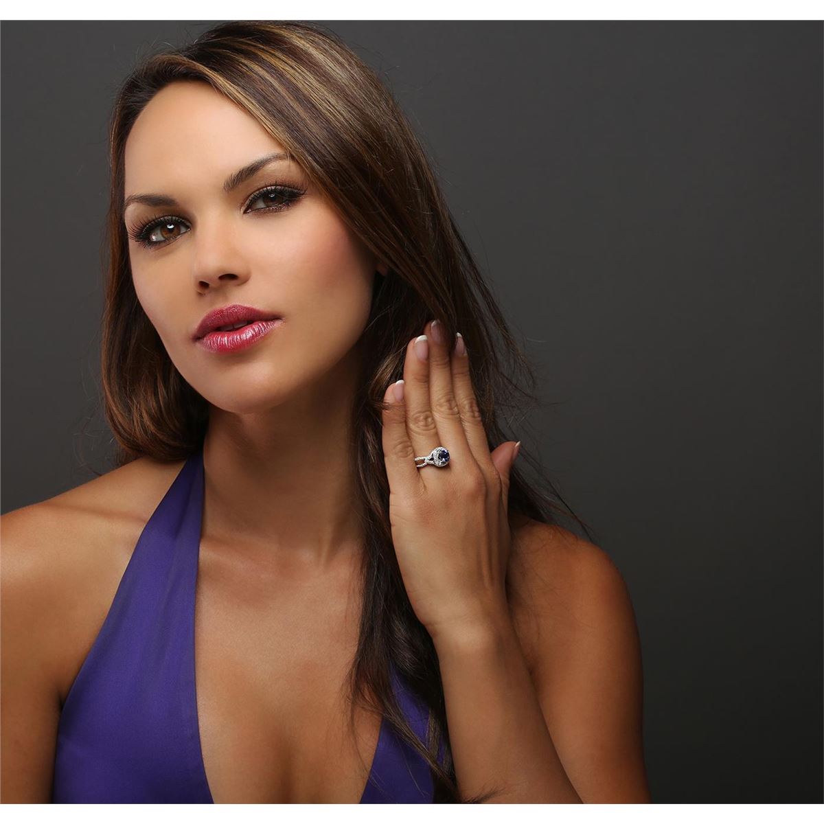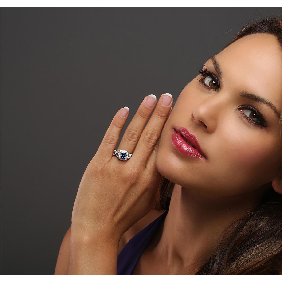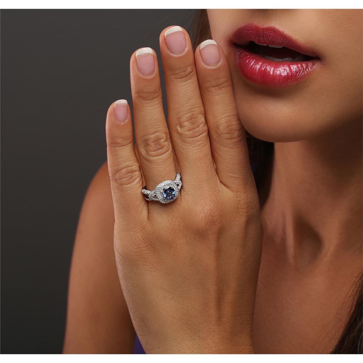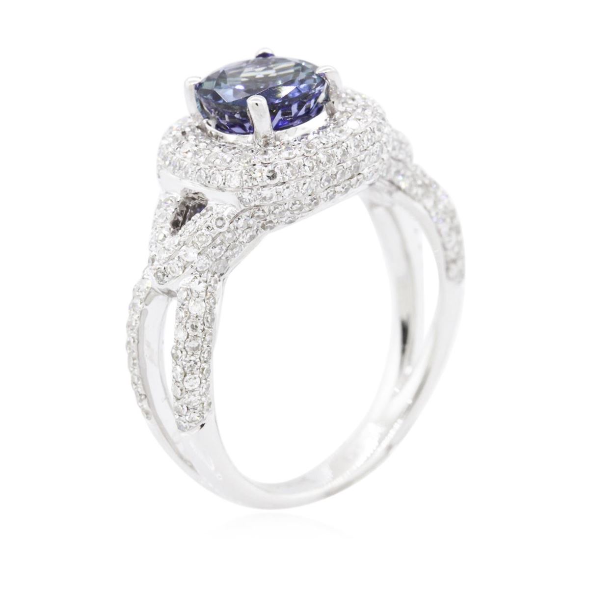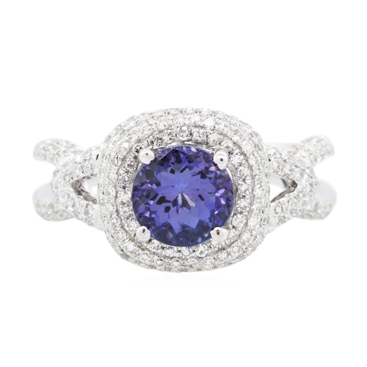One electronically tested 14KT white gold ladies combination cast & assembled tanzanite and diamond ring with a split shank with a bright polish finish. Identified with markings of "14K". Condition is new. Containing: One prong set round modified brilliant cut natural tanzanite, measuring 6.99 - 6.99 x 4.76 mm, approximate weight of 1.56ct., clarity is eye clean, type I, medium light, moderately strong, violet color, (GIA V 4/4), cut is very good. Two Hundred Seventy-Five prong set single cut diamonds, measuring 1.00 - 1.00 x 0.60mm (depth est.) approximate total weight of 275 Stones = 1.08ct. Clarity: VS-2. Color: G, Cut is Good. Colored gemstones are presumed to have been subjected to commonly used enhancement processes. All diamonds and colored gemstones are graded in the mounting, unless otherwise stated. Total Weight of Colored Stones 1.56ct. Total Weight of Diamonds 1.08ct. Total Weight of Ring 5.60 grams. GGL Appraised at $6,890.00.
