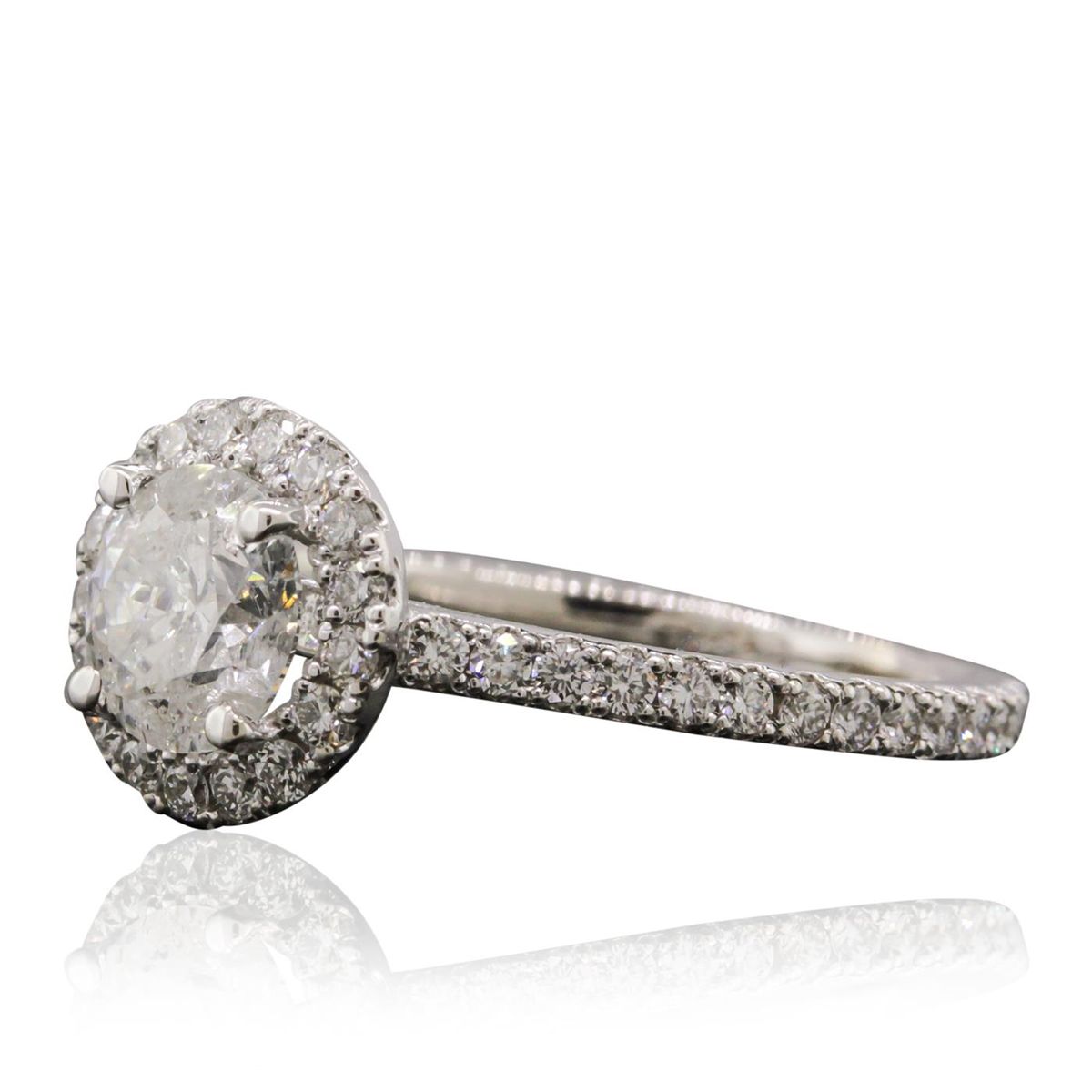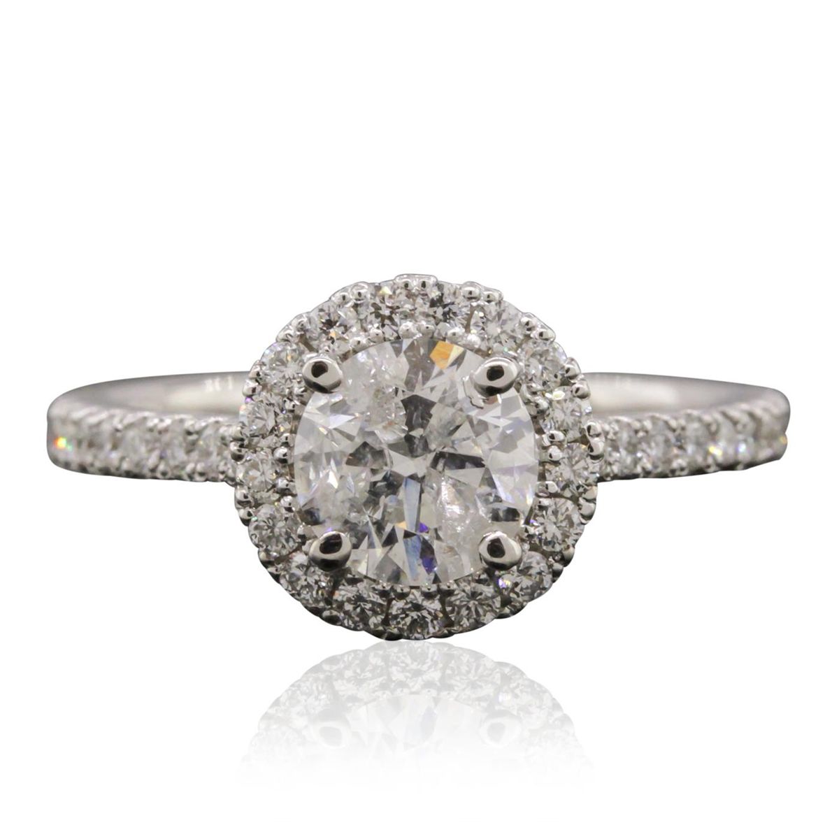 One electronically tested 14KT white gold Ladies combination cast & assembled engagement ring with a bright polish finish. Condition is new. Identified with markings of "14K". Containing: One prong set round brilliant cut diamond, measuring 6.44 - 6.43 x 4.00mm (depth est.) approximate weight of 1.02ct. Clarity: I-2. Color: F, Cut is Good. Forty-Five prong set round brilliant cut diamonds, measuring 1.50 - 1.50 x 0.90mm (depth est.) approximate. Total Weight of 45 Stones = 0.54ct. Clarity: VS-2 to SI-1. Color: F - G, Cut is Good. EGL USA GEM ID# US 911348426D. All diamonds are graded in the mounting, unless otherwise stated. Total Weight of Diamonds 1.56ct. Total Weight of Engagement Ring 2.70 grams. GGL Appraised at $12,360.00.