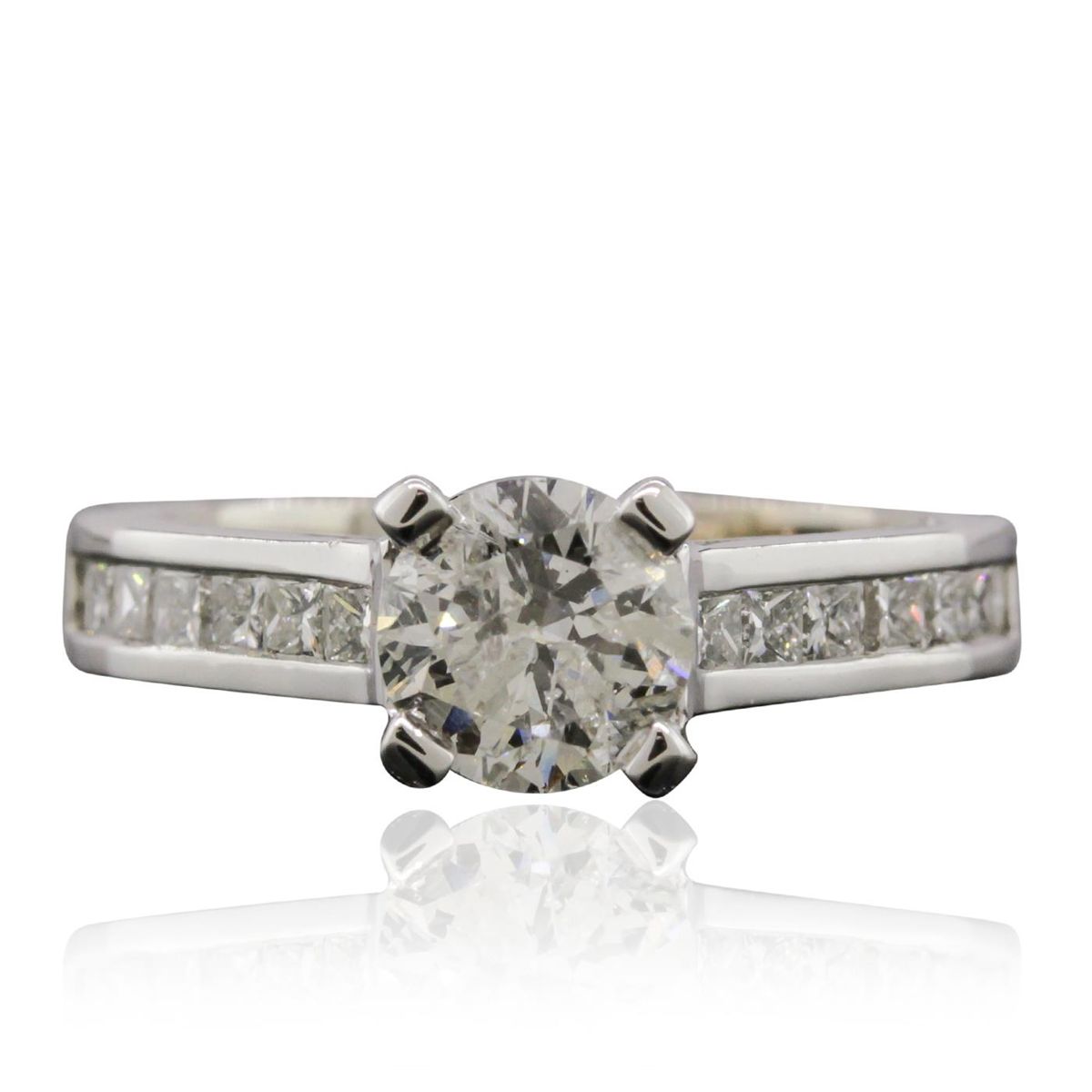 One electronically tested 14KT white gold Ladies combination cast & assembled engagement ring with a bright polish finish. Condition is new. Identified with markings of "14K". Containing: One prong set round brilliant cut diamond, measuring 6.47 - 6.46 x 3.88mm (depth est.) approximate weight of 1.06ct. Clarity: I-1. Color: G - H, Cut is Good. Fourteen channel set princess cut diamonds, measuring 1.80 x 1.80 x 1.35mm (depth est.) approximate. Total Weight of 14 Stones = 0.50ct. Clarity: VS-2 to SI-2. Color: F - G, Cut is Good. EGL USA GEM ID# US 911348409D. All diamonds are graded in the mounting, unless otherwise stated. Total Weight of Diamonds 1.56ct. Total Weight of Engagement Ring 5.00 grams. GGL Appraised at $19,390.00.