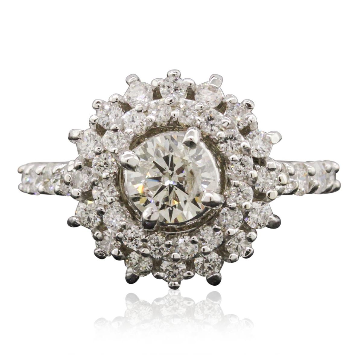 One electronically tested 14KT white gold ladies combination cast & assembled engagement ring with a bright polish finish. Condition is new. Identified with markings of "K14". Containing: One prong set round brilliant cut diamond, measuring 5.65 - 5.63 x 3.64mm (depth est.) approximate weight of 0.71ct. Clarity: I-1. Color: K, Cut is Good. Forty prong set round brilliant cut diamonds, measuring 2.10 - 1.50 x 1.08mm (depth est.) approximate. Total Weight of 40 Stones = 0.85ct. Clarity: I-1 to I-2. Color: I - J, Cut is Good. All diamonds are graded in the mounting, unless otherwise stated. Total Weight of Diamonds 1.56ct. Total Weight of Ring 5.00 grams. GGL Appraised at $7,625.00.