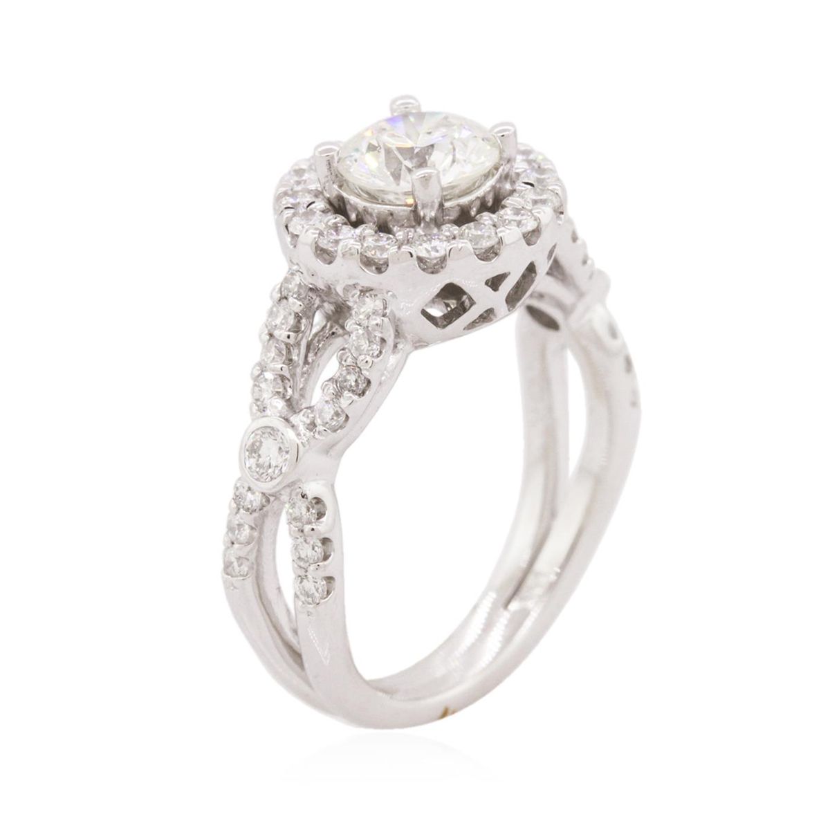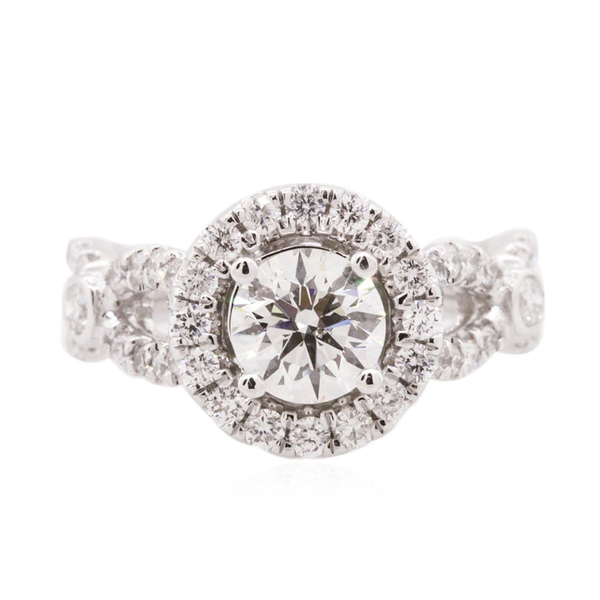 One electronically tested 14KT white gold ladies cast diamond unity ring with a bright polish finish. The featured diamond is set within a diamond bezel supported by intertwining diamond set shoulders, completed by a grooved two and one-half millimeter wide band. Identified with markings of "14K". Condition is new, good workmanship. Containing: One prong set round brilliant cut diamond, measuring 6.10 - 6.05 x 3.70mm (depth est.) approximate weight of 0.90ct. Graded in the setting. Clarity: SI-1. Color: 61.0%. Table 57.7%. Forty-Six prong and bezel set round brilliant cut diamonds, measuring 1.60 - 1.40 x 0.90mm (depth est.) approximate total weight of 46 Stones = 0.66ct. Graded in the setting. Clarity: SI-1 to SI-2. Color: F - H. Total Weight of Diamonds 1.56ct. Total Weight of Ring 5.68 grams. AIG Appraised at $17,840.00.