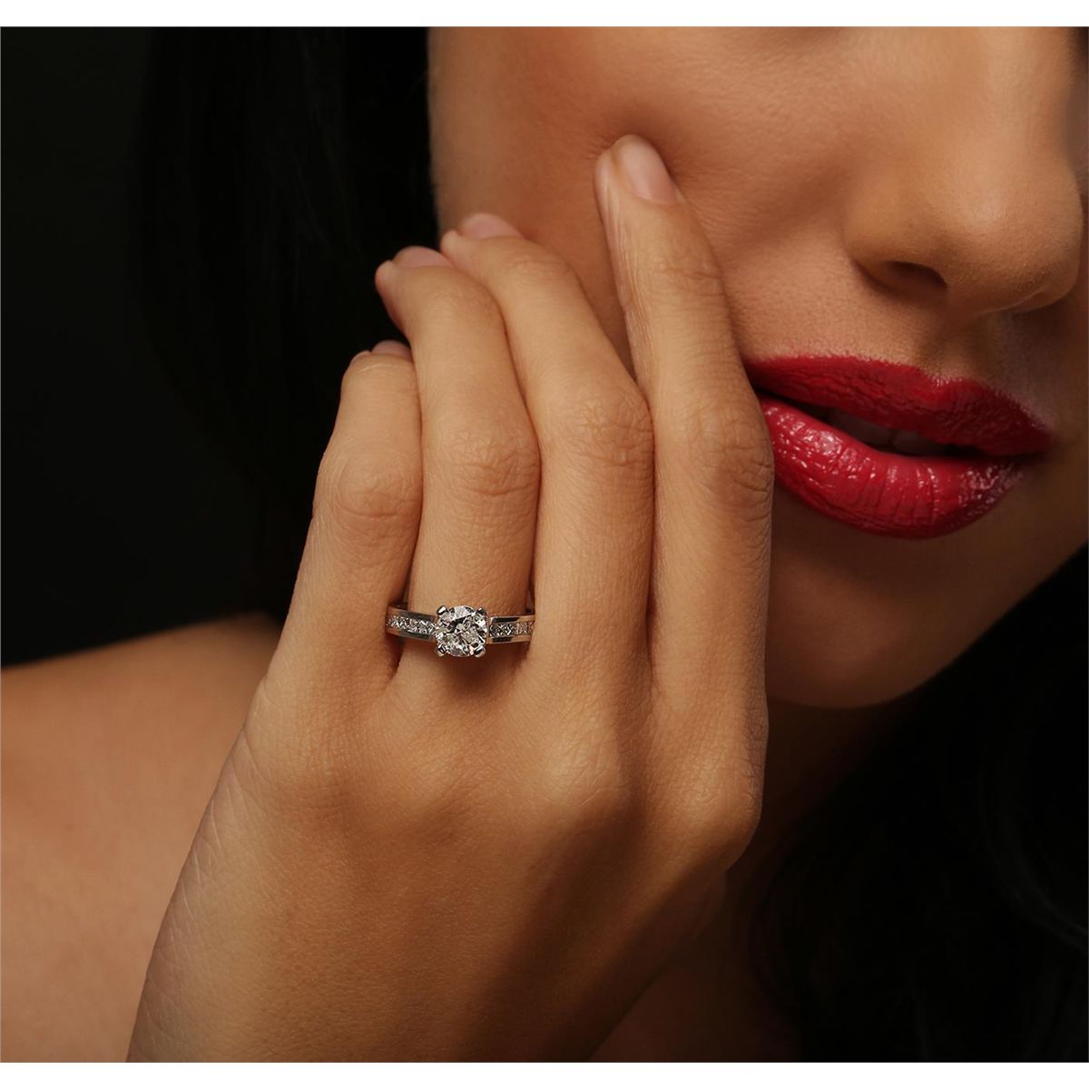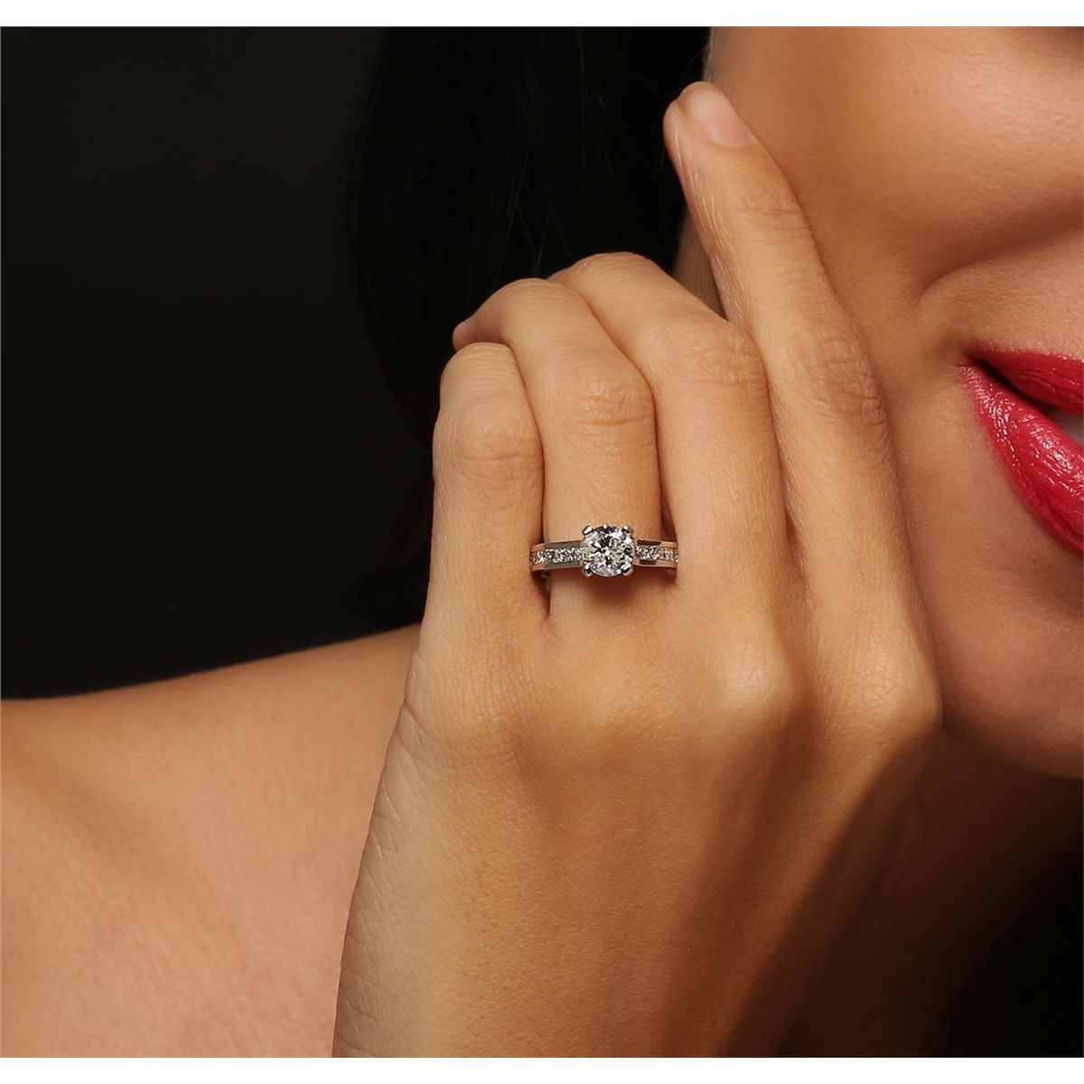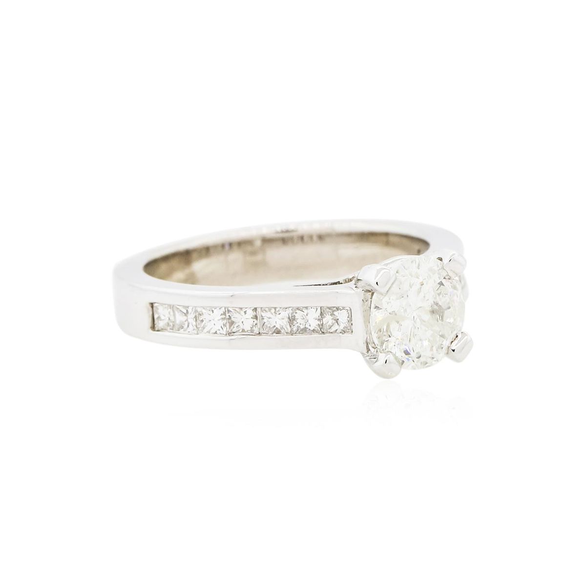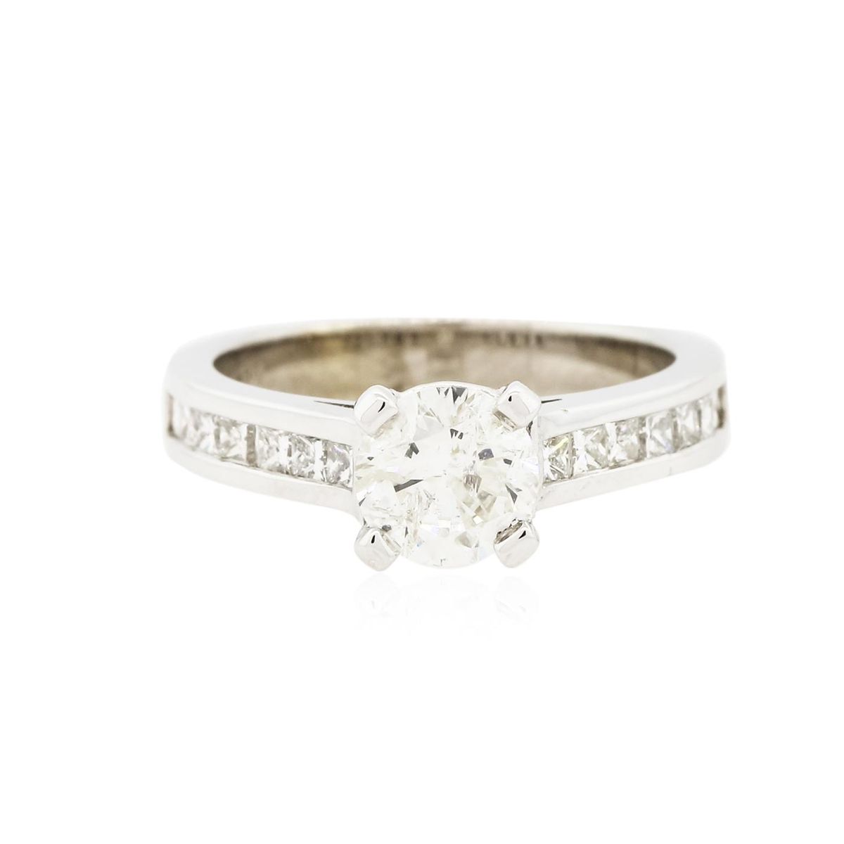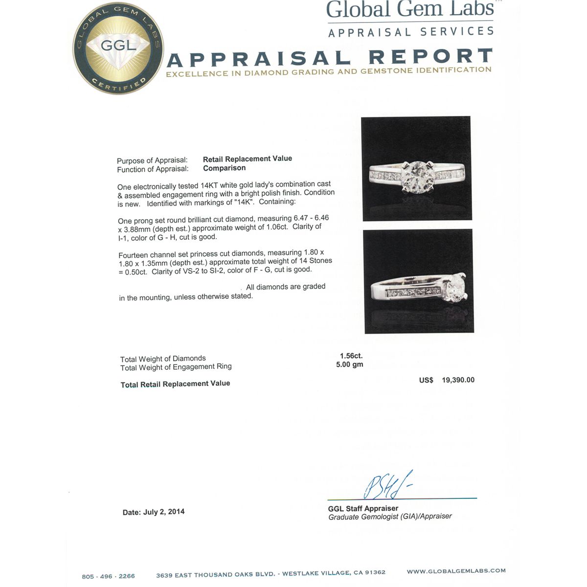 One electronically tested 14KT white gold Ladies combination cast & assembled engagement ring with a bright polish finish. Condition is new. Identified with markings of "14K". Containing: One prong set round brilliant cut diamond, measuring 6.47 - 6.46 x 3.88mm (depth est.) approximate weight of 1.06ct. Clarity: I-1. Color: G - H, Cut is Good. Fourteen channel set princess cut diamonds, measuring 1.80 x 1.80 x 1.35mm (depth est.) approximate. Total Weight of 14 Stones = 0.50ct. Clarity: VS-2 to SI-2. Color: F - G, Cut is Good. EGL USA GEM ID# US 911348409D. All diamonds are graded in the mounting, unless otherwise stated. Total Weight of Diamonds 1.56ct. Total Weight of Engagement Ring 5.00 grams. GGL Appraised at $19,390.00.