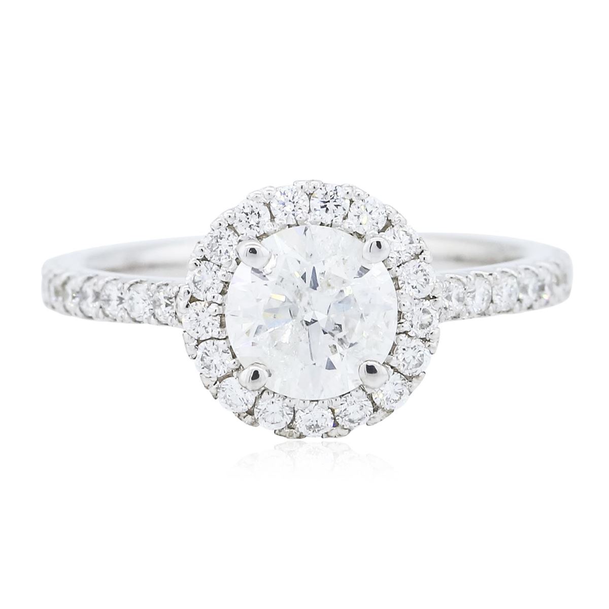 One electronically tested 14KT white gold Ladies combination cast & assembled engagement ring with a bright polish finish. Condition is new. Identified with markings of "14K". Containing: One prong set round brilliant cut diamond, measuring 6.44 - 6.43 x 4.00mm (depth est.) approximate weight of 1.02ct. Clarity: I-2. Color: F, Cut is Good. Forty-Five prong set round brilliant cut diamonds, measuring 1.50 - 1.50 x 0.90mm (depth est.) approximate. Total Weight of 45 Stones = 0.54ct. Clarity: VS-2 to SI-1. Color: F - G, Cut is Good. EGL USA GEM ID# US 911348426D. All diamonds are graded in the mounting, unless otherwise stated. Total Weight of Diamonds 1.56ct. Total Weight of Engagement Ring 2.70 grams. GGL Appraised at $12,360.00.