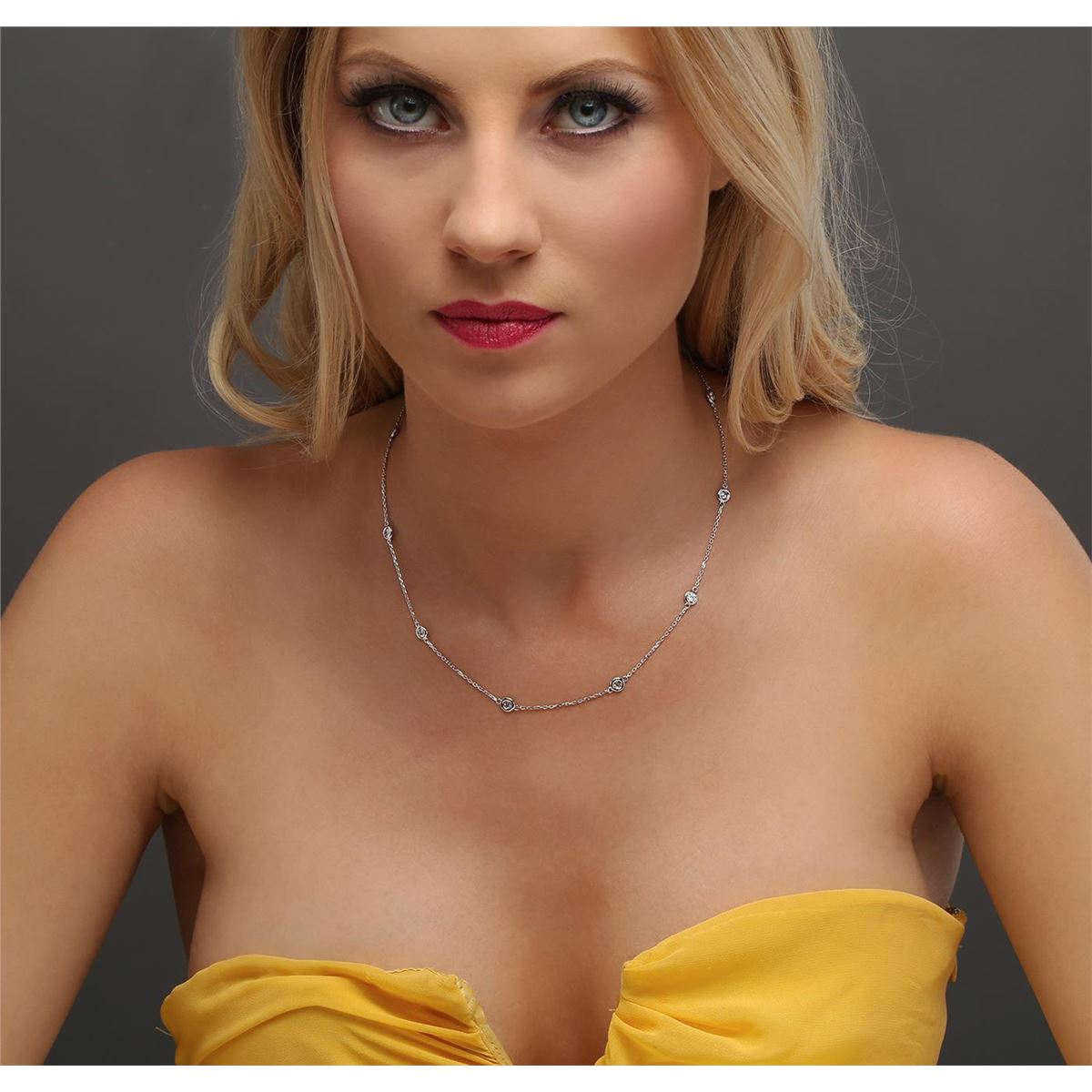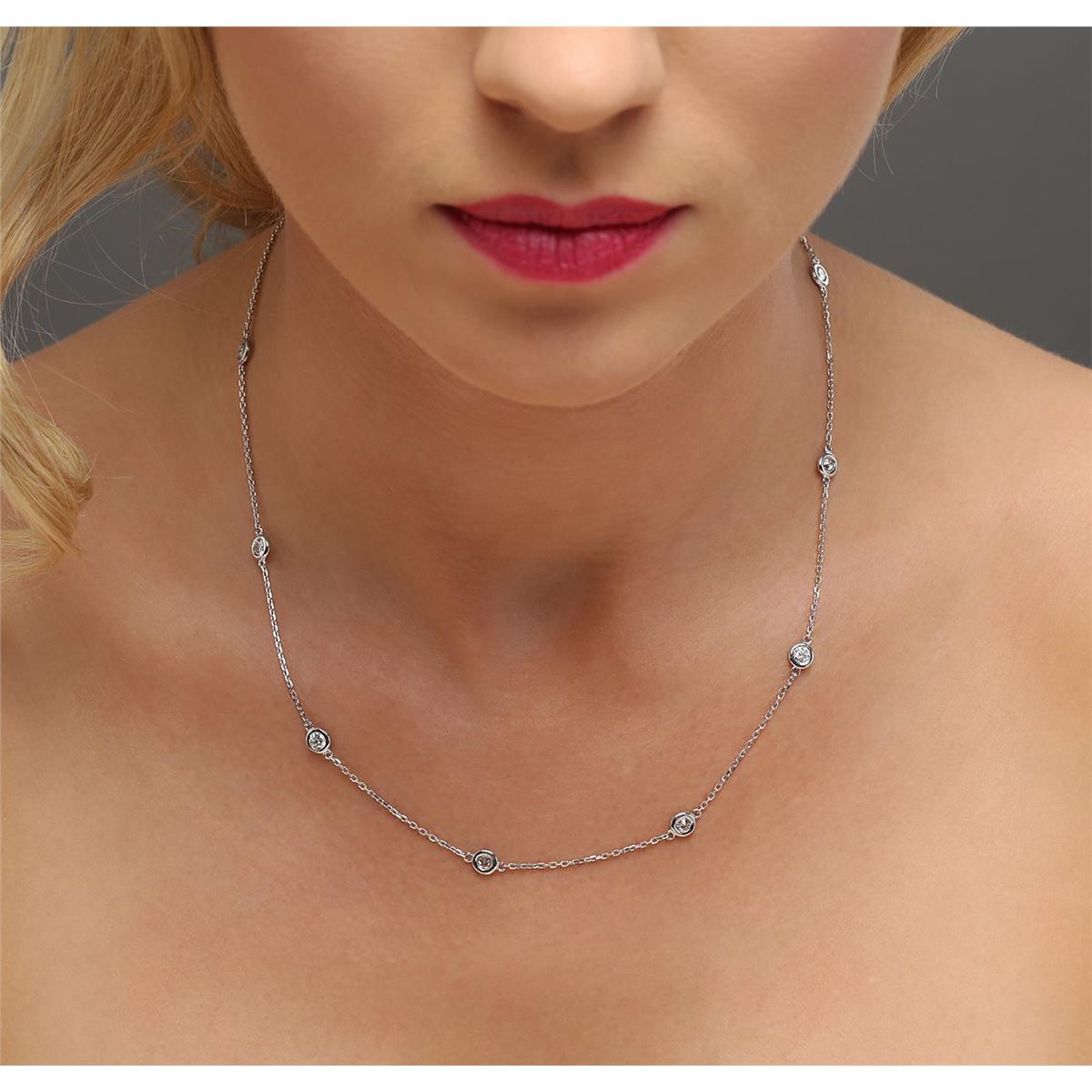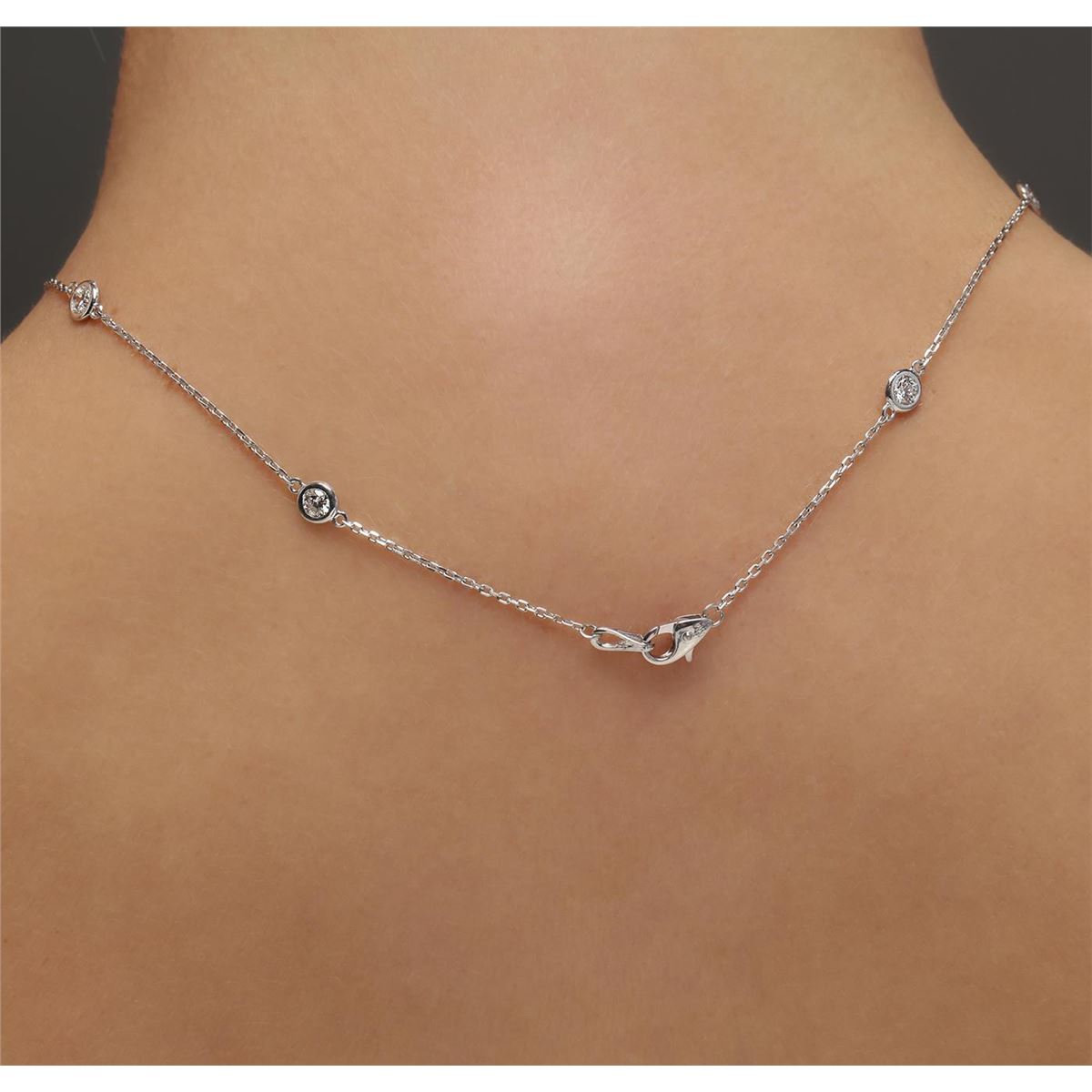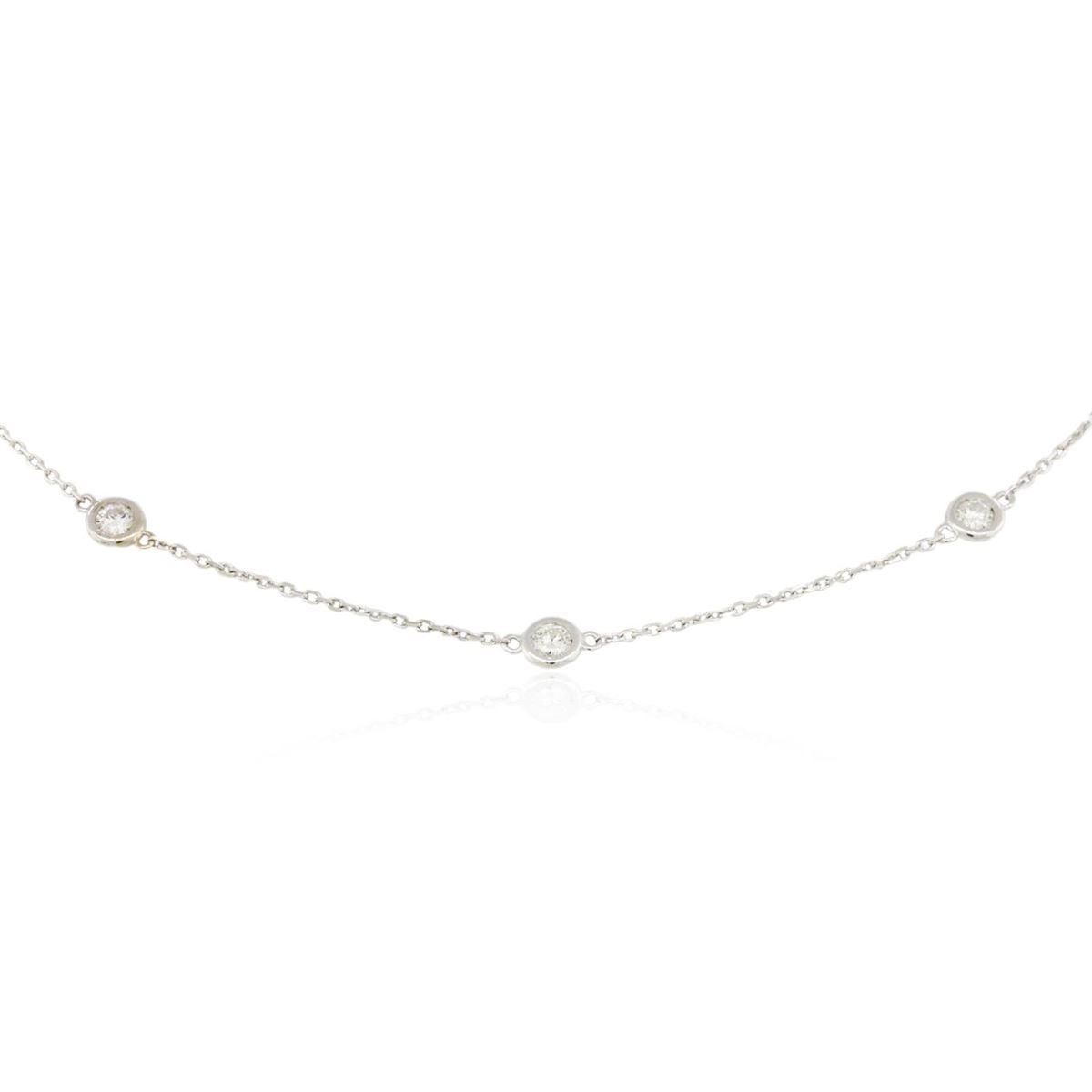 One electronically tested 14KT white gold ladies cast diamond necklace with a lobster claw clasp with a bright polish finish. Measurements: 18" in length Identified with markings of "K14". Condition is new. Containing: Ten bezel set round brilliant cut diamonds, measuring 3.50 - 3.50 x 2.10mm (depth est.) approximate total weight of 10 Stones = 1.57ct. Clarity: SI-1 to I-1. Color: J, Cut is Good. All diamonds are graded in the mounting, unless otherwise stated. Total Weight of Diamonds 1.57ct. Total Weight of Necklace 4.20 grams. GGL Appraised at $4,365.00.