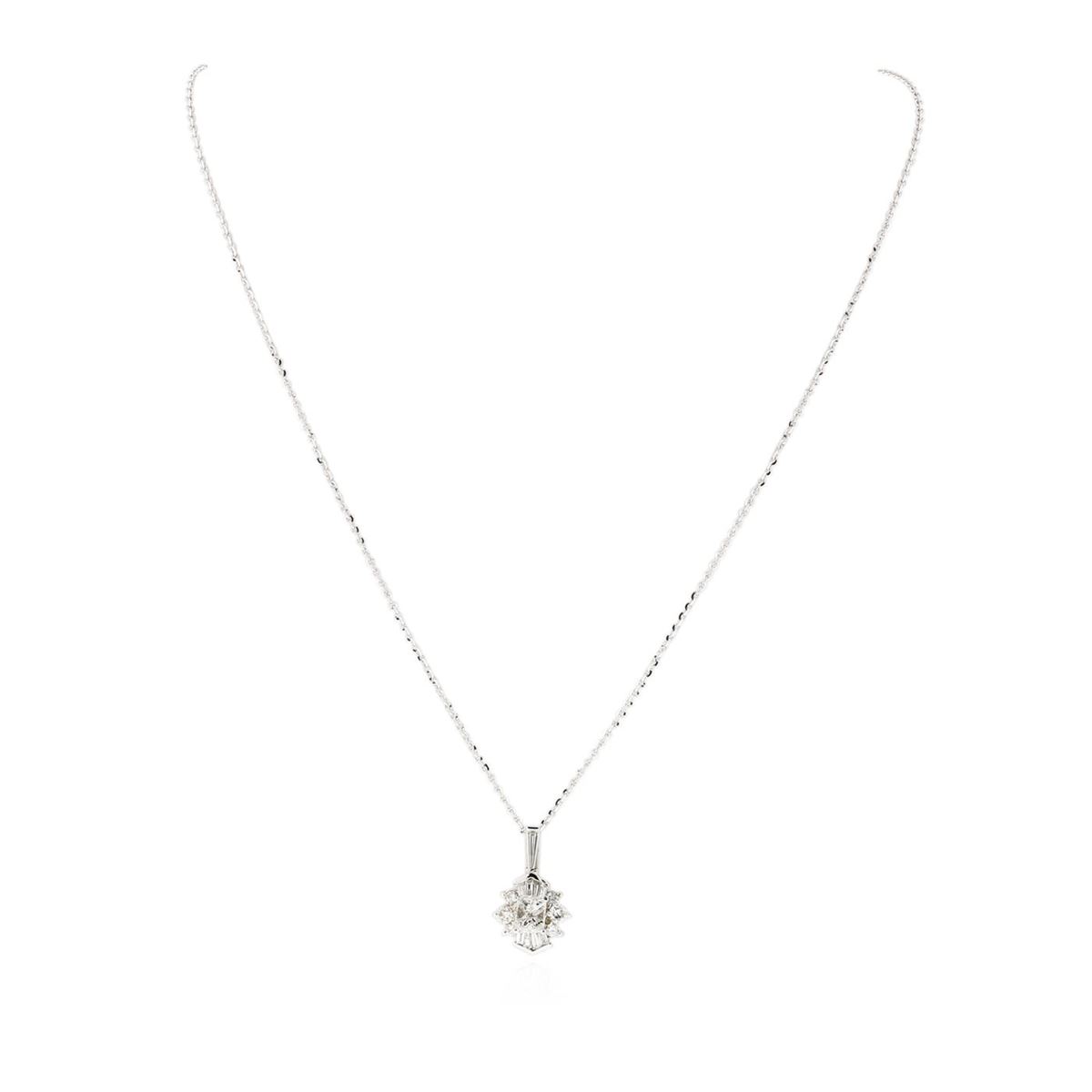 One electronically tested 14KT white gold ladies cast & assembled diamond pendant with chain. The pendant features a diamond cluster completed by a diamond set bail. The pendant is supported by an eighteen inch length 14KT white gold designer style chain terminating in a lobster claw clasp. Bright polish finish. Condition is good. Containing: One prong set princess cut diamond, measuring 5.30 x 4.90 x 3.60mm (depth est.) approximate weight of 0.78ct. Graded in the setting. Clarity: I-1. Color: GDepth 73.5%. Table 87.8%. Six prong set round brilliant cut diamonds, measuring 3.00 - 2.00 x 1.50mm (depth est.) approximate. Total Weight of 6 Stones = 0.46ct. Graded in the setting. Clarity: SI-1 to SI-2. Color: G - I Nine channel set baguette cut diamonds, measuring from 2.30 x 1.30 x 0.91mm (depth est.) to 6.80 x 1.50 x 1.05mm (depth est.) approximate. Total Weight of 9 Stones = 0.33ct. Graded in the setting. Clarity: VVS-2 to VS-2. Color: F - H. Total Weight of Diamonds 1.57ct. AIG Appraised at $10,200.00.
