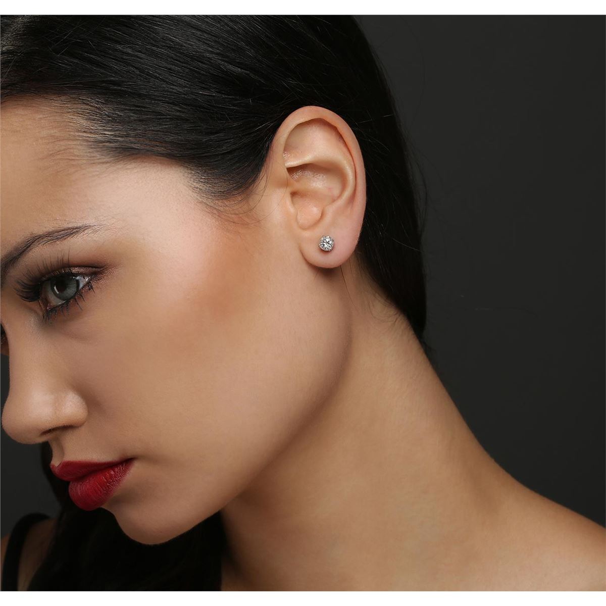 One pair electronically tested 14KT white gold cast & assembled diamond solitaire earrings with screw backs. Bright polish finish. Condition is new, good workmanship. Containing: One prong set round brilliant cut diamond, measuring 5.60 - 5.55 x 3.50mm (depth est.), 3.00% GTCF approximate weight of 0.78ct with a medium blue fluorescence. Graded in the setting. Clarity: I-1. Color: H. Depth 62.8%. Table 61.0%. One prong set round brilliant cut diamond, measuring 5.55 - 5.54 x 3.70mm (depth est.) approximate weight of 0.79ct. Graded in the setting. Clarity: I-1. Color:  66.7%. Table 59.5%. Total Weight of Diamonds 1.57ct. Total Weight of Earrings 1.10 grams. AIG Appraised at $10,380.00.