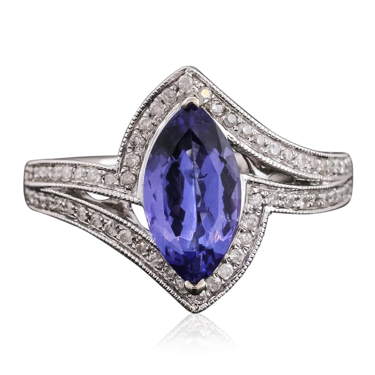 One electronically tested 14KT white gold ladies cast tanzanite and diamond ring. The featured tanzanite is set within mirroring diamond ribbons, completed by a two millimeter wide band. Bright polish finish with milgrain detailing throughout. Trademark is Orianne. Identified with markings of "14K". Condition is new, good workmanship. Containing: One prong set marquise brilliant cut natural tanzanite, measuring 11.40 x 6.00 x 3.40mm, 6% bulge factor, approximate weight of 1.57ct., clarity is eye clean, type I, medium dark, very slightly grayish, bluish violet color, (GIA bV 6/3), cut is good. Transmitting light with no distortion, transparent. Graded in the setting. Tanzanite is a very rare gemstone that is only found in the country of Tanzania. Originally discovered in 1967. Tiffany & Company, named the stone Tanzanite. It is found in the Usumburu Mountains that border the Umba Valley of northern Tanzania. Tanzanite occurs in gray, brown, violet, blue, reddish-purple, & green. The gem is interesting because of its exceptional pleochroism. Rotated in different directions a tanzanite will exhibit multiple changes of color. Tanzanite has a low tolerance to ultrasonic cleaning, and should not be cleaned using this method. Sixty prong set round brilliant cut diamonds, measuring 1.00 - 0.90 x 0.57mm (depth est.) approximate total weight of 60 Stones = 0.28ct. Graded in the setting. Clarity: I-2 to I-3. Color: G - I. Total Weight of Colored Stones 1.57ct. Total Weight of Diamonds 0.28ct. Total Weight of Ring 3.74 grams. AIG Appraised at $4,535.00.