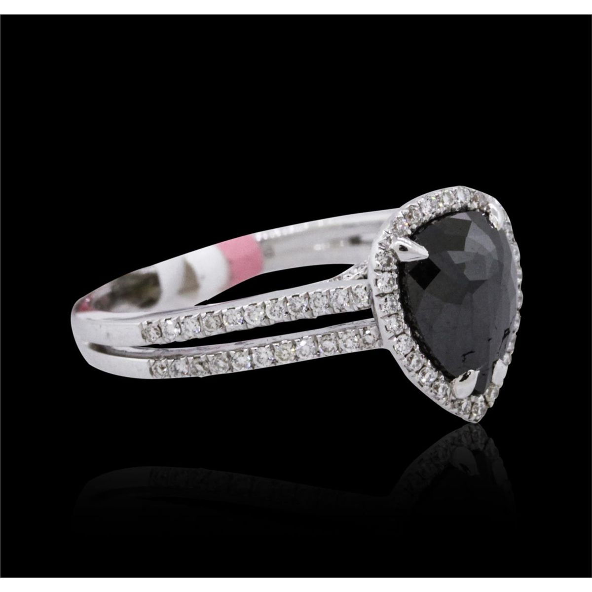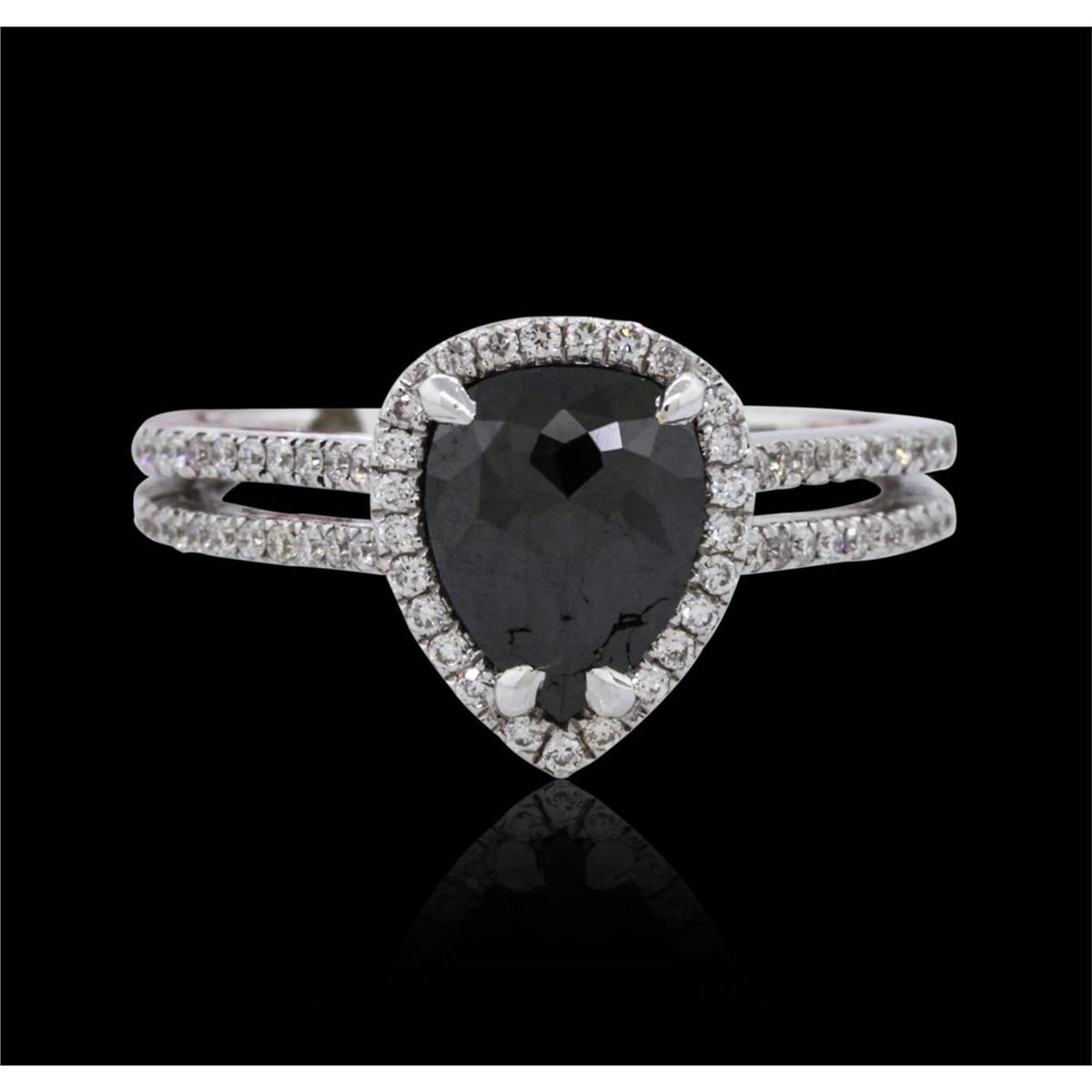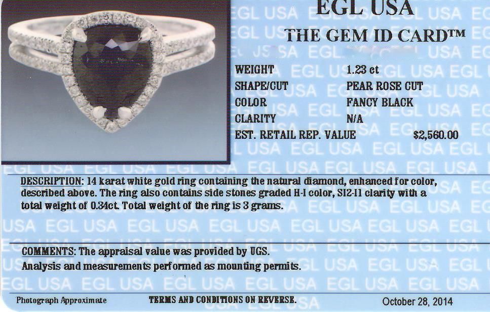 One 14KT white gold ring containing one natural pear rose cut fancy black diamond, enhanced for color, with a total weight of 1.23ct. The ring also contains side stones graded H-I color, SI2-I1 clarity with a total weight of 0.34ct. Total weight of the ring is 3.00 grams. EGL USA Appraised.