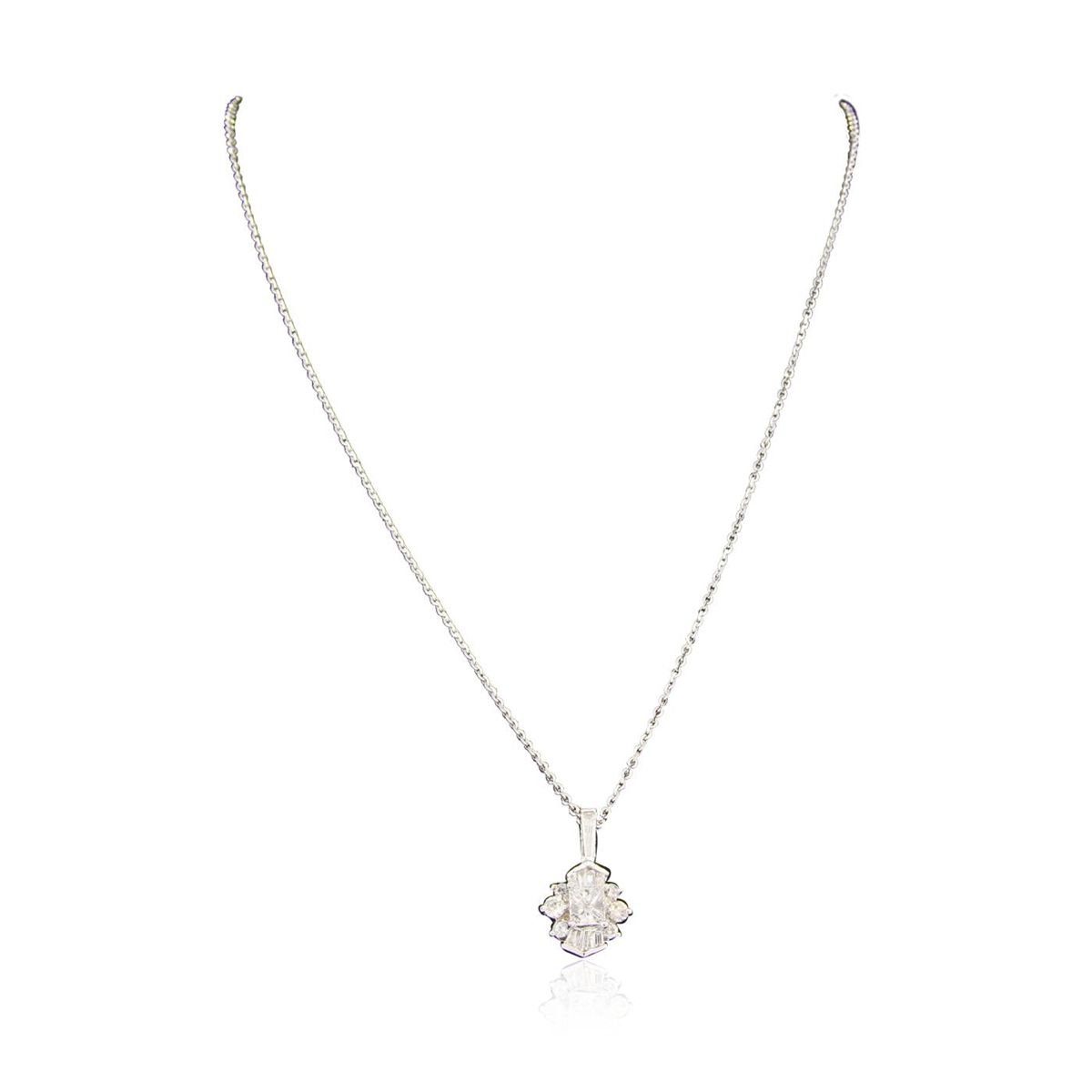One electronically tested 14KT white gold ladies cast & assembled diamond pendant with chain. The pendant features a diamond cluster completed by a diamond set bail. The pendant is supported by an eighteen inch length 14KT white gold designer style chain terminating in a lobster claw clasp. Bright polish finish. Condition is good. Containing: One prong set princess cut diamond, measuring 5.30 x 4.90 x 3.60mm (depth est.) approximate weight of 0.78ct. Graded in the setting. Clarity: I-1. Color: GDepth 73.5%. Table 87.8%. Six prong set round brilliant cut diamonds, measuring 3.00 - 2.00 x 1.50mm (depth est.) approximate. Total Weight of 6 Stones = 0.46ct. Graded in the setting. Clarity: SI-1 to SI-2. Color: G - I Nine channel set baguette cut diamonds, measuring from 2.30 x 1.30 x 0.91mm (depth est.) to 6.80 x 1.50 x 1.05mm (depth est.) approximate. Total Weight of 9 Stones = 0.33ct. Graded in the setting. Clarity: VVS-2 to VS-2. Color: F - H. Total Weight of Diamonds 1.57ct. AIG Appraised at $10,200.00.