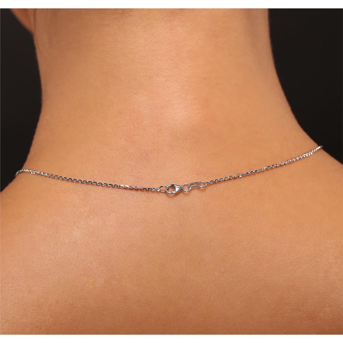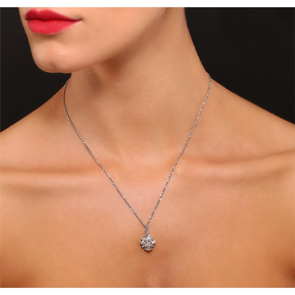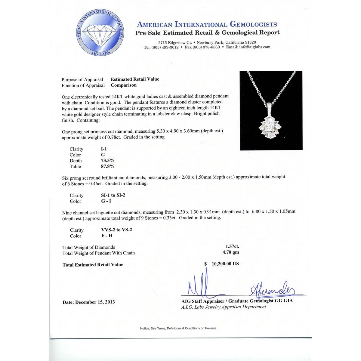 One electronically tested 14KT white gold ladies cast & assembled diamond pendant with chain. The pendant features a diamond cluster completed by a diamond set bail. The pendant is supported by an eighteen inch length 14KT white gold designer style chain terminating in a lobster claw clasp. Bright polish finish. Condition is good. Containing: One prong set princess cut diamond, measuring 5.30 x 4.90 x 3.60mm (depth est.) approximate weight of 0.78ct. Graded in the setting. Clarity: I-1. Color: GDepth 73.5%. Table 87.8%. Six prong set round brilliant cut diamonds, measuring 3.00 - 2.00 x 1.50mm (depth est.) approximate. Total Weight of 6 Stones = 0.46ct. Graded in the setting. Clarity: SI-1 to SI-2. Color: G - I Nine channel set baguette cut diamonds, measuring from 2.30 x 1.30 x 0.91mm (depth est.) to 6.80 x 1.50 x 1.05mm (depth est.) approximate. Total Weight of 9 Stones = 0.33ct. Graded in the setting. Clarity: VVS-2 to VS-2. Color: F - H. Total Weight of Diamonds 1.57ct. AIG Appraised at $10,200.00.