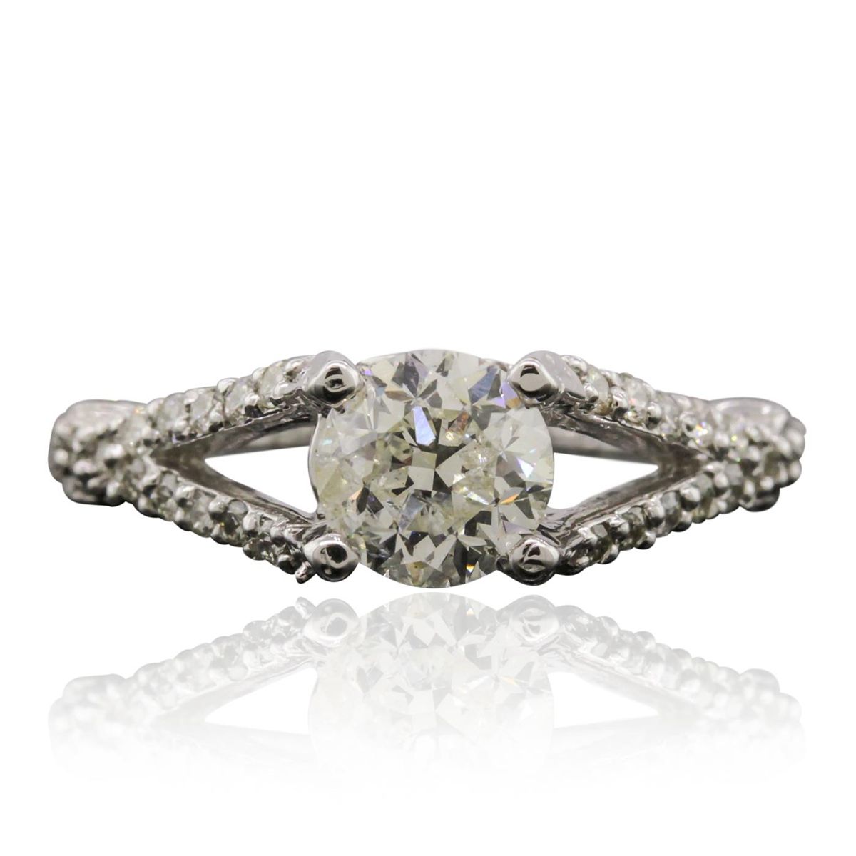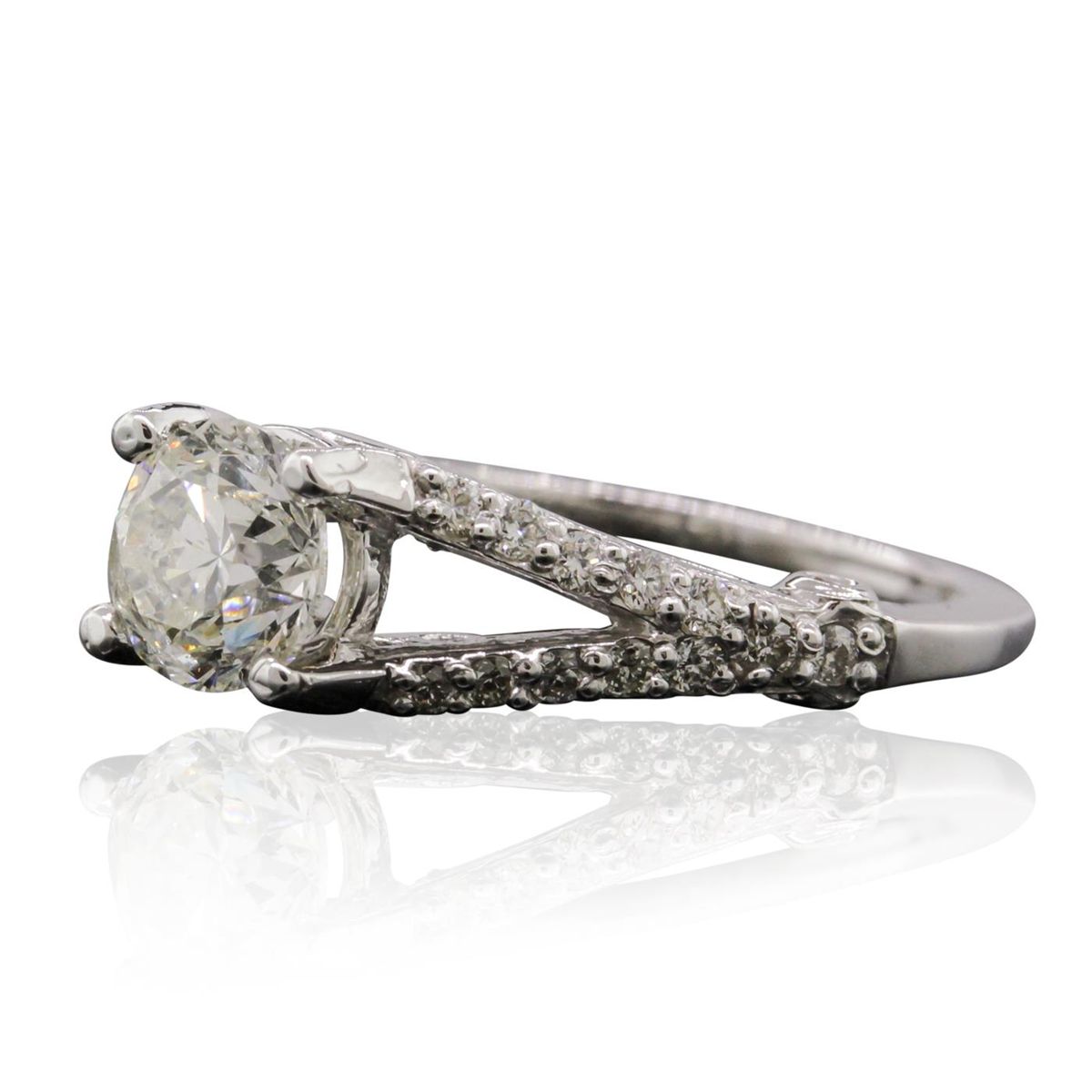 One electronically tested 14KT white gold Ladies combination cast & assembled engagement ring with a bright polish finish. Condition is new. Identified with markings of "14K". Containing: One prong set round brilliant cut diamond, measuring 6.24 - 6.22 x 4.31mm (depth est.) approximate. Total Weight of 1.13ct. Clarity: I-1. Color: G, Cut is Good. Twenty-Eight prong set round brilliant cut diamonds, measuring 1.50 - 1.50 x 0.90mm (depth est.) approximate. Total Weight of 28 Stones = 0.34ct. Clarity: SI-1 to SI-3. Color: G - H, Cut is Good. Two prong set princess cut diamonds, measuring 2.00 x 2.00 x 1.50mm (depth est.) approximate. Total Weight of 2 Stones = 0.10ct. Clarity: SI-1 to SI-3. Color: G - H, Cut is Good. EGL USA GEM ID# US 911348438D. All diamonds are graded in the mounting, unless otherwise stated. Total Weight of Diamonds 1.57ct. Total Weight of Engagement Ring 3.70 grams. GGL Appraised at $21,215.00.