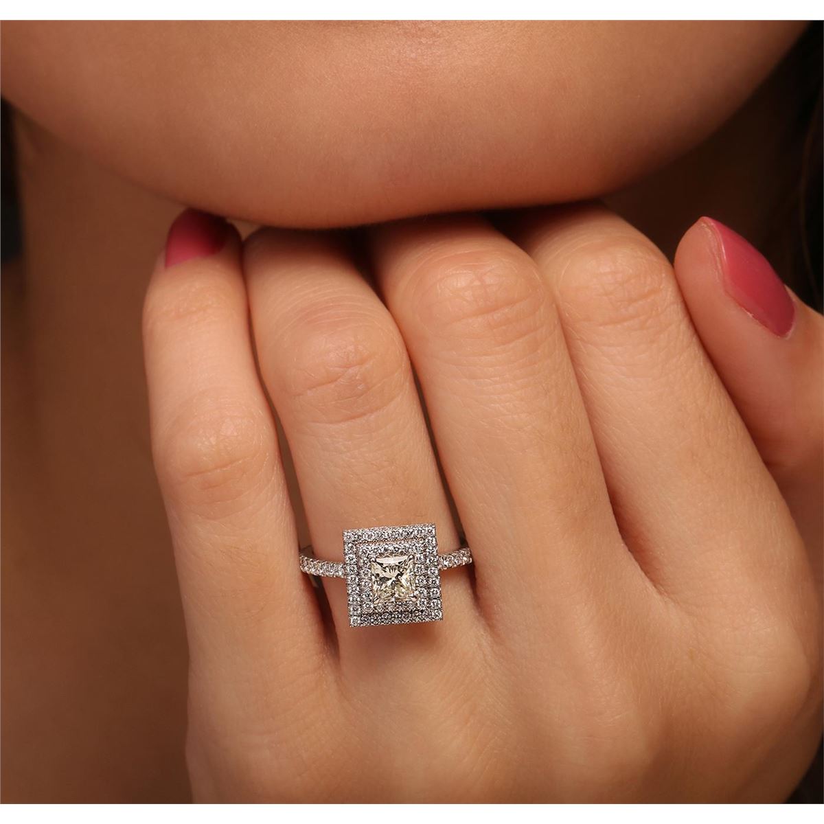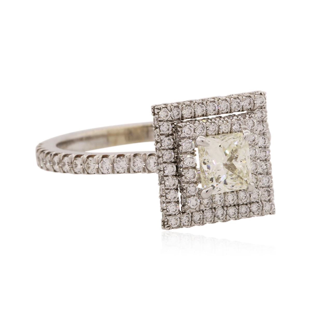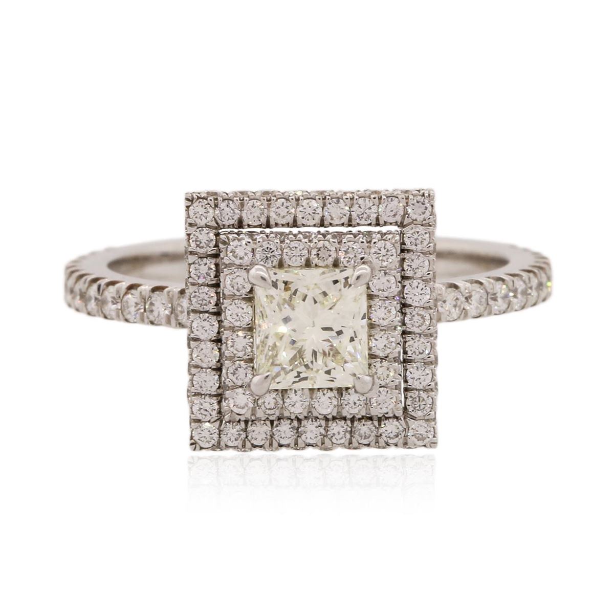 One electronically tested 14KT white gold Ladies combination cast & assembled engagement ring with a bright polish finish. Condition is very good. Containing: One prong set princess cut diamond, measuring 4.70 x 4.40 x 3.50mm (depth est.) approximate weight of 0.59ct. Clarity: VS-1. Color: L, Cut is Very Good. One Hundred Twenty-Two bead set round brilliant cut diamonds, measuring 1.30 - 1.30 x 0.78mm (depth est.) approximate. Total Weight of 122 Stones = 0.98ct. Clarity: SI-2 to I-1. Color: I - J, Cut is Good. All diamonds are graded in the mounting, unless otherwise stated. Total Weight of Diamonds 1.57ct. Total Weight of Engagement Ring 3.40 grams.. GGL Appraised at $7,115.00.