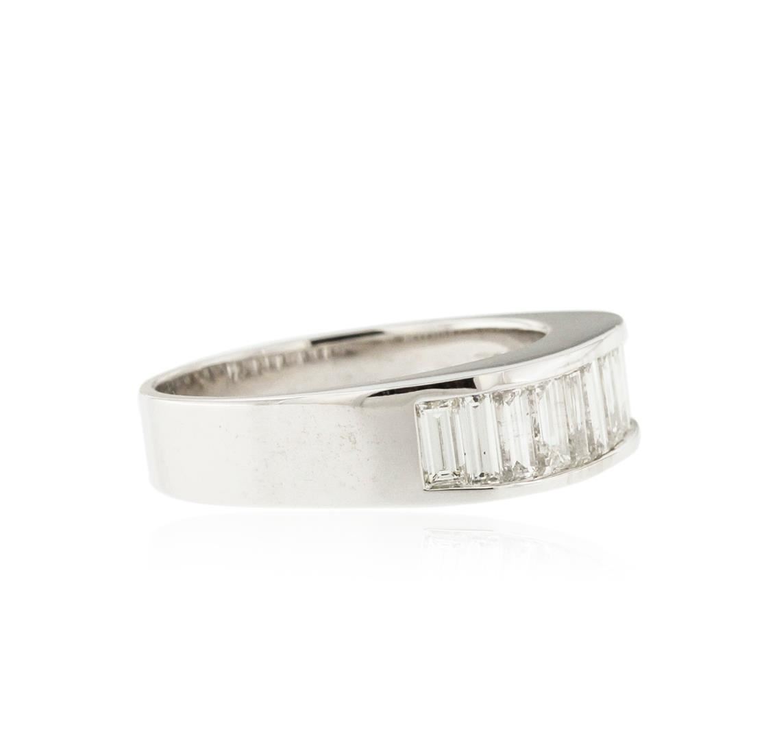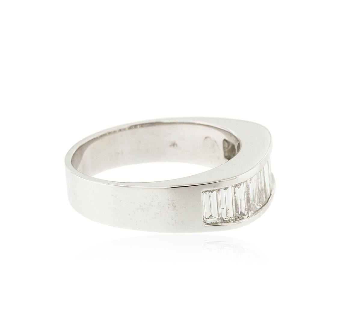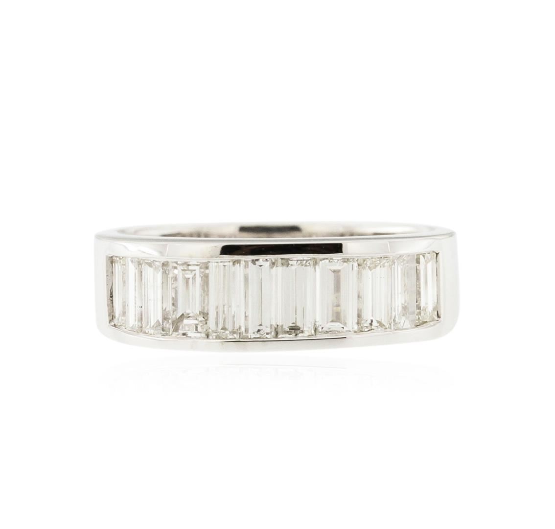 One electronically tested 14KT white gold ladies cast diamond ring with a bright polish finish. The ring features a diamond set curvature, completed by a four and one-half millimeter wide band. Identified with markings of "14K". Condition is good. Containing: Eleven channel set baguette cut diamonds, measuring from 4.30 x 2.20 x 1.54mm (depth est.) to 4.60 x 2.30 x 1.61mm (depth est.) approximate total weight of 11 Stones = 1.58ct. Graded in the setting. Clarity: VS-1 to VS-2. Color: F - H. Total Weight of Diamonds 1.58ct. Total Weight of Ring 6.27 grams. AIG Appraised at $6,895.00.