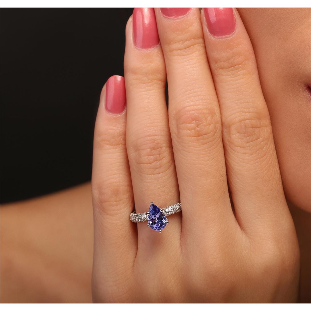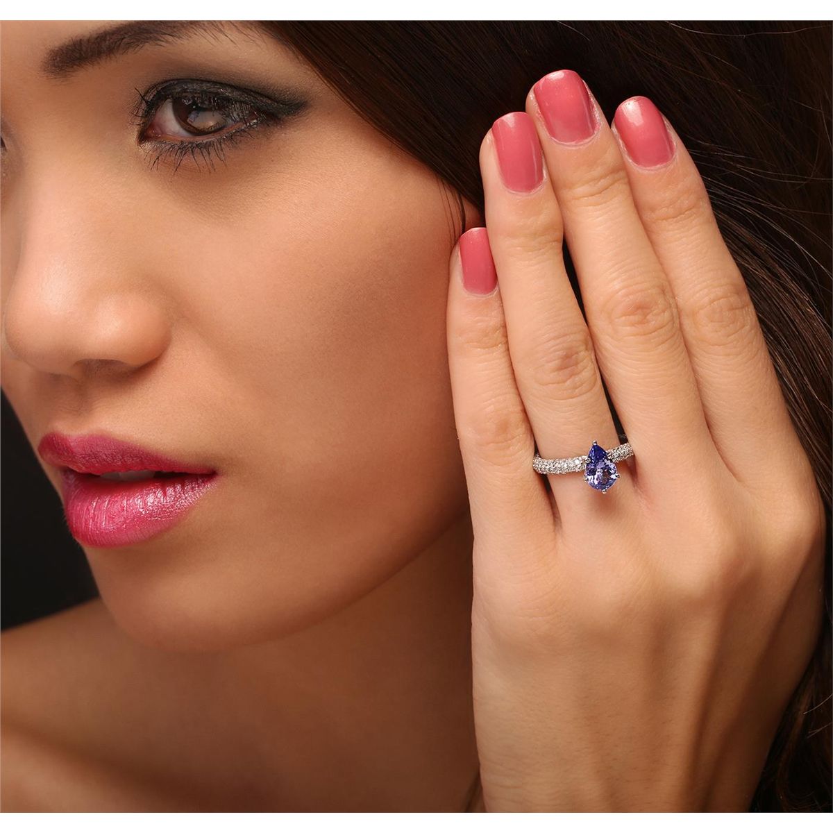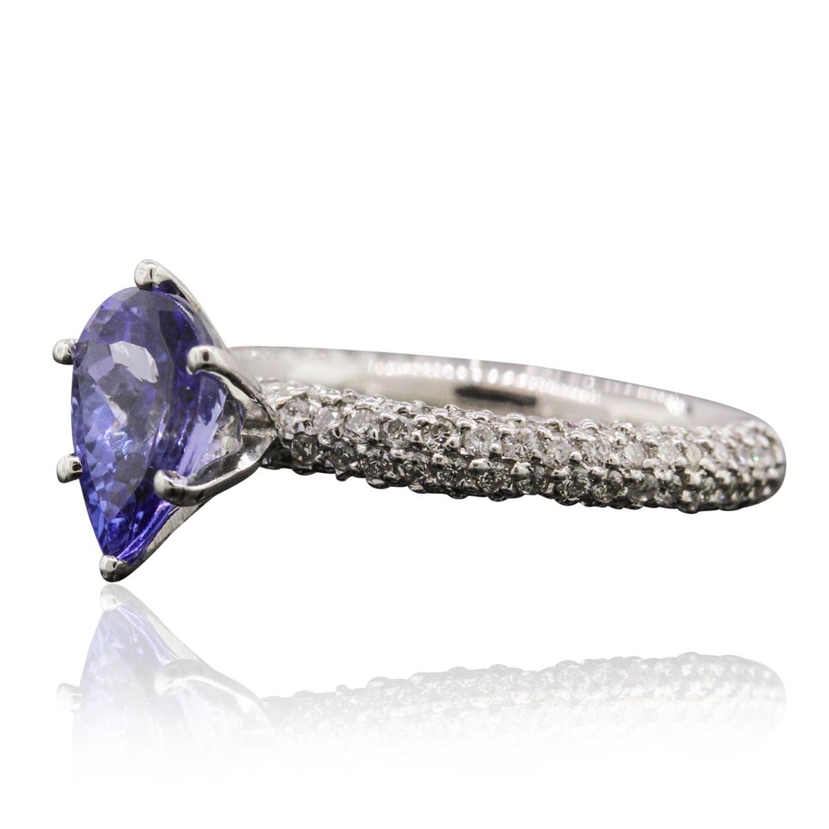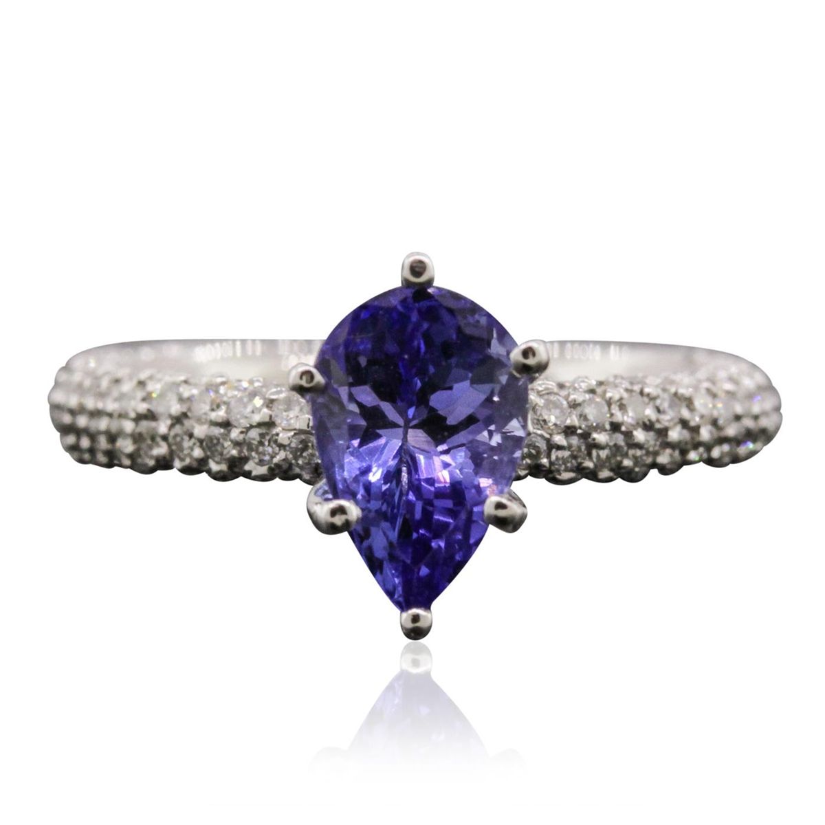 One electronically tested 14KT white gold ladies cast tanzanite and diamond ring with a bright polish finish. The featured tanzanite is supported by diamond set shoulders, completed by a three millimeter wide band. Identified with markings of "14K". Condition is new, good workmanship. Containing: One prong set pear brilliant cut natural tanzanite, measuring 9.00 x 5.80 x 4.00mm, 6%. bulge factor, approximate weight of 1.58ct., clarity is eye clean, type I, medium dark, moderately strong, bluish violet color, (GIA bV 6/4), cut is good. Transmitting light with no distortion, transparent. Graded in the setting. Tanzanite is a very rare gemstone that is only found in the country of Tanzania. Originally discovered in 1967. Tiffany & Company, named the stone Tanzanite. It is found in the Usumburu Mountains that border the Umba Valley of northern Tanzania. Tanzanite occurs in gray, brown, violet, blue, reddish-purple, & green. The gem is interesting because of its exceptional pleochroism. Rotated in different directions a tanzanite will exhibit multiple changes of color. Tanzanite has a low tolerance to ultrasonic cleaning, and should not be cleaned using this method. One Hundred Twenty-Eight pave set round brilliant cut diamonds, measuring 1.30 - 1.20 x 0.75mm (depth est.) approximate total weight of 128 Stones = 0.96ct. Graded in the setting. Clarity: SI-1 to I-1. Color: G - I. Total Weight of Colored Stones 1.58ct. Total Weight of Diamonds 0.96ct. Total Weight of Ring 3.56 grams. AIG Appraised at $7,155.00.