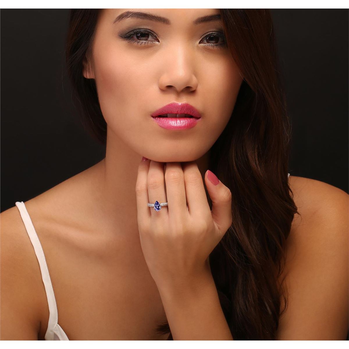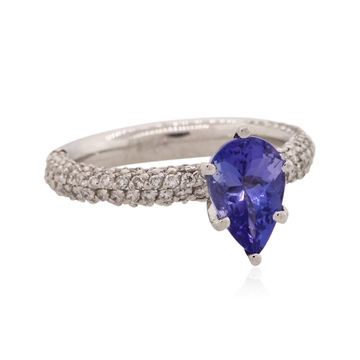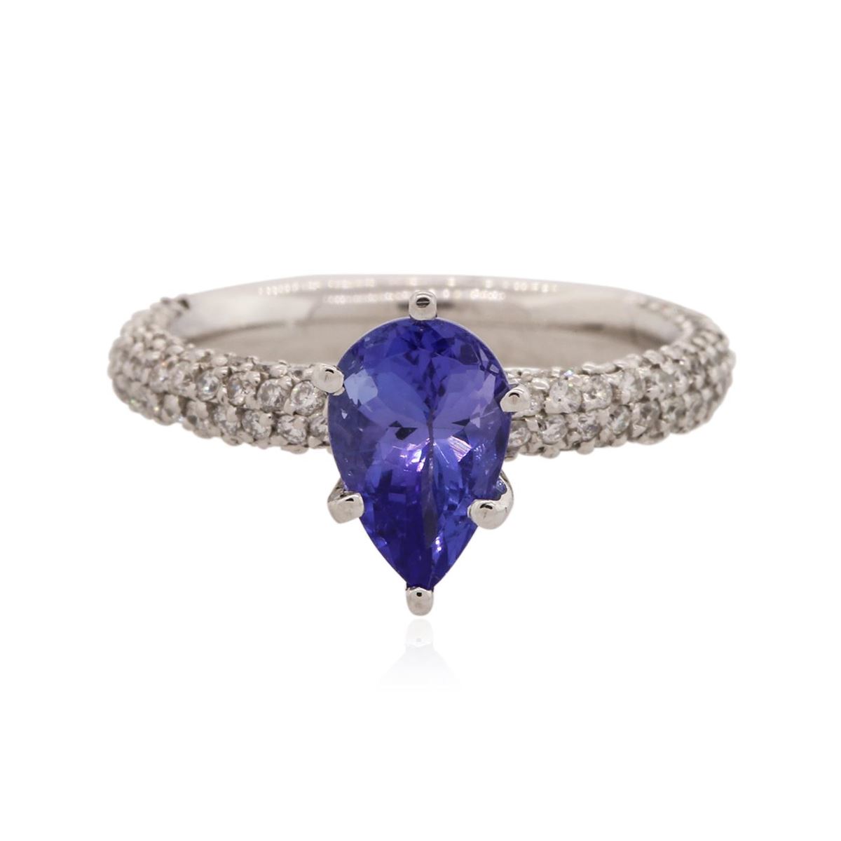 One electronically tested 14KT white gold ladies cast tanzanite and diamond ring with a bright polish finish. The featured tanzanite is supported by diamond set shoulders, completed by a three millimeter wide band. Identified with markings of "14K". Condition is new, good workmanship. Containing: One prong set pear brilliant cut natural tanzanite, measuring 9.00 x 5.80 x 4.00mm, 6%. bulge factor, approximate weight of 1.58ct., clarity is eye clean, type I, medium dark, moderately strong, bluish violet color, (GIA bV 6/4), cut is good. Transmitting light with no distortion, transparent. Graded in the setting. Tanzanite is a very rare gemstone that is only found in the country of Tanzania. Originally discovered in 1967. Tiffany & Company, named the stone Tanzanite. It is found in the Usumburu Mountains that border the Umba Valley of northern Tanzania. Tanzanite occurs in gray, brown, violet, blue, reddish-purple, & green. The gem is interesting because of its exceptional pleochroism. Rotated in different directions a tanzanite will exhibit multiple changes of color. Tanzanite has a low tolerance to ultrasonic cleaning, and should not be cleaned using this method. One Hundred Twenty-Eight pave set round brilliant cut diamonds, measuring 1.30 - 1.20 x 0.75mm (depth est.) approximate total weight of 128 Stones = 0.96ct. Graded in the setting. Clarity: SI-1 to I-1. Color: G - I. Total Weight of Colored Stones 1.58ct. Total Weight of Diamonds 0.96ct. Total Weight of Ring 3.56 grams. AIG Appraised at $7,155.00.