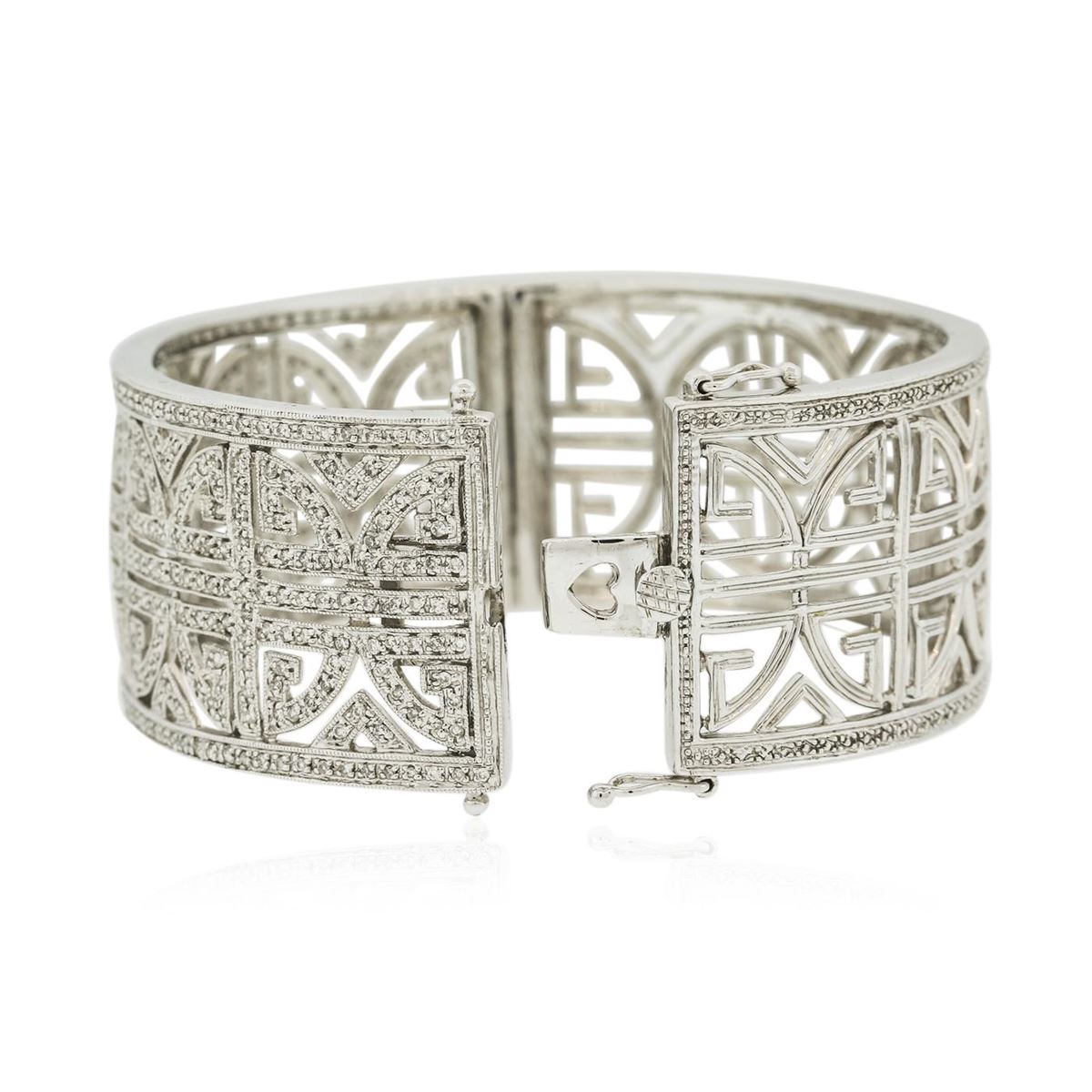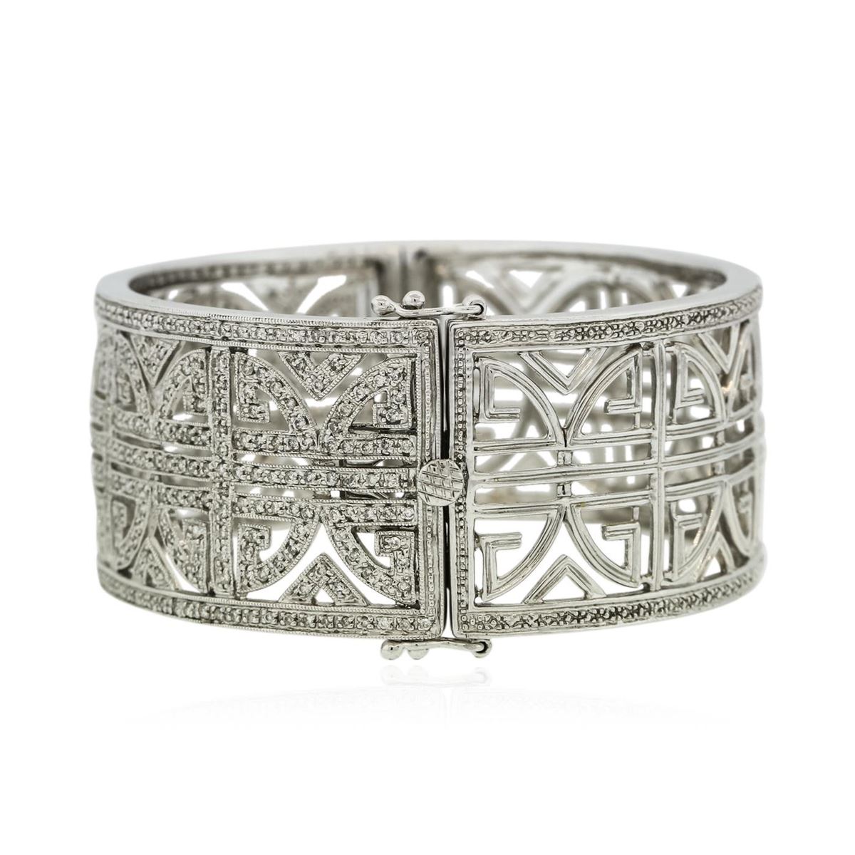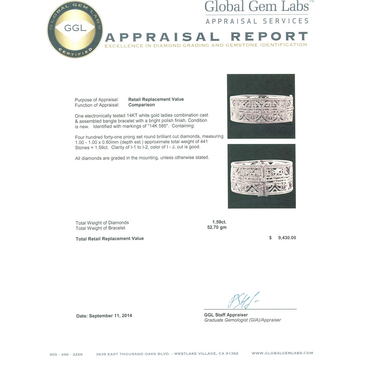 One electronically tested 14KT white gold ladies combination cast & assembled bangle bracelet with a bright polish finish. Identified with markings of "14K 585". Condition is new. Containing: Four Hundred Forty-One prong set round brilliant cut diamonds, measuring 1.00 - 1.00 x 0.60mm (depth est.) approximate total weight of 441 Stones = 1.59ct. Clarity: I-1 to I-2. Color: I - J, Cut is Good. All diamonds are graded in the mounting, unless otherwise stated. Total Weight of Diamonds 1.59ct. Total Weight of Bracelet 52.70 grams. GGL Appraised at $9,430.00.