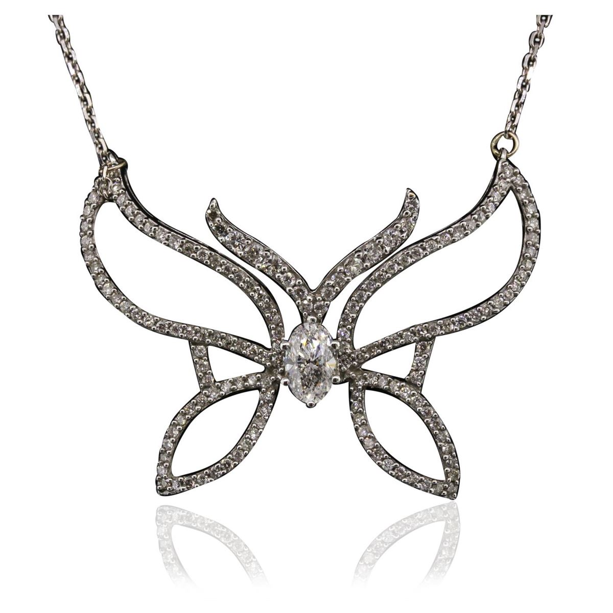 One electronically tested 14KT white gold ladies cast & assembled diamond butterfly necklace with a bright polish finish. The necklace features an open diamond set butterfly design supported by an eighteen inch length designer style chain, terminating in a spring ring clasp. Identified with markings of "14K". Condition is new, good workmanship. Containing: One prong set oval shaped cut diamond, measuring 6.60 x 4.10 x 2.40mm (depth est.) approximate weight of 0.52ct. Graded in the setting. Clarity: SI-1. Color: G. Depth 58.5%. Table 51.2%. One Hundred Fifty-Four prong set round brilliant cut diamonds, measuring 1.30 - 1.10 x 0.72mm (depth est.) approximate total weight of 154 Stones = 1.07ct. Graded in the setting. Clarity: SI-1 to I-1. Color: G - I. Total Weight of Diamonds 1.59ct. Total Weight of Necklace 5.79 grams. AIG Appraised at $9,555.00.