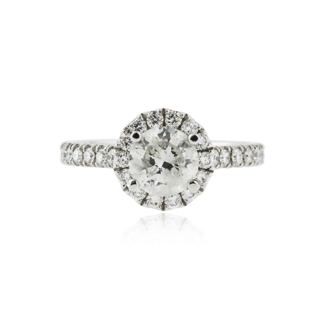 One electronically tested 14KT white gold Ladies combination cast & assembled engagement ring with a bright polish finish. Condition is new. Identified with markings of "14K". Containing: One prong set round brilliant cut diamond, measuring 6.51 - 6.51 x 4.00mm (depth est.) approximate weight of 1.07ct. Clarity: I-1. Color: F, Cut is Good. Thirty prong set round brilliant cut diamonds, measuring 1.70 - 1.70 x 1.02mm (depth est.) approximate. Total Weight of 30 Stones = 0.52ct. Clarity: VS-2 to SI-2. Color: F - G, Cut is Good. EGL USA GEM ID# US 911348412D. All diamonds are graded in the mounting, unless otherwise stated. Total Weight of Diamonds 1.59ct. Total Weight of Engagement Ring 3.20 grams. GGL Appraised at $20,920.00.