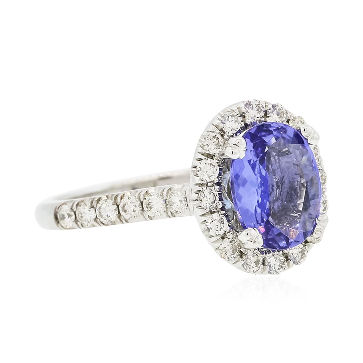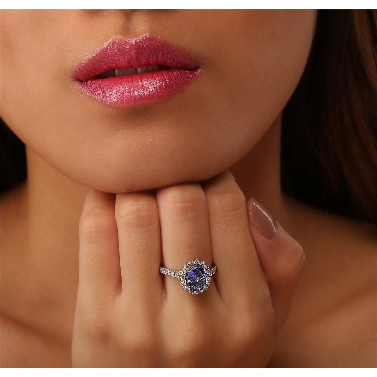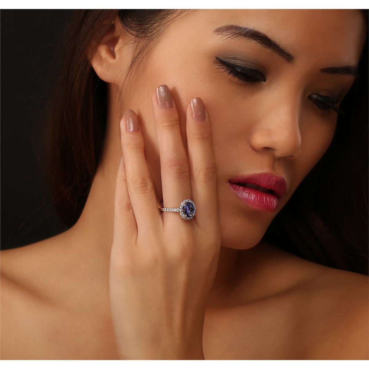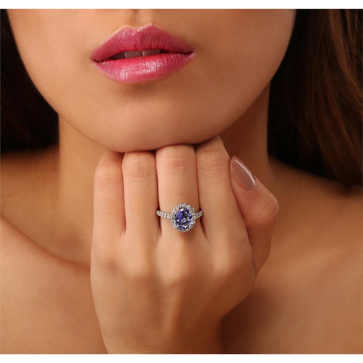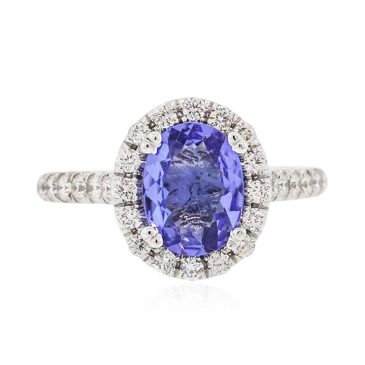 One electronically tested 14KT white gold ladies combination cast & assembled ring with a bright polish finish. Condition is new. Identified with markings of "14K". Containing: One prong set oval modified brilliant cut natural tanzanite, measuring 9.00 x 6.90 x 3.75mm, approximate weight of 1.59ct., clarity is eye clean, type I, medium light, very slightly grayish, violet color, (GIA V 4/3), cut is good. Twenty-Eight prong set round brilliant cut diamonds, measuring 1.70 - 1.70 x 1.02mm (depth est.) approximate total weight of 28 Stones = 0.50ct. Clarity: SI-2 to I-1. Color: I - J, Cut is Good. Colored gemstones are presumed to have been subjected to commonly used enhancement processes. All diamonds and colored gemstones are graded in the mounting, unless otherwise stated. Total Weight of Colored Stones 1.59ct. Total Weight of Diamonds 0.50ct. Total Weight of Ring 4.60 grams. GGL Appraised at $4,975.00.