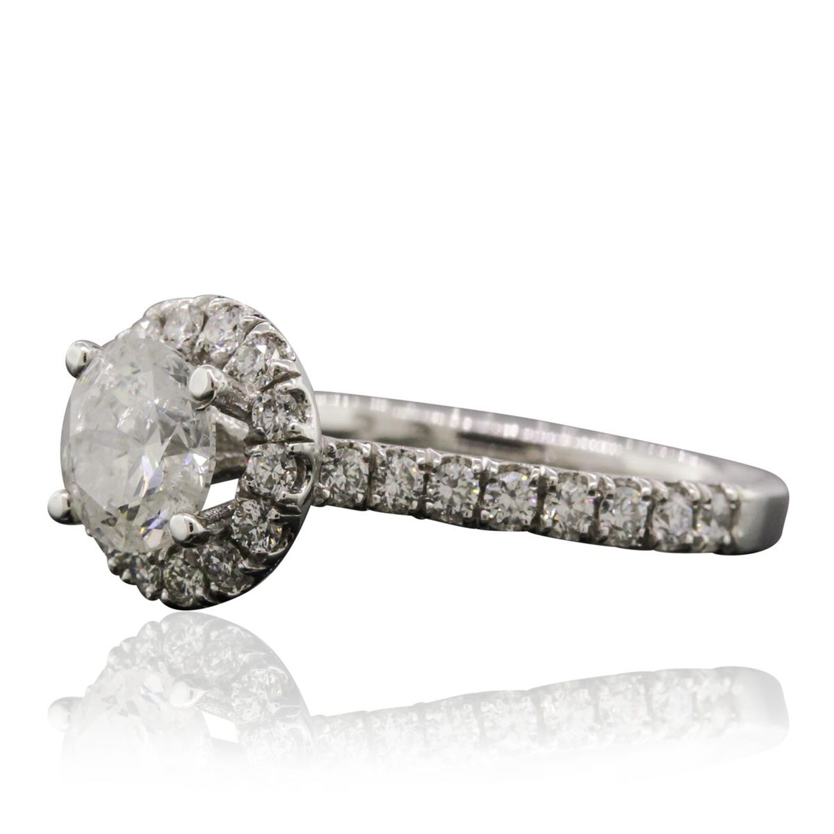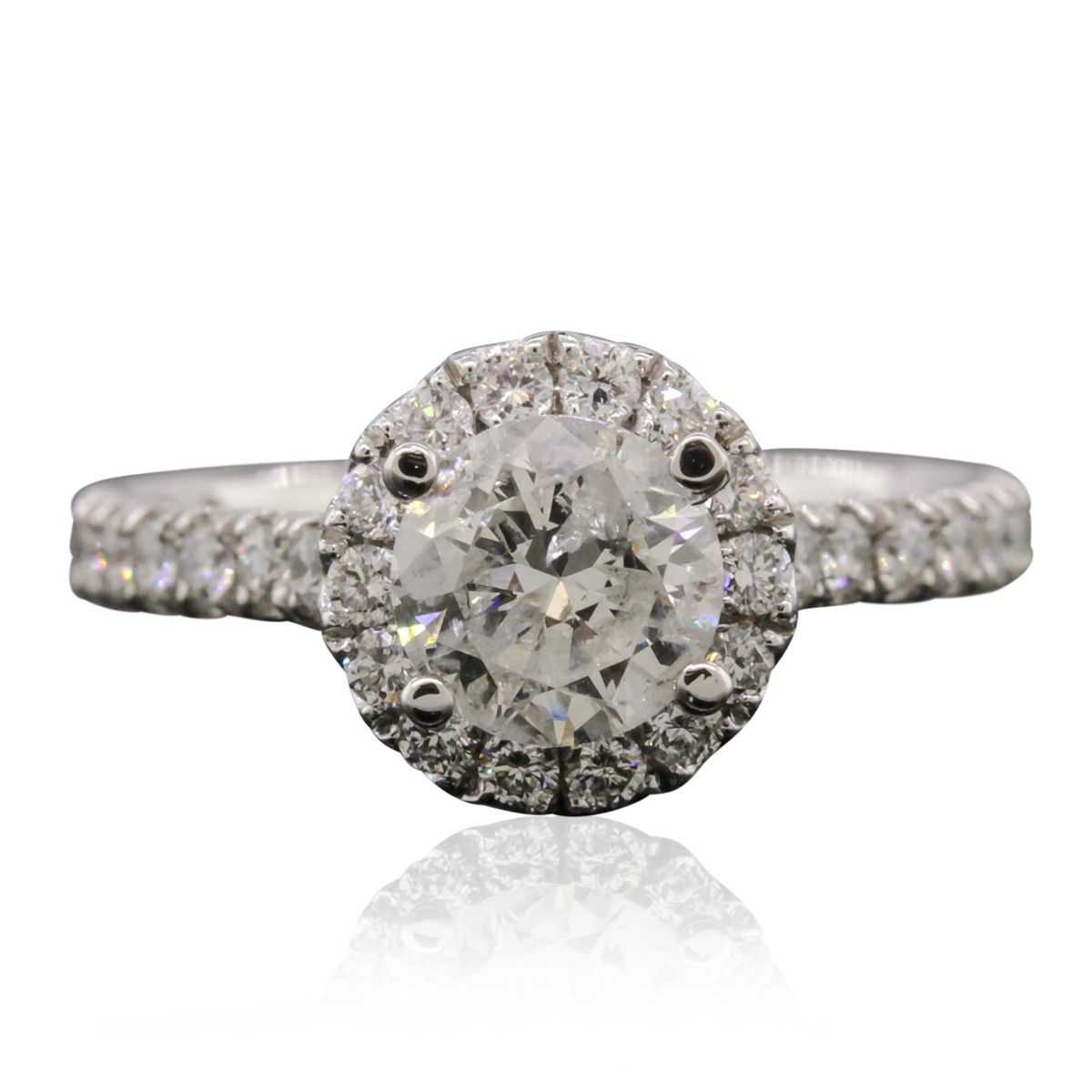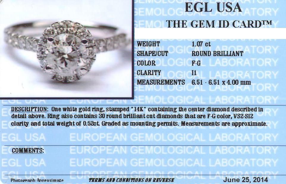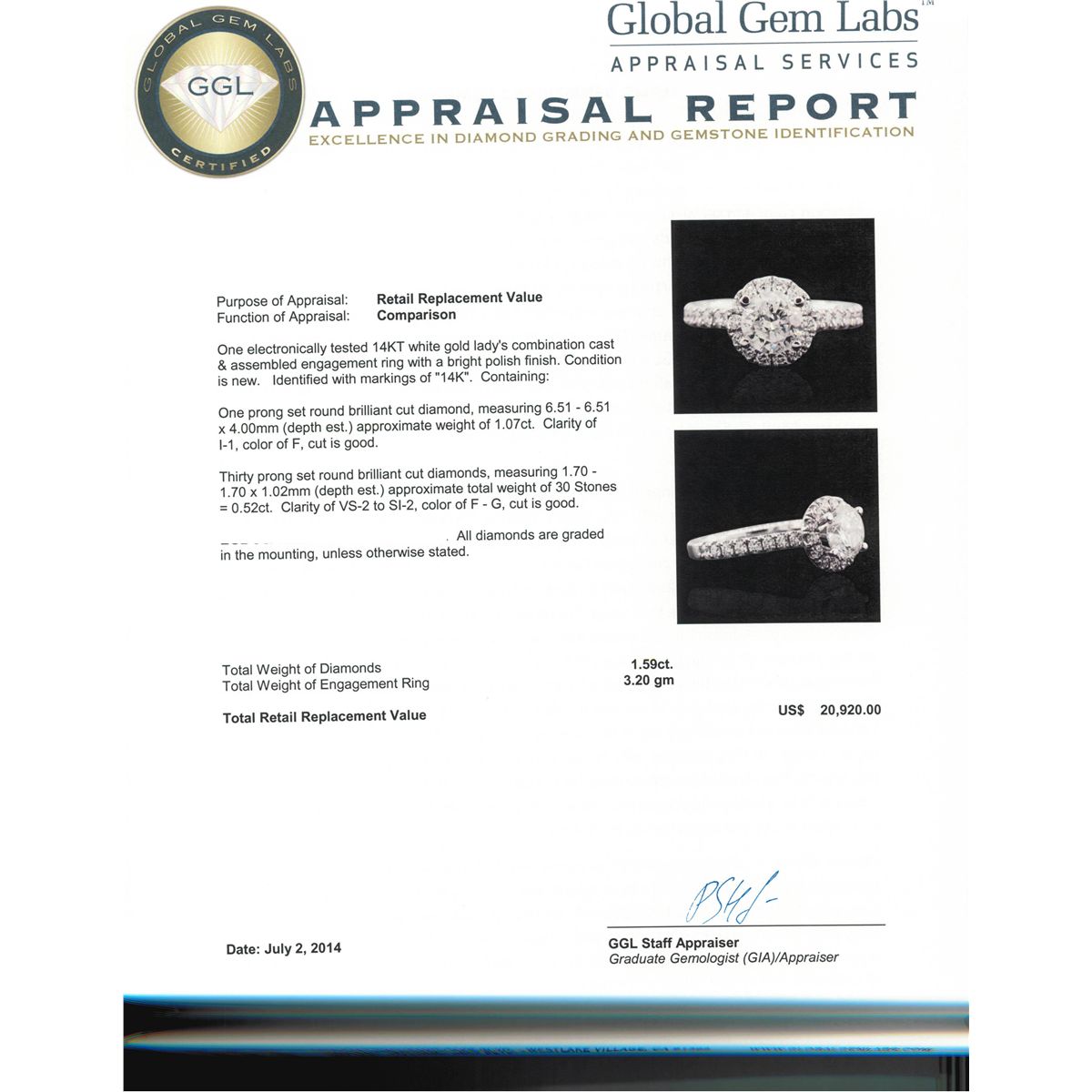 One electronically tested 14KT white gold Ladies combination cast & assembled engagement ring with a bright polish finish. Condition is new. Identified with markings of "14K". Containing: One prong set round brilliant cut diamond, measuring 6.51 - 6.51 x 4.00mm (depth est.) approximate weight of 1.07ct. Clarity: I-1. Color: F, Cut is Good. Thirty prong set round brilliant cut diamonds, measuring 1.70 - 1.70 x 1.02mm (depth est.) approximate. Total Weight of 30 Stones = 0.52ct. Clarity: VS-2 to SI-2. Color: F - G, Cut is Good. EGL USA GEM ID# US 911348412D. All diamonds are graded in the mounting, unless otherwise stated. Total Weight of Diamonds 1.59ct. Total Weight of Engagement Ring 3.20 grams. GGL Appraised at $20,920.00.