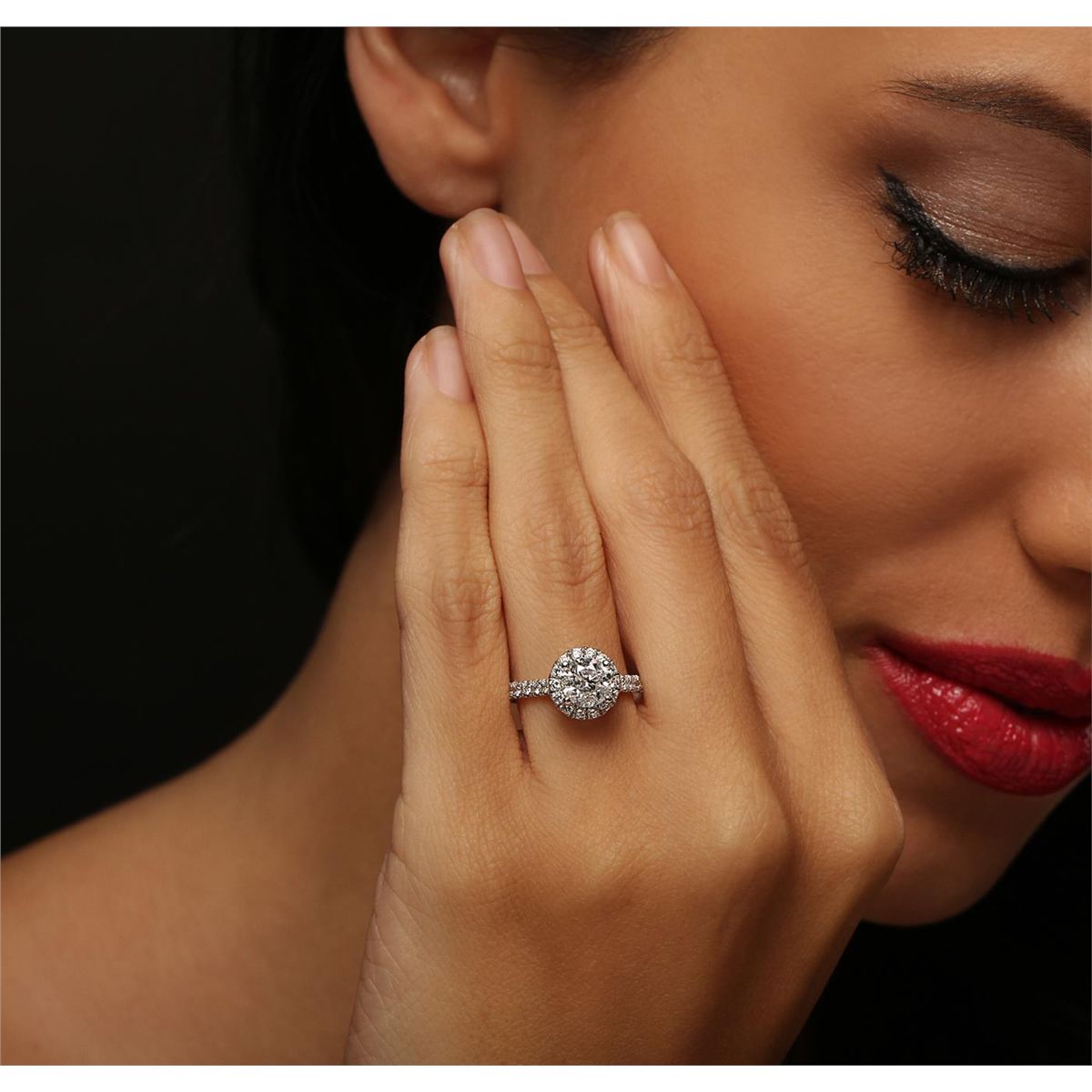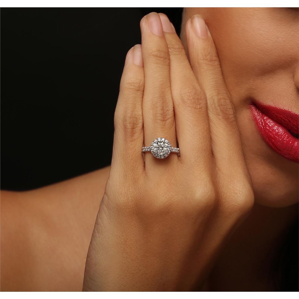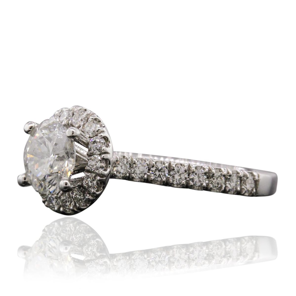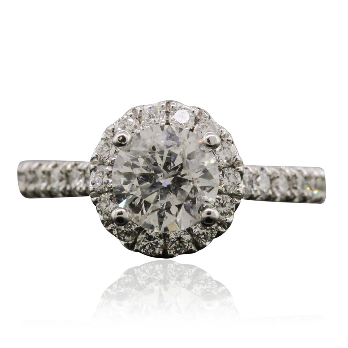 One electronically tested 14KT white gold Ladies combination cast & assembled engagement ring with a bright polish finish. Condition is new. Identified with markings of "14K". Containing: One prong set round brilliant cut diamond, measuring 6.51 - 6.50 x 4.00mm (depth est.) approximate weight of 1.07ct. Clarity: I-1. Color: F, Cut is Good. Thirty prong set round brilliant cut diamonds, measuring 1.70 - 1.70 x 1.02mm (depth est.) approximate. Total Weight of 30 Stones = 0.52ct. Clarity: VS-2 to SI-2. Color: F - G, Cut is Good. EGL USA GEM ID# US 911348410D. All diamonds are graded in the mounting, unless otherwise stated. Total Weight of Diamonds 1.59ct. Total Weight of Engagement Ring 3.30 grams. GGL Appraised at $20,785.00.