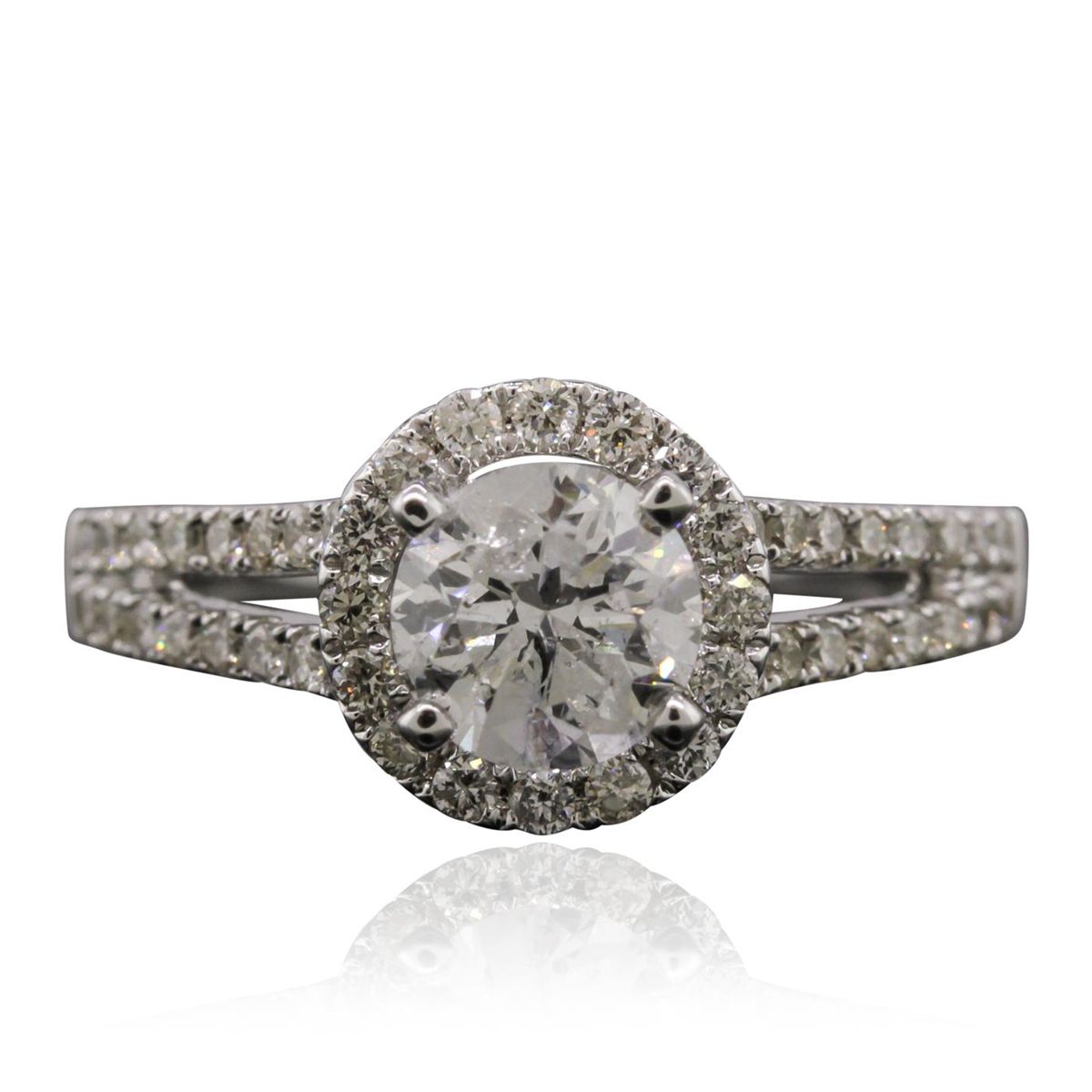One electronically tested 14KT white gold Ladies combination cast & assembled engagement ring with a bright polish finish. Condition is new. Identified with markings of "14K". Containing: One prong set round brilliant cut diamond, measuring 6.17 - 6.13 x 4.20mm (depth est.) approximate weight of 1.05ct. Clarity: I-1. Color: E, Cut is Good. Sixty prong set round brilliant cut diamonds, measuring 1.30 - 1.30 x 0.78mm (depth est.) approximate. Total Weight of 60 Stones = 0.54ct. Clarity: SI-2 to SI-3. Color: G - H, Cut is Good. EGL USA GEM ID# US 911348401D. All diamonds are graded in the mounting, unless otherwise stated. Total Weight of Diamonds 1.59ct. Total Weight of Engagement Ring 4.20 grams. GGL Appraised at $21,550.00.
