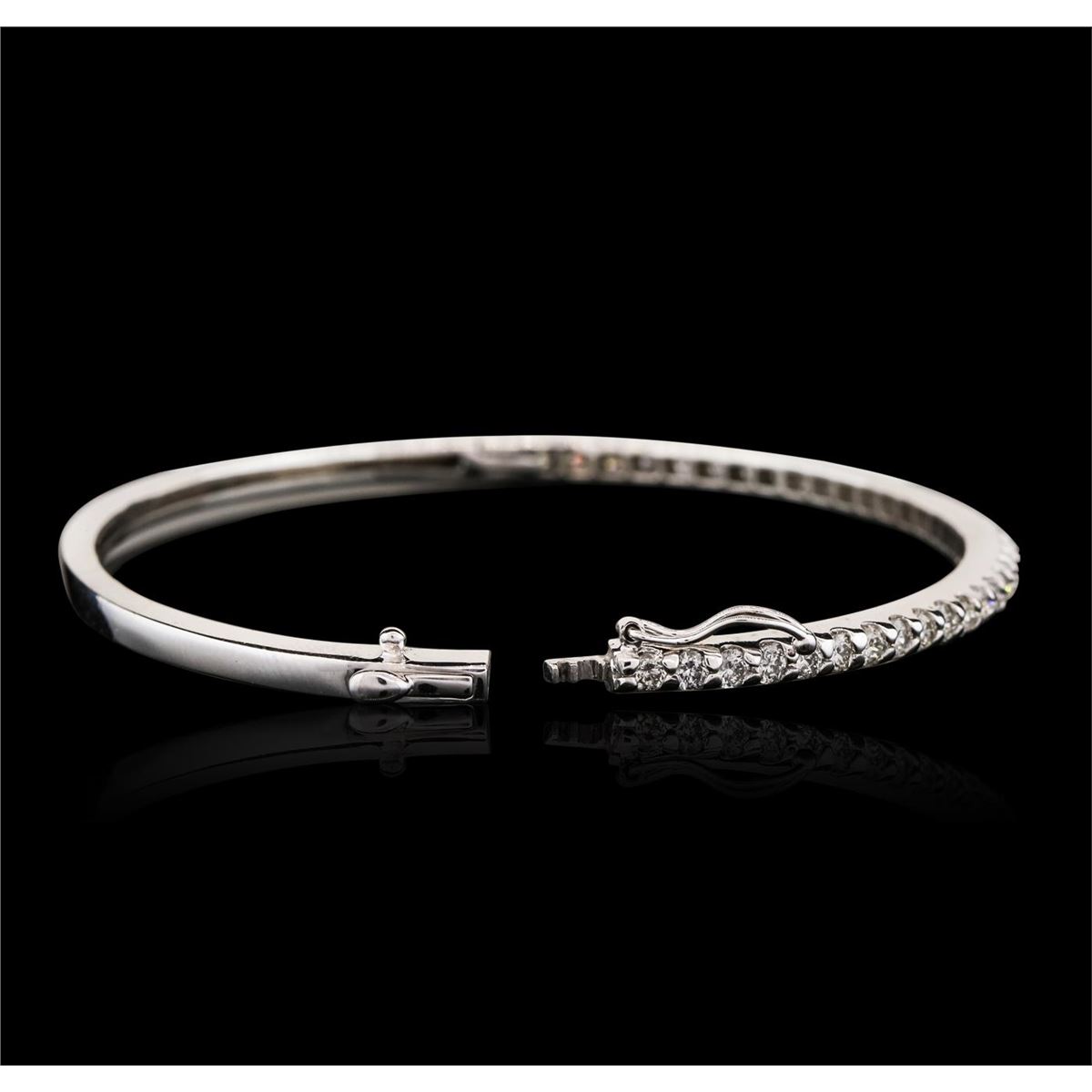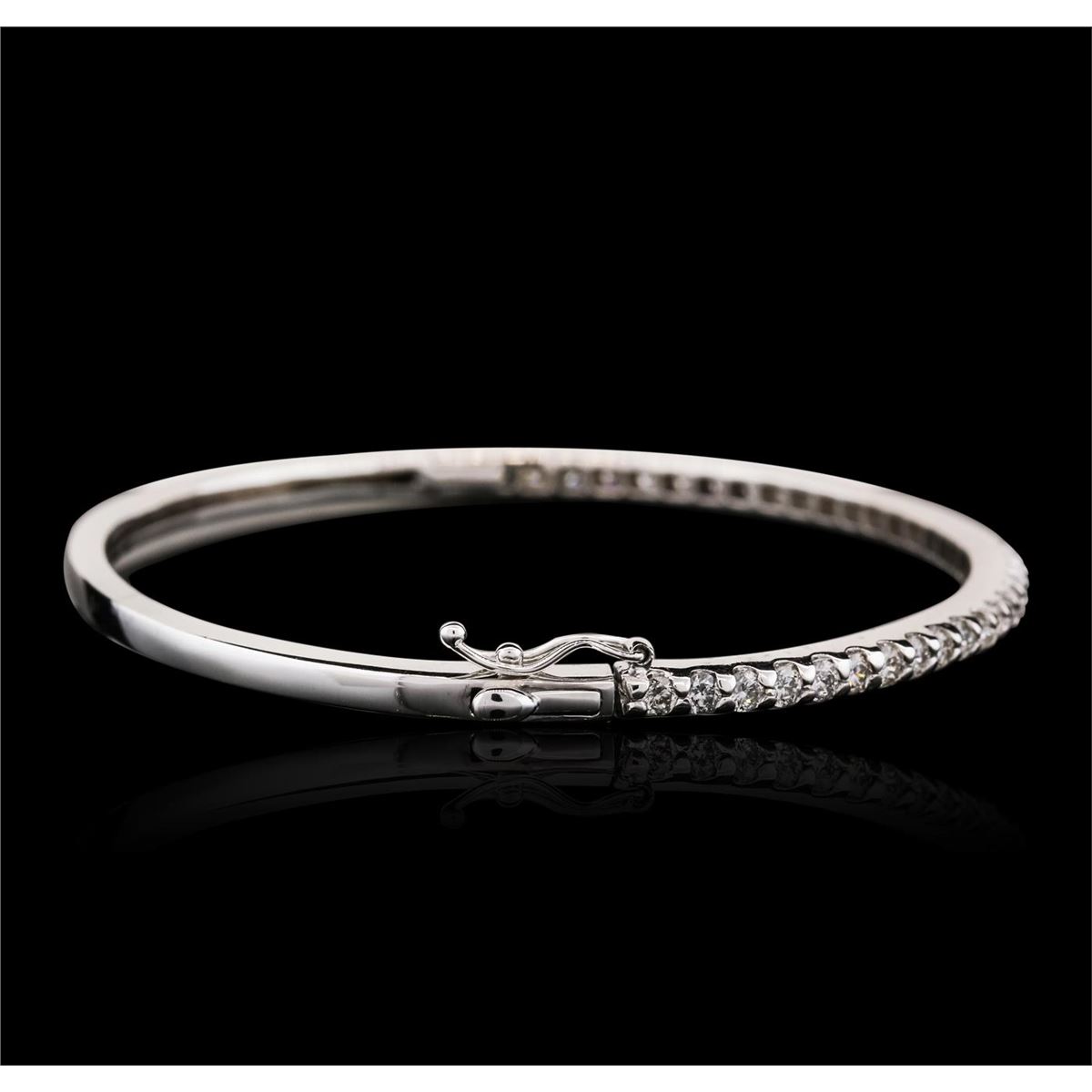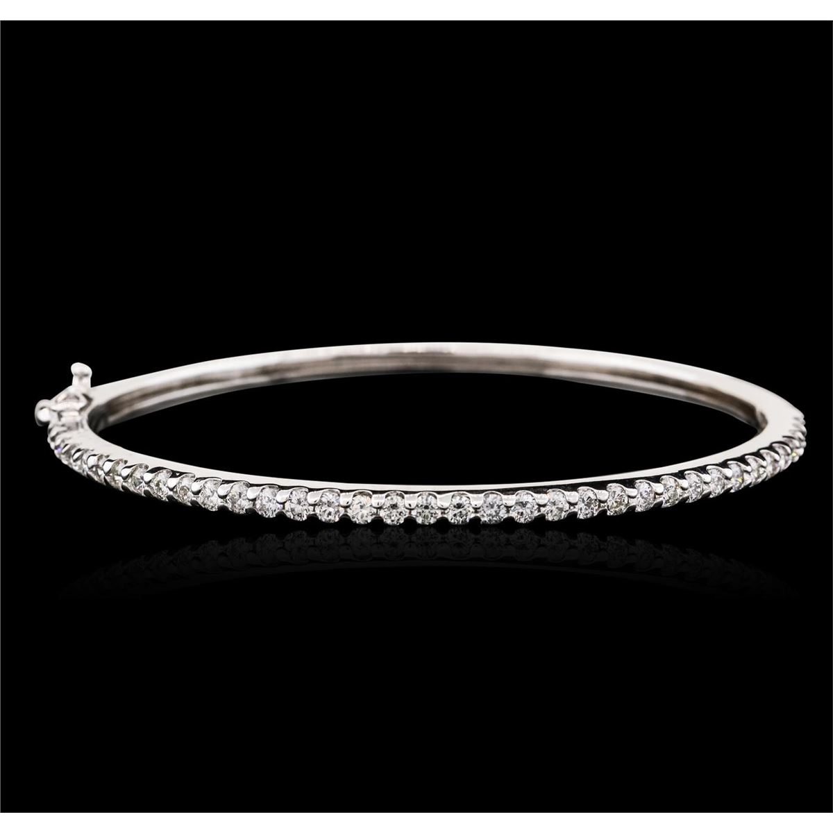 One electronically tested 14KT white gold ladies combination cast & assembled bangle bracelet with a hidden box clasp with safety closer with a bright polish finish. Measurements: 2.50 x 2.00. Condition is new. Containing: Thirty-Six prong set round brilliant cut diamonds, measuring 2.30 - 2.30 x 1.38mm (depth est.) approximate total weight of 36 Stones = 1.60ct. Clarity: SI-2 to I-1. Color: J - K, Cut is Good. All diamonds are graded in the mounting, unless otherwise stated. Total Weight of Diamonds 1.60ct. Total Weight of Bracelet 12.60 grams. GGL Appraised at $6,000.00.