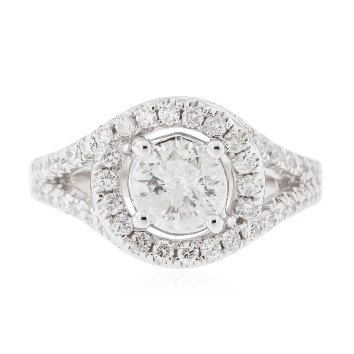 One electronically tested 14KT white gold ladies cast diamond engagement ring with a bright polish finish. Identified with markings of "14K". Condition is new. Containing: One prong set round brilliant cut diamond, measuring 6.50 - 6.40 x 3.30mm (depth est.) approximate weight of 0.84ct. Clarity: I-3. Color: J. Sixty-Two prong set round brilliant cut diamonds, measuring 1.50 - 1.50 x 0.90mm (depth est.) approximate total weight of 62 Stones = 0.76ct. Clarity: SI-2 to I-2. Color: H - I. All diamonds are graded in the mounting, unless otherwise stated. Total Weight of Diamonds 1.60ct. Total Weight of Engagement Ring 6.60 grams. GGL Appraised at $6,240.00.