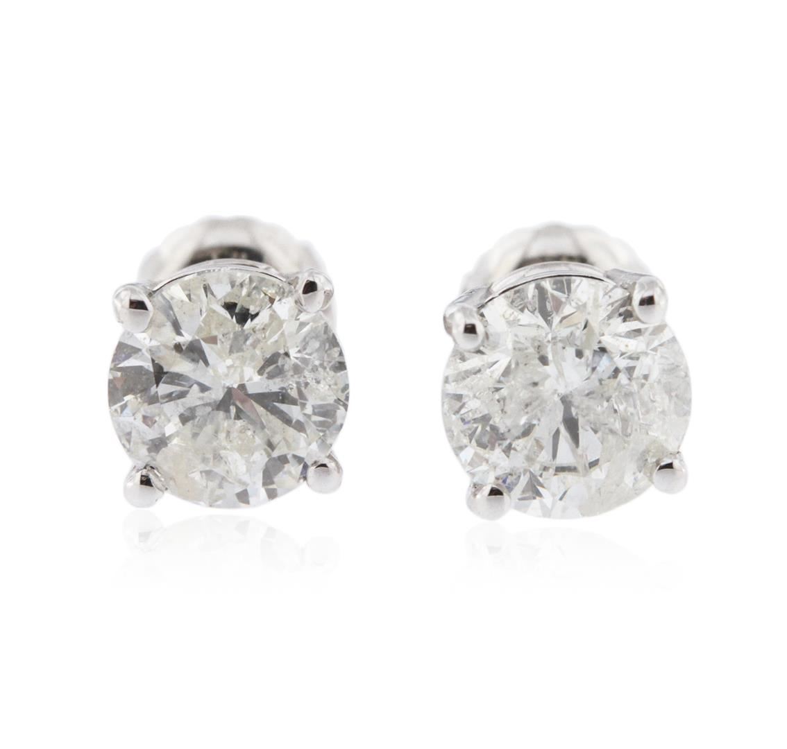 One pair electronically tested 14KT white gold ladies cast diamond stud earrings with French screw backs with a bright polish finish. Condition is new. Containing: One prong set round brilliant cut diamond, measuring 5.95 - 5.94 x 3.58mm (depth est.) approximate weight of 0.77ct. Clarity: I-3. Color: J, Cut is Good. One prong set round brilliant cut diamond, measuring 6.07 - 6.13 x 3.66mm (depth est.) approximate weight of 0.83ct. Clarity: I-3. Color: J, Cut is Good. All diamonds are graded in the mounting, unless otherwise stated. Total Weight of Diamonds 1.60ct. Total Weight of Stud Earrings 1.30 grams. GGL Appraised at $3,750.00.