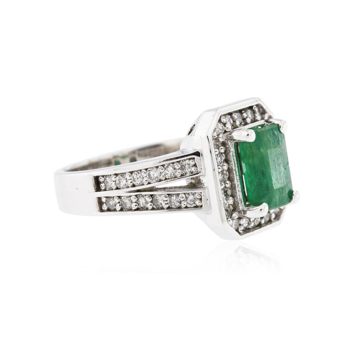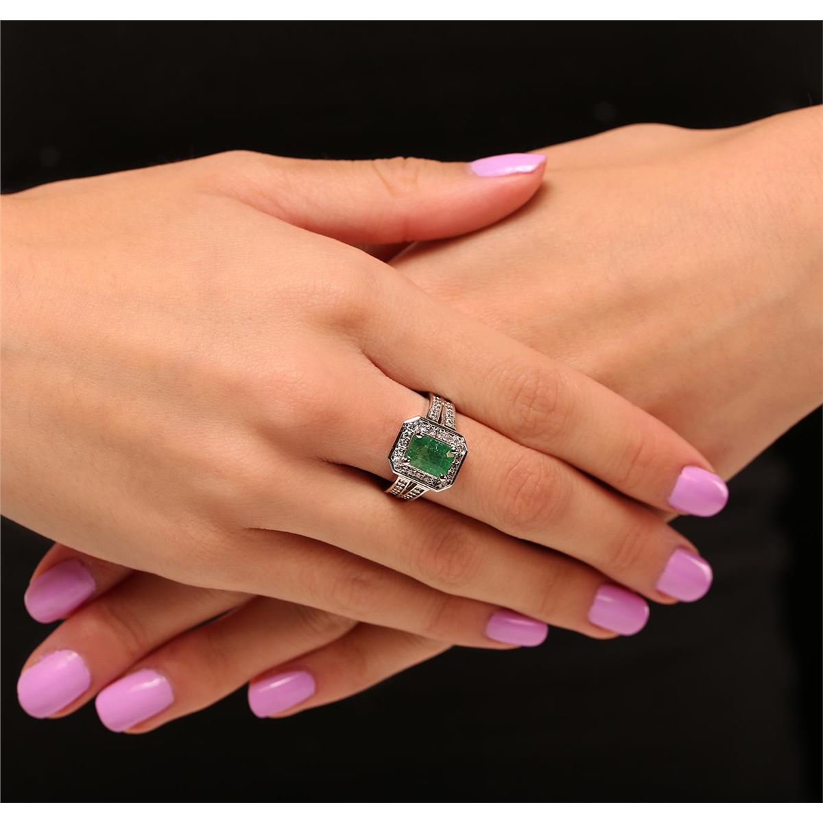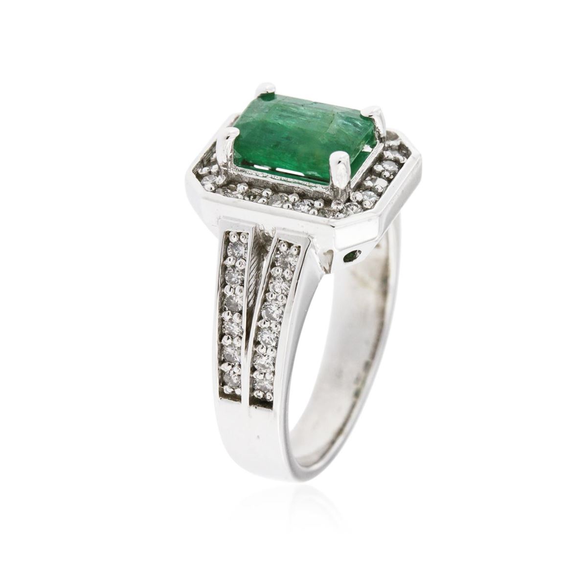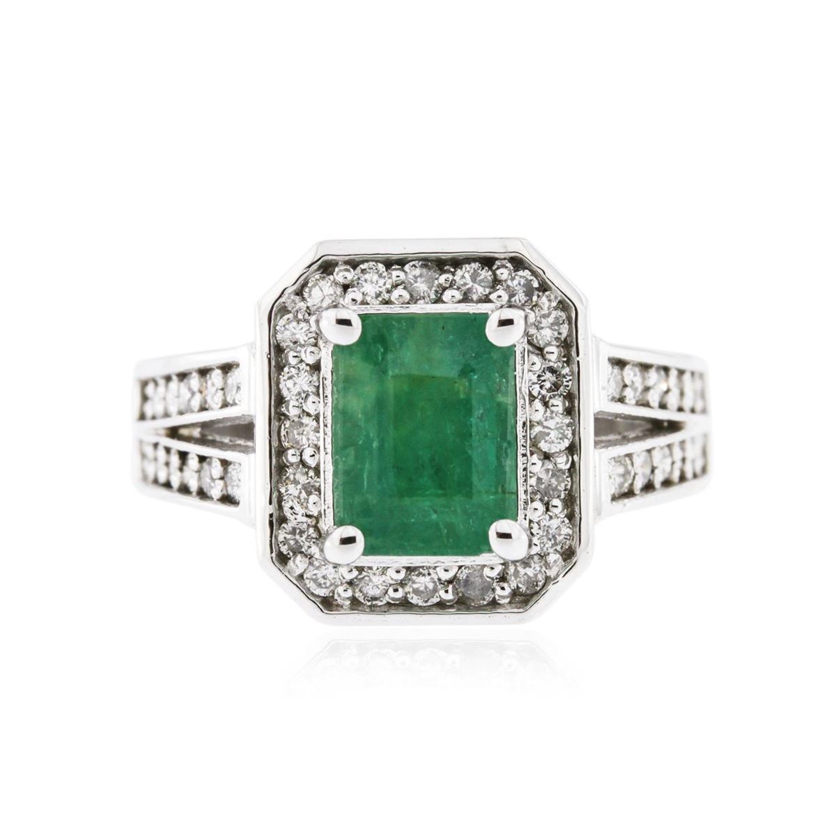 One electronically tested 14KT White Gold ladies cast emerald and diamond ring with a bright polish finish. Condition is new, good workmanship. The featured emerald is set within a diamond bezels supported by diamond set split shoulders, completed by a three and one-half millimeter wide band. Identified with markings of "14K". Containing: One prong set rectangular step cut natural emerald, measuring 7.95 x 5.75 x 3.98mm, 8%. bulge factor, approximate weight of 1.60ct., clarity is heavily included, type III, medium, very slightly grayish, very slightly bluish green color, (GIA vslbG 5/3), cut is Good. Transmitting light with a minimum of distortion, transparent. Naturally occurring internal & external characteristics are present. Indications of oil residue. Graded in the setting. Forty-Four prong set round brilliant cut diamonds, measuring 1.70 - 1.50 x 0.96mm (depth est.) approximate total weight of 44 Stones = 0.75ct. Graded in the setting. Clarity: SI-1 to I-1. Color: H - J. Total Weight of Colored Stones 1.60ct. Total Weight of Diamonds 0.75ct. Total Weight of Ring 7.61 grams. AIG Appraised at $5,075.00.
